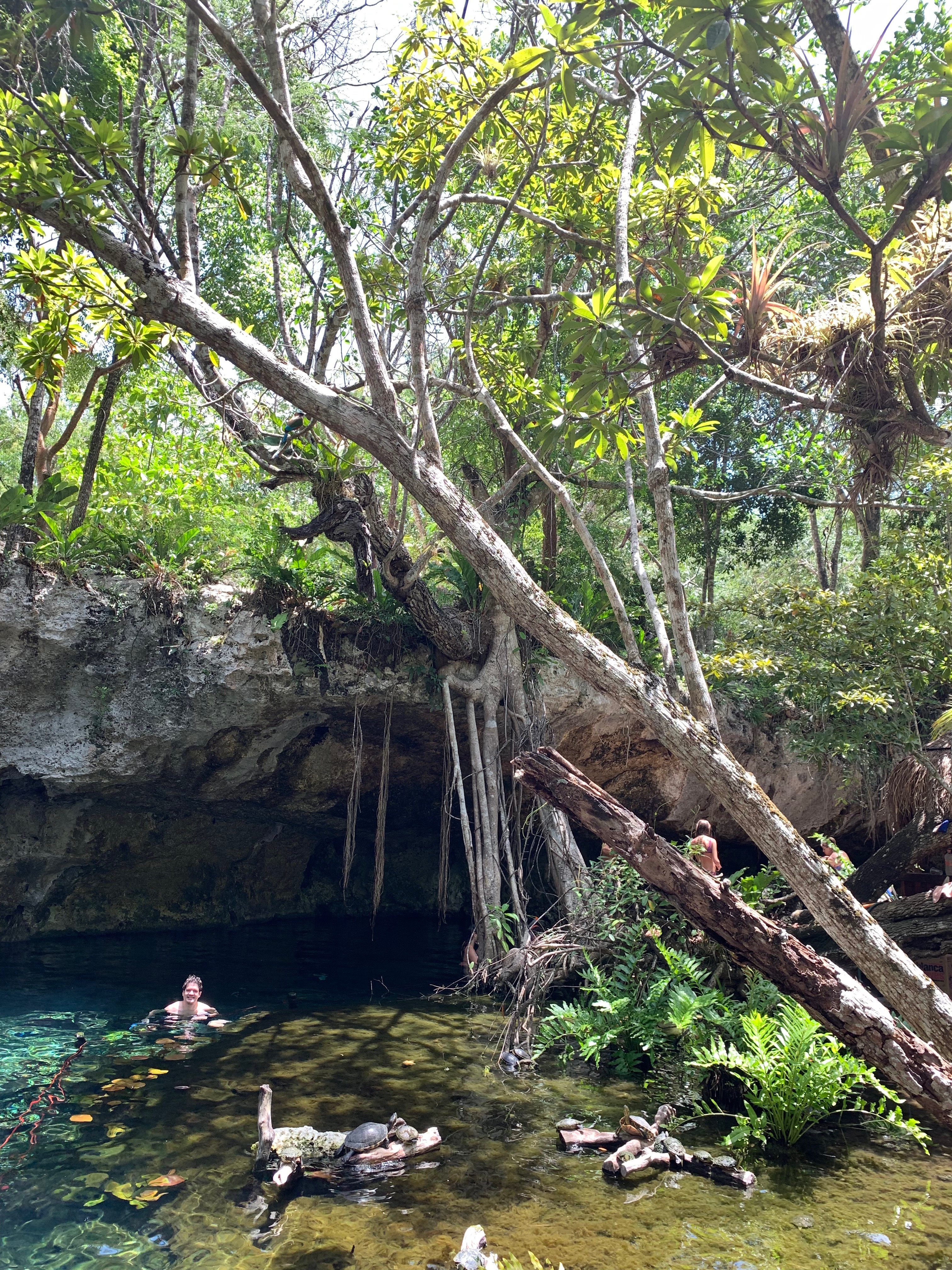 No segundo dia, fomos conhecer os Cenotes da região. Visitamos o Gran Cenote e o dos Ojos. A cor da água impressiona, lindíssima. O Gran Cenote fica bem próximo a Tulum (bom pra quem não tem muito tempo), mas por outro lado, fica sempre mais cheio. O cenote dos Ojos já é um pouco mais afastado e também maior, por isso fica mais tranquilo. É recomendado fazer a visita mais no início da tarde, quando a luz incide bem sobre a água.