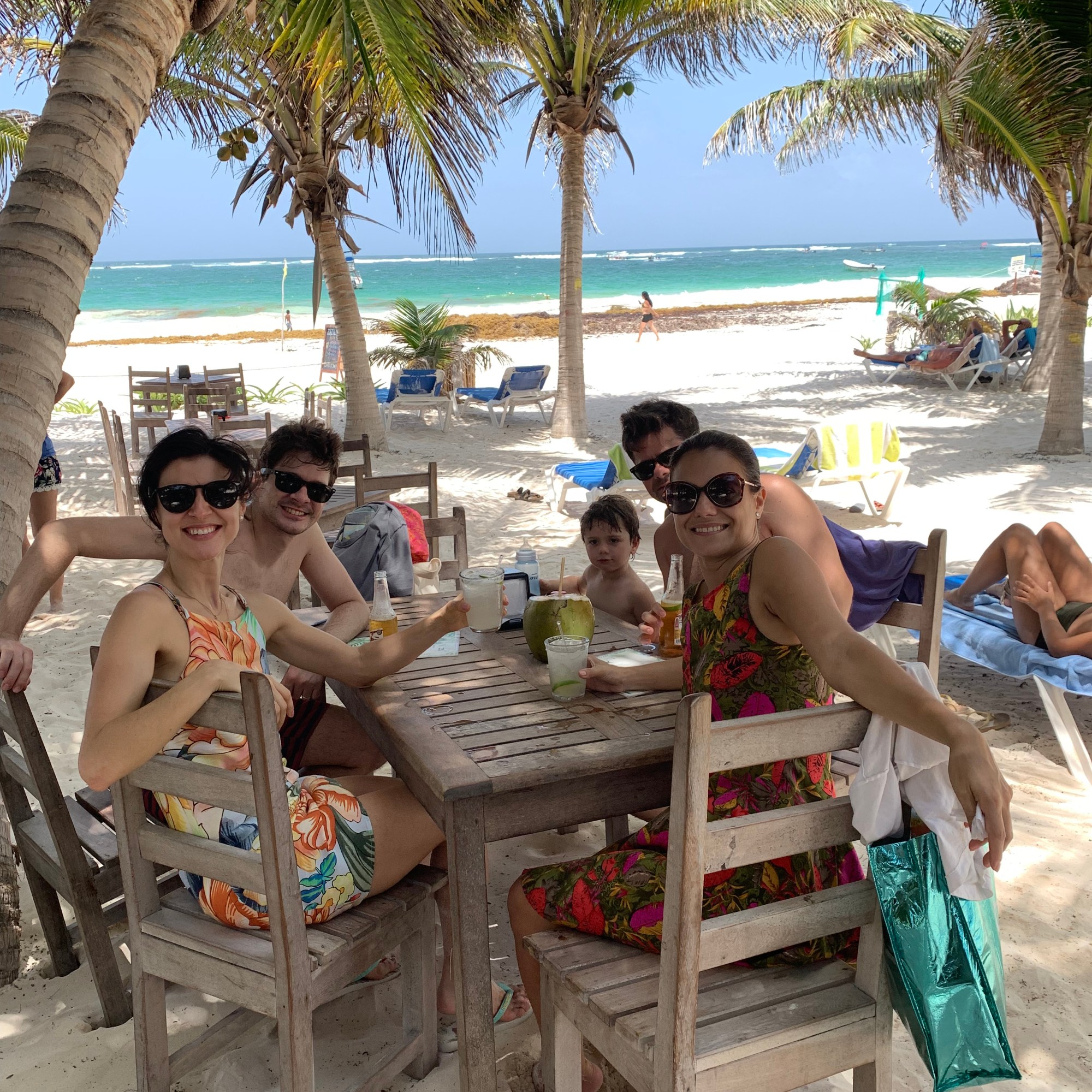 As semanas que antecederam a viagem foram de muita correria no Brasil. Esvaziar apartamento, despedidas em Santa Catarina e São Paulo, médicos, arrumar as malas… Depois de um dia inteiro entre voos e aeroportos, tudo o que queríamos nesse começo de viagem era um dia de folga, ainda mais pelo Caribe! Uma amiga do trabalho (Gabi aqui) estava em Tulum com a família, então fomos encontrá-los na praia do hotel onde eles estavam e por lá ficamos até o fim da tarde. Era o que precisávamos: um dia tranquilo, sem se preocupar com programação, só curtindo um dia de praia… com os amigos então, melhor ainda!!!