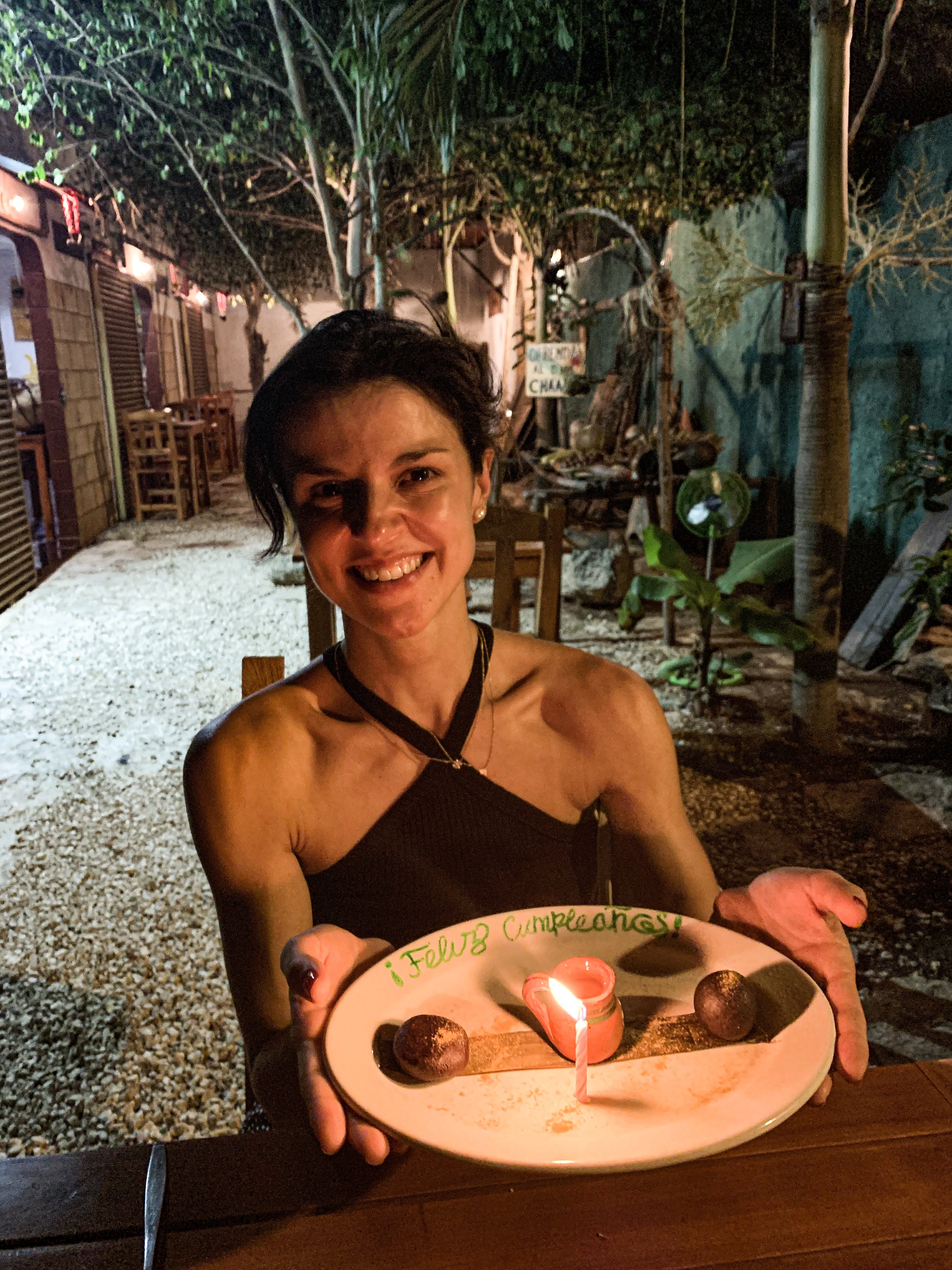 Pra fechar o dia e seguindo com as descobertas sobre o mundo dos maias, teve jantar de aniversário inspirado na culinária desse povo. Com os 31 devidamente comemorados, fechamos o México em grande estilo e partimos pro próximo destino!