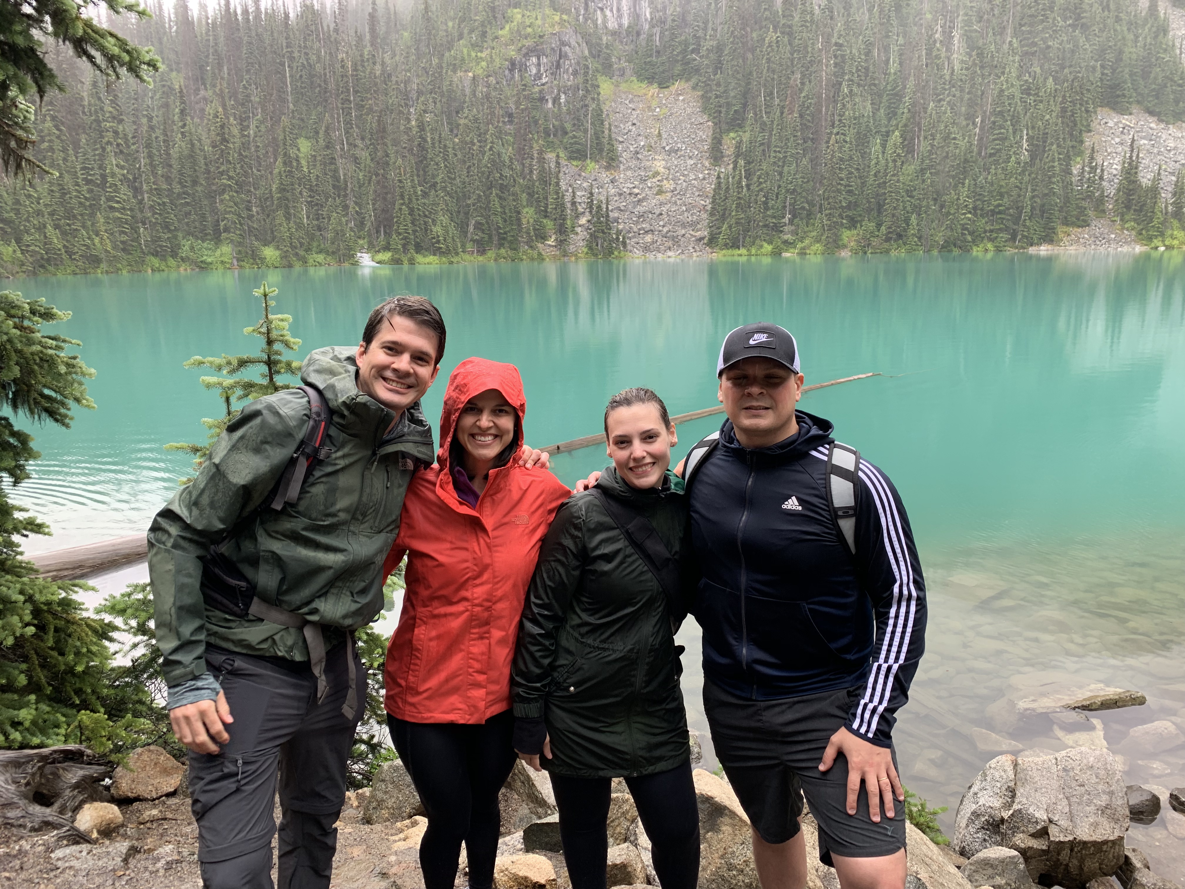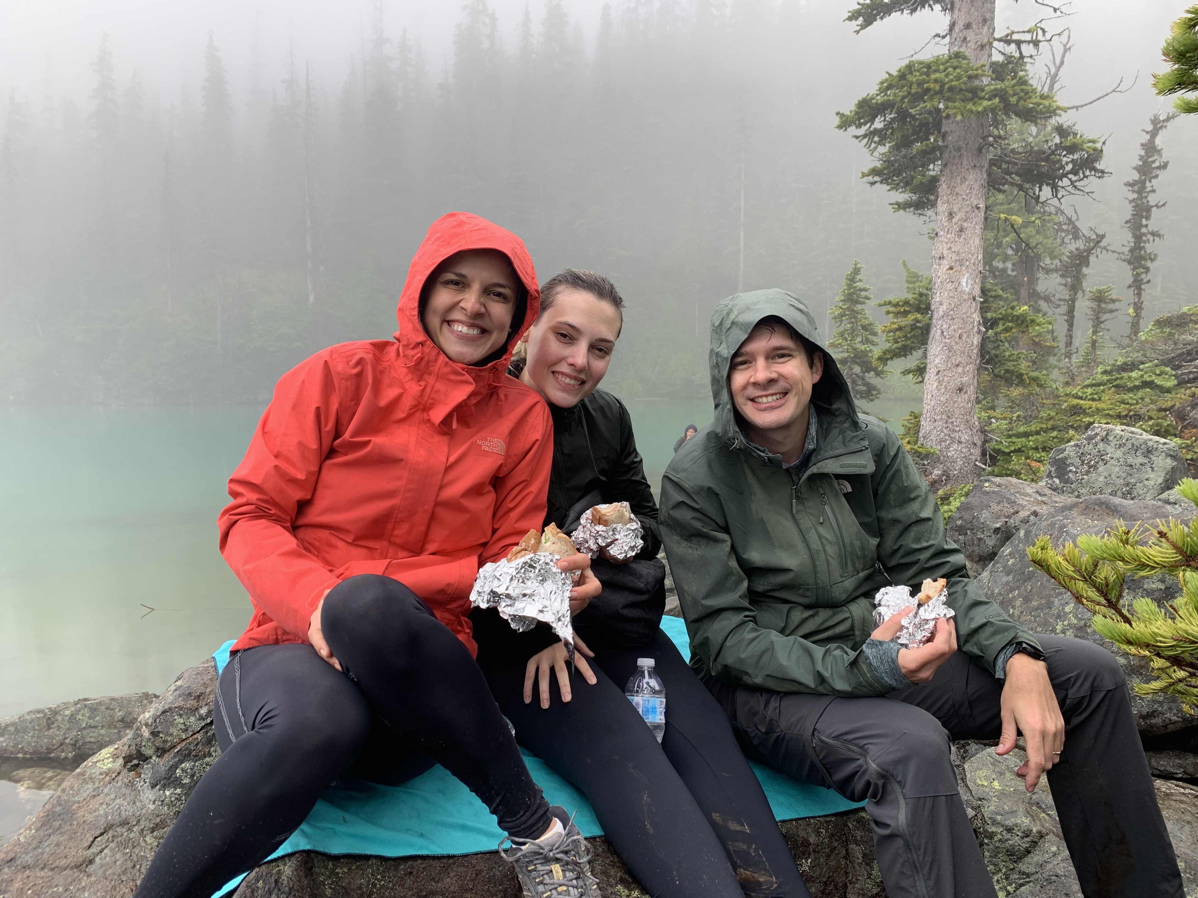 A trilha, de uns 4km (só ida), passa por três lagos lindos. Mesmo com o tempo fechado a cor da água impressiona. Vale muito o passeio! Quando chegamos no final da trilha, aproveitamos a vista e fizemos nosso almoço à beira do lago! Reabastecidos, pegamos a trilha para voltar ao estacionamento e dirigimos mais uma hora até Whistler.