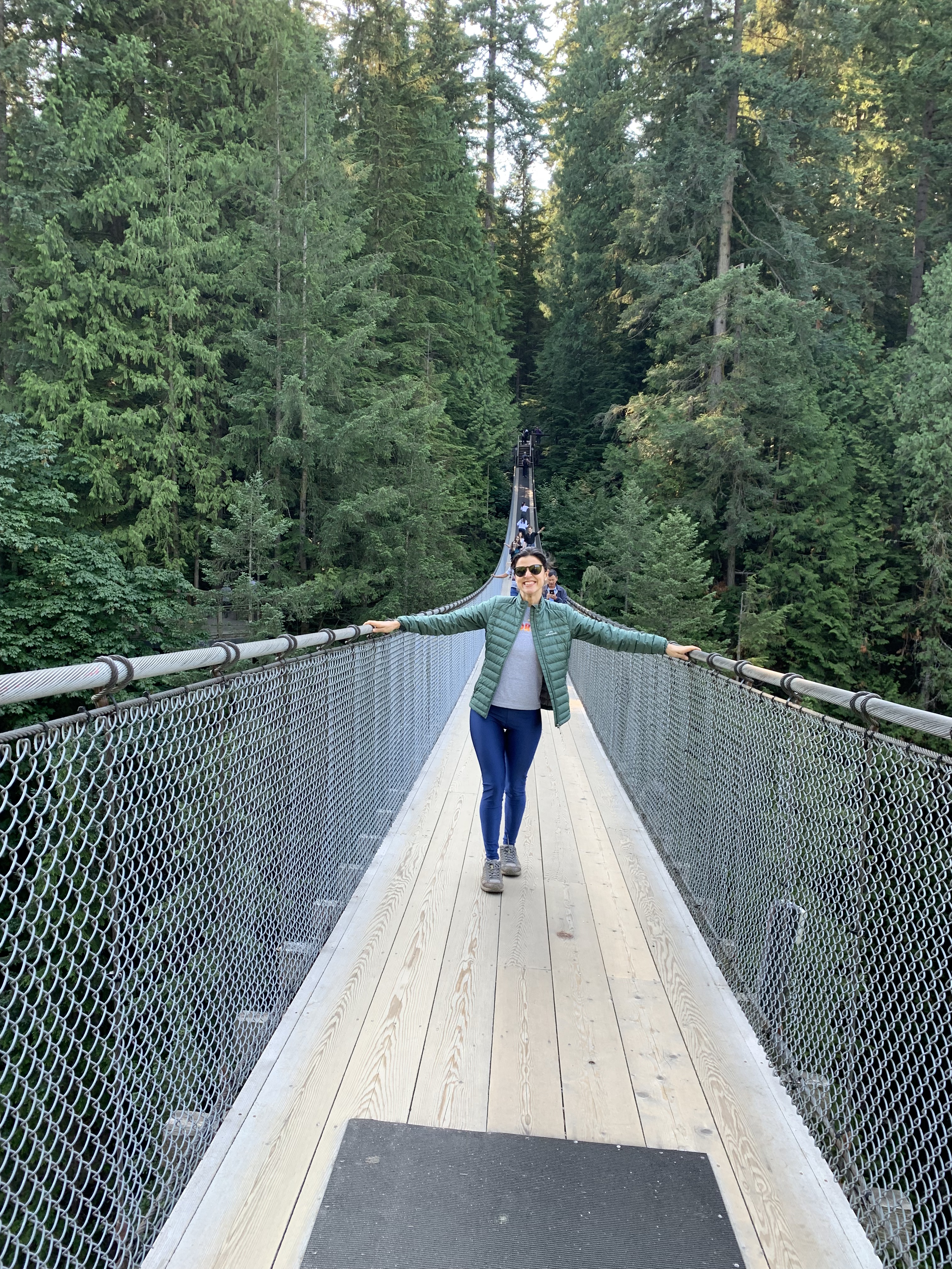 Aproveitamos o passeio em North Vancouver e fomos conhecer o Capilano Bridge Suspension Park. O parque abriga uma ponte suspensa de 140 metros de comprimento e 70 metros acima do rio. Além disso, o parque abriga árvores gigantes e centenárias, a mais antiga é a “Grandma Capilano” de 1300 anos e com 76 metros de altura!!!