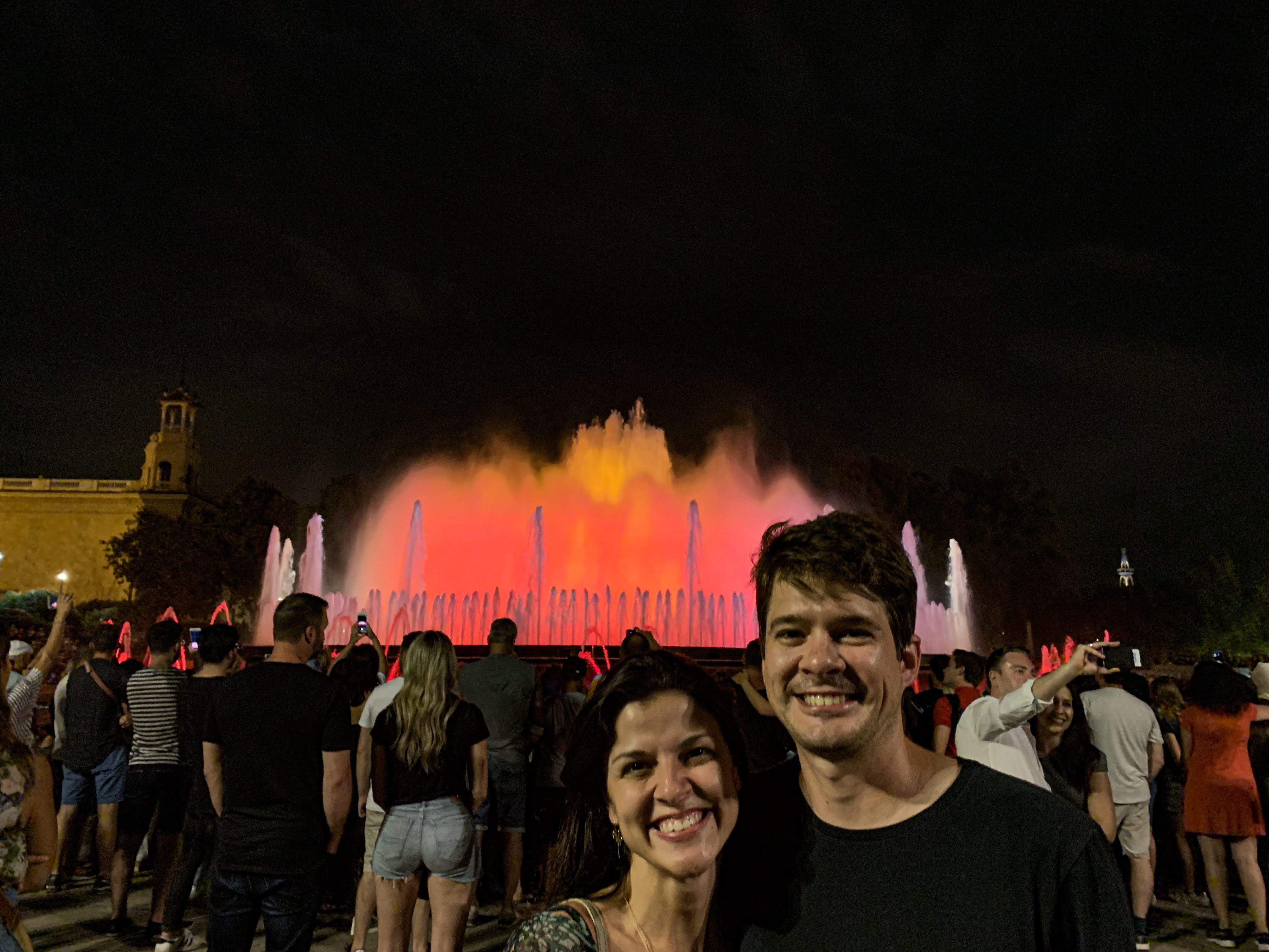 À noite, fomos ver o show de águas e luzes da Fonte Mágica que é lindo! Quando for a Barcelona, é preciso conferir os dias e horários que o espetáculo acontece, pois varia no decorrer do ano.