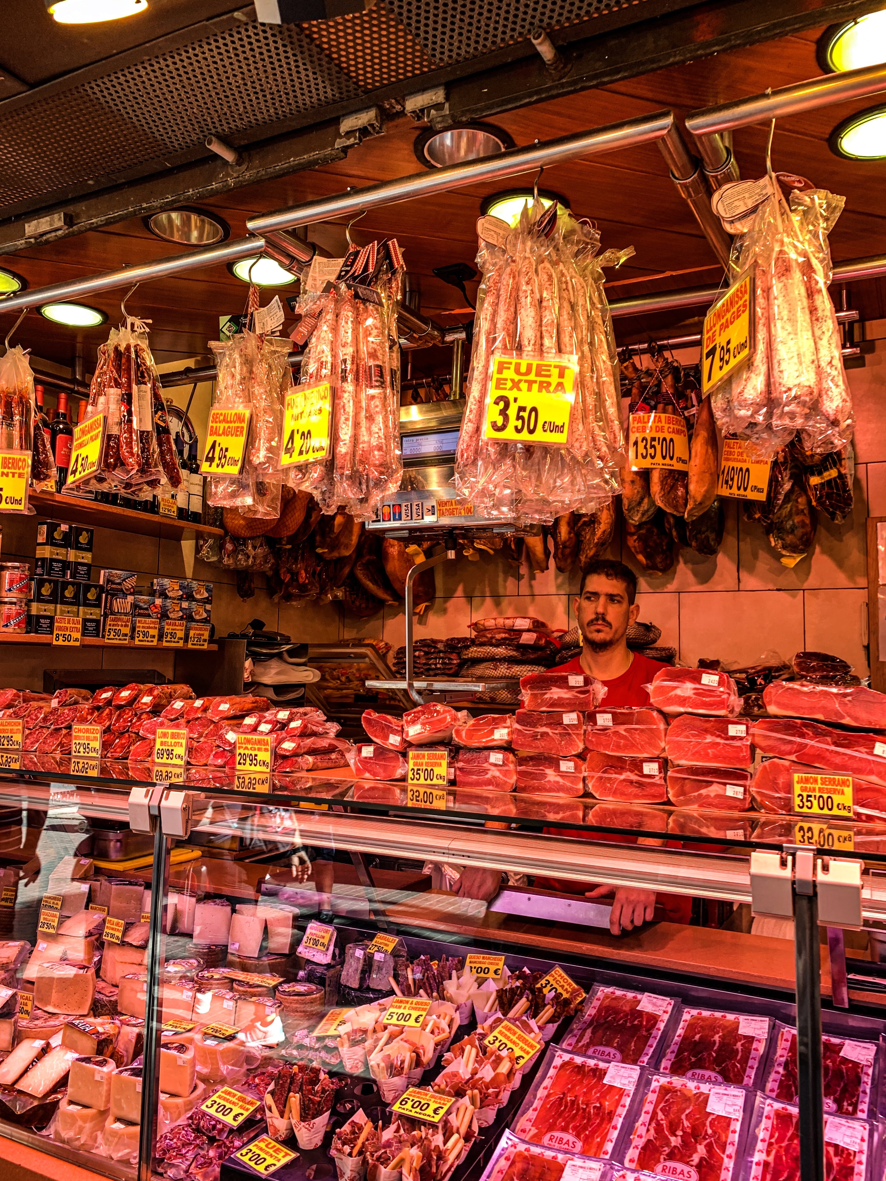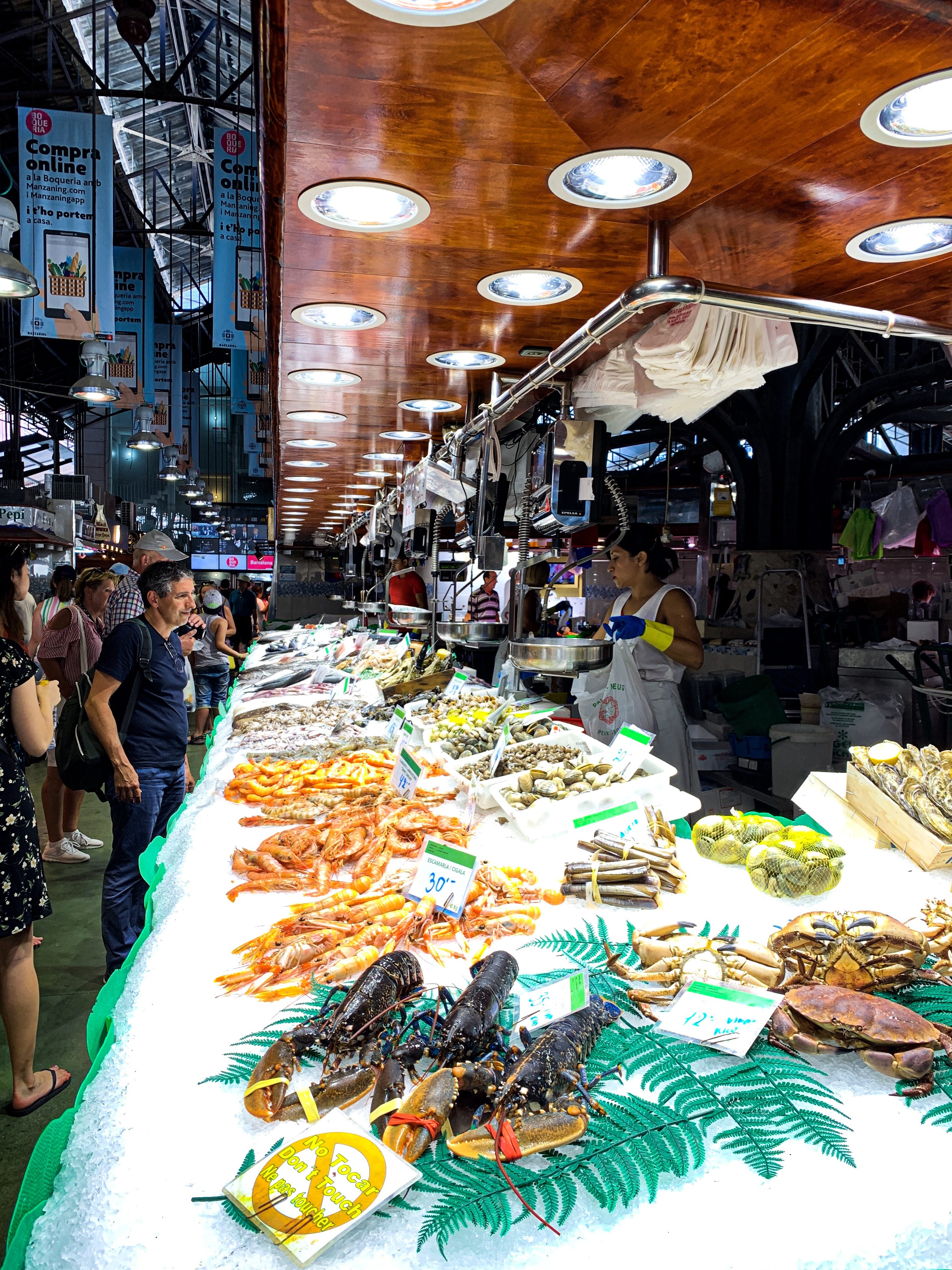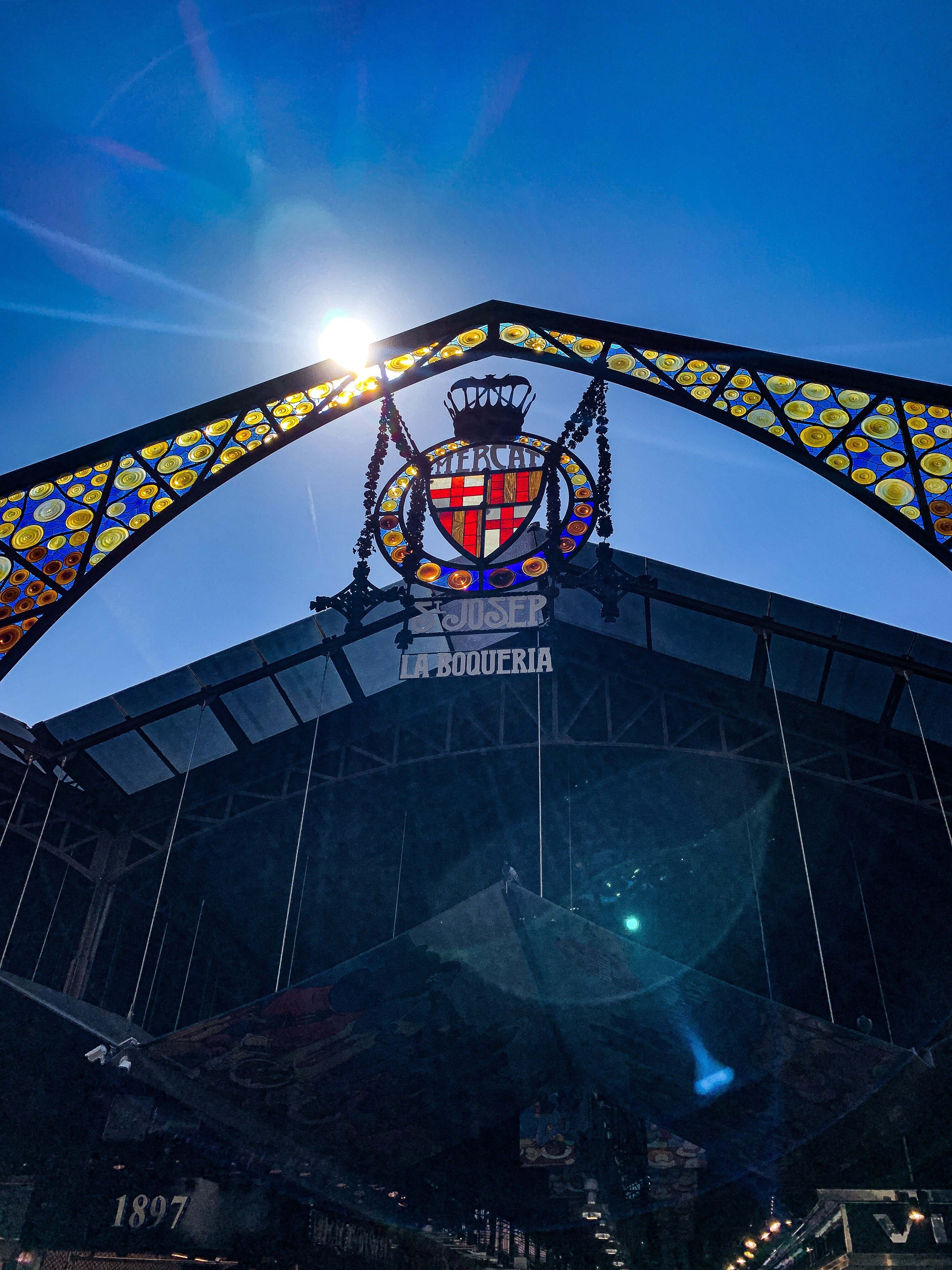 Depois do tour seguimos em direção a “La Rambla”, o famoso calçadão de Barcelona. A caminhada por essa tradicional rua é uma delícia e lá está localizado um dos principais mercados de Barcelona, o La Boquería. Já passava das 14h e a fome estava apertando, então uma volta seguida de um almoço no mercado se encaixou perfeitamente na nossa programação. Teve pa amb tomàquet, gaspacho, huevos, jamón, papas bravas… uma delícia!!!