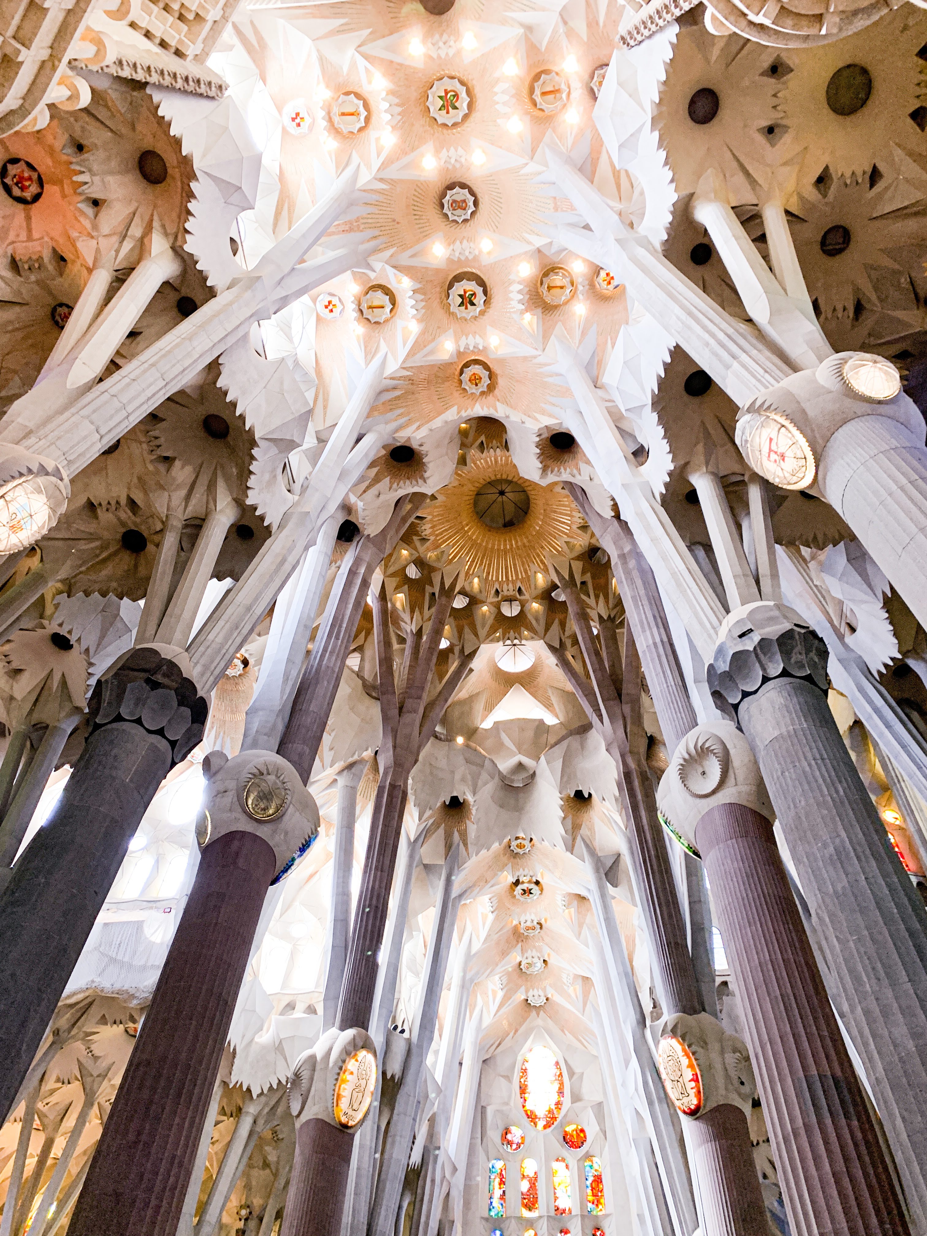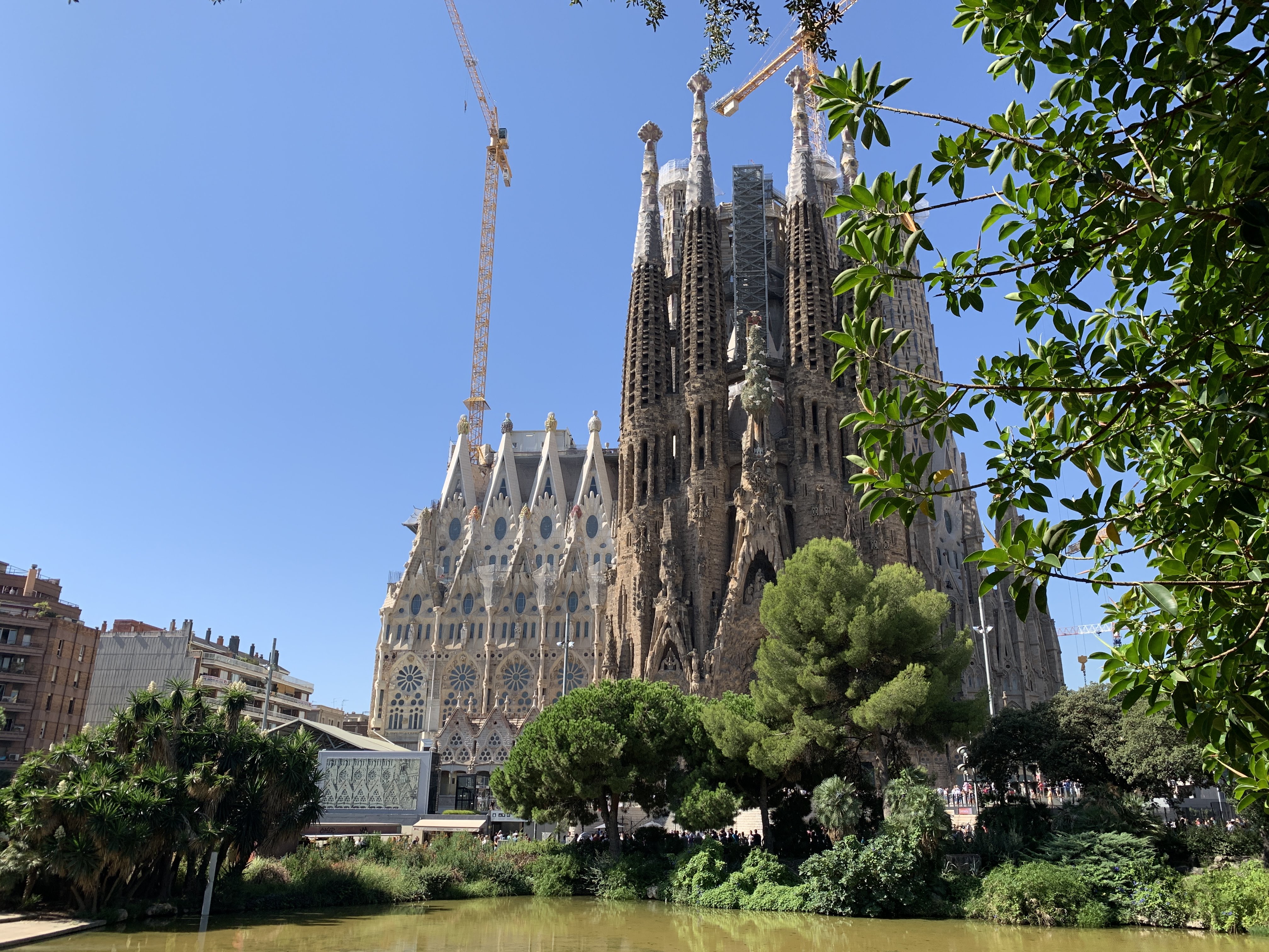 No dia seguinte, último dia em Barcelona, deixamos para entrar nas principais atrações. Pegamos as bicicletas que estão disponíveis para aluguel por toda a cidade e pedalamos até a Sagrada Família. Compramos o ingresso com áudio-guia porque era a única opção ainda disponível para venda. Apesar de não ter sido uma escolha espontânea, foi muito acertada! Essa grande obra de Gaudí tem tanta história e detalhe, que sem o guia teríamos perdido muita coisa. A visita pra gente também foi super especial porque entramos na Sagrada Família em 2008, quando a parte interna ainda estava tomada por andaimes. Dessa vez, ficamos muito mais impressionados ao entrar na igreja. Apesar de minimalista em termos de obras de arte (não há grandes esculturas ou pinturas internas), o que chama realmente atenção são os detalhes construtivos inspirados em elementos da natureza (ex.: colunas que lembram troncos de árvores e vitrais que destacam as luzes do nascer e pôr do sol). Entretanto, é mesmo a parte externa que mais impressiona, com suas 3 fachadas contando em detalhes as etapas marcantes da vida de Jesus: Nascimento, Paixão e da Glória (essa ainda em construção). Na época em que visitamos, a previsão de conclusão era 2021, mas a nova data passou a ser 2026, ano do centenário da morte de Gaudí. Vamos ter que voltar pra conferir… 😁