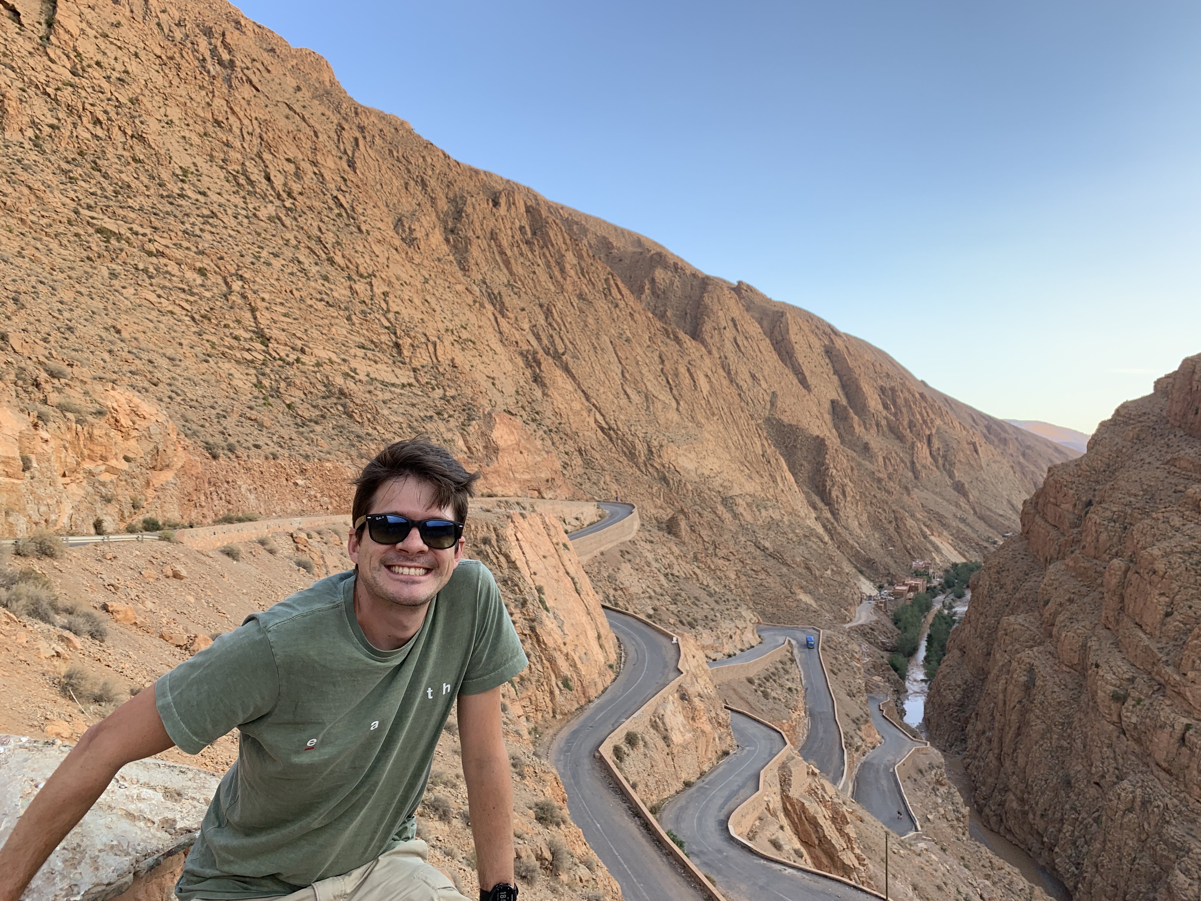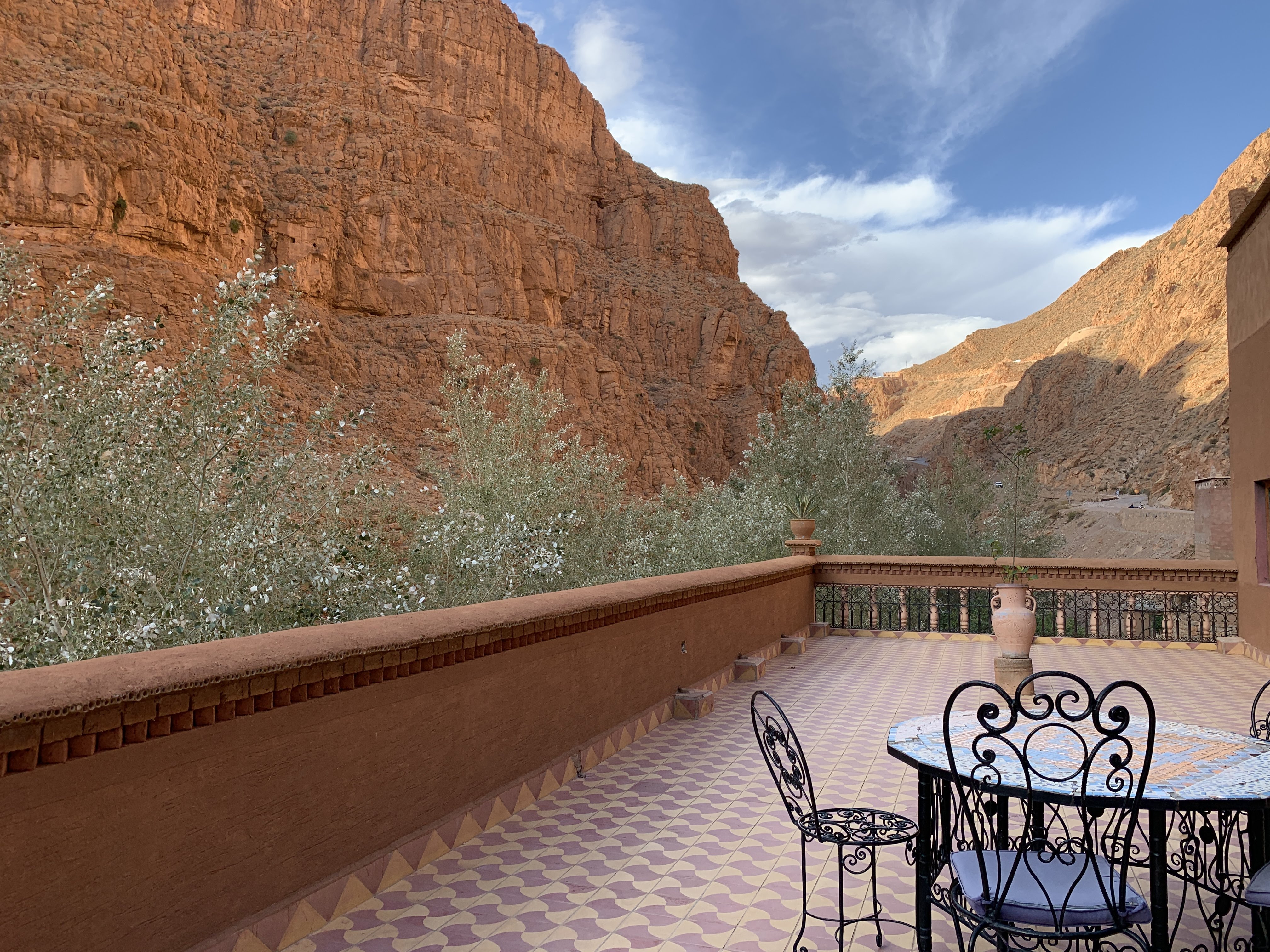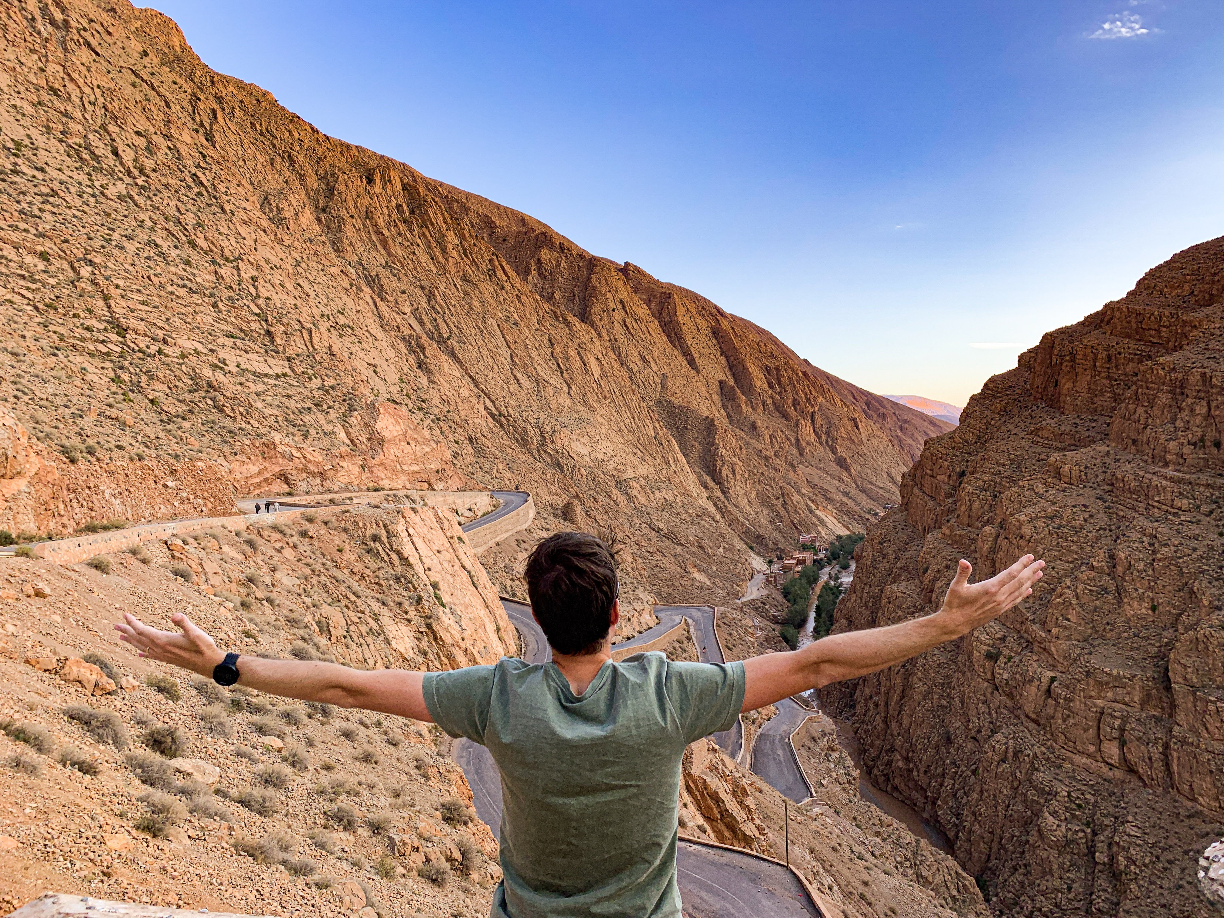 Por fim, uns 500 metros antes de chegarmos no hotel, tivemos que fazer uma parada forçada. Por conta da chuva de uns dias atrás, muita pedra tinha caído no caminho e a estrada estava fechada. Estacionamos por ali mesmo e seguimos a pé. Para fechar o dia, fizemos uma caminhada para ter a incrível vista do alto do Dades Gorges (ou Garganta de Dades), um grande desfiladeiro que possui uma sinuosa estrada conhecida como uma das mais perigosas do mundo.