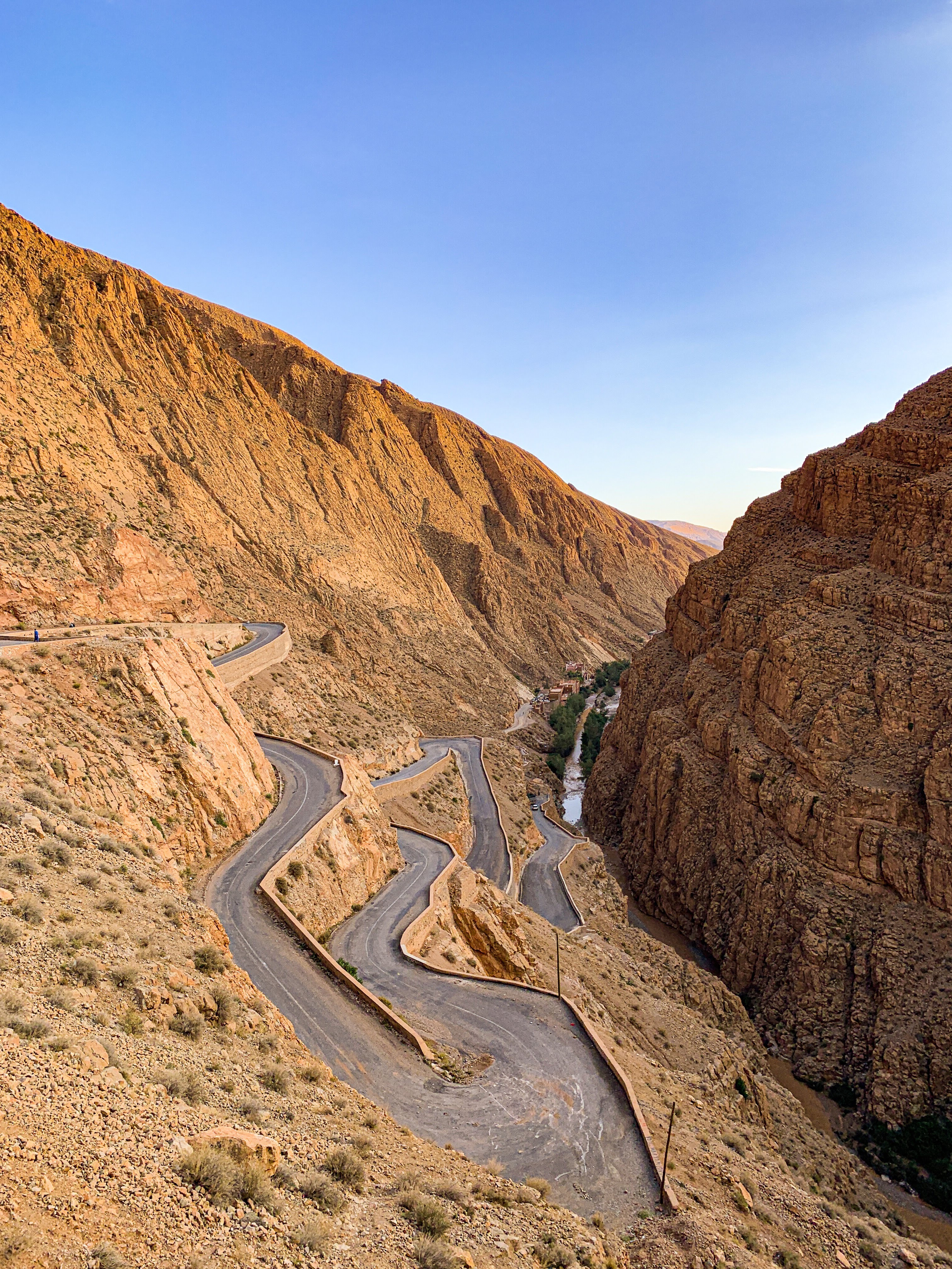 Antes mesmo do primeiro passeio programado para o dia, entendemos o porquê de terem nos sugerido o tour com agência. São muuuuitas curvas pelo caminho, numa estrada bem estreita, em alguns pontos é difícil acreditar que é uma via de mão dupla. O Chouaib era meio agressivo no volante, mas dava pra ver que ele conhecia bem a estrada e sabia todas as curvas. Eu (Gabi) é que não estava acostumada com elas e tive que pedir um tempo… 🤦🏻♀️ Que eu me lembre, esse foi a segunda vez na vida que enjoei na estrada, então dá pra entender que é muita curva mesmo neh?! Rsrsrs