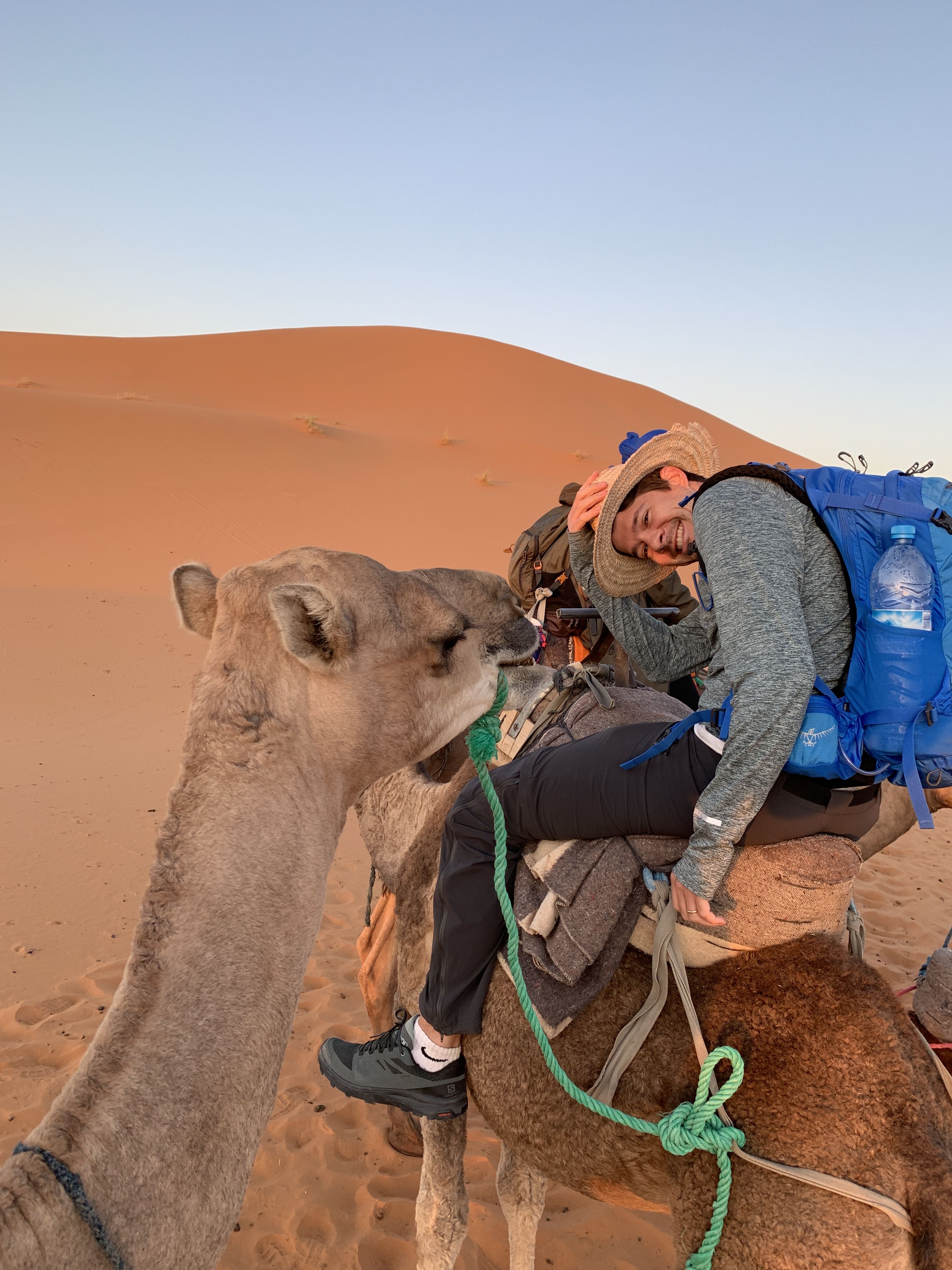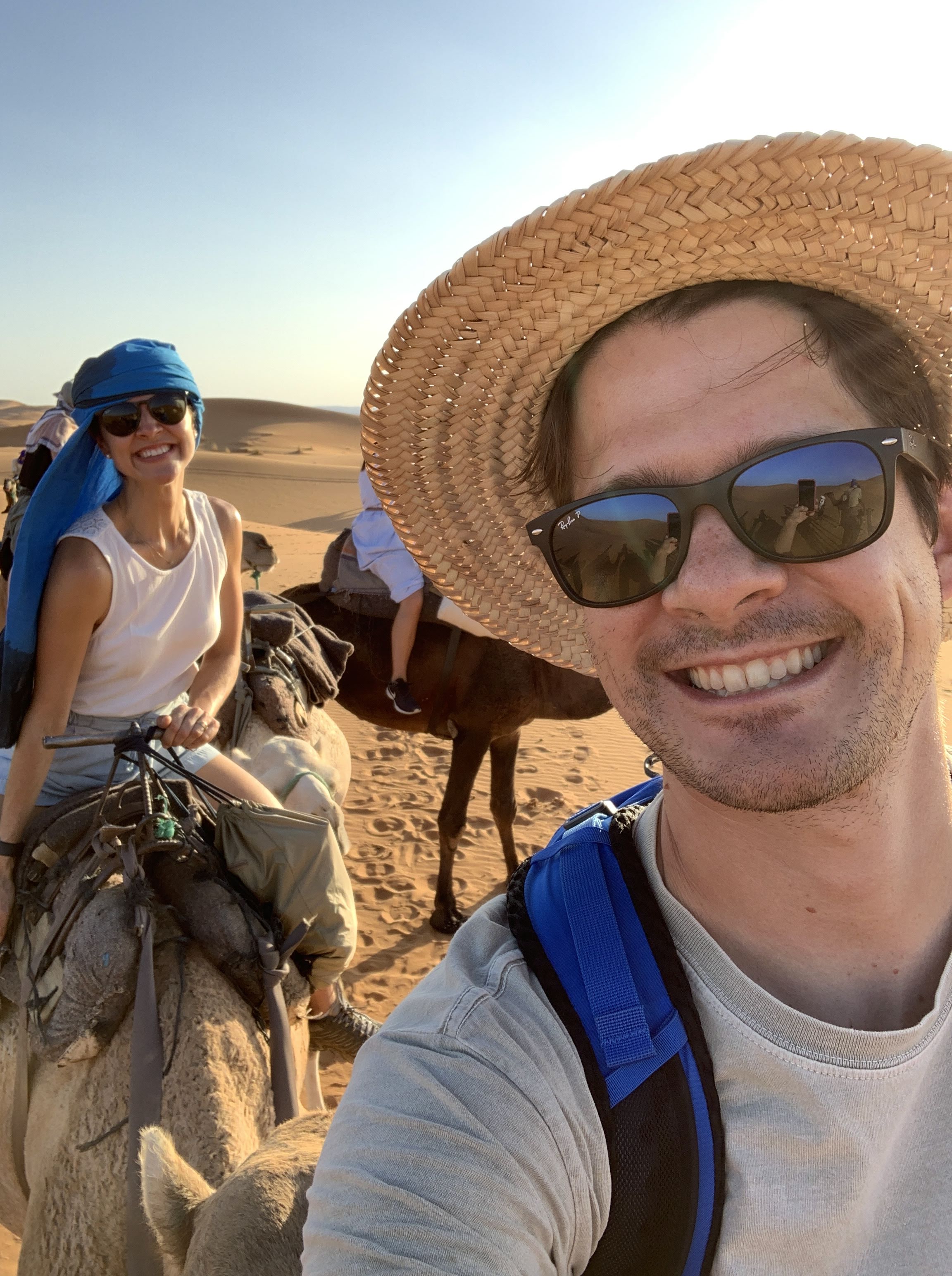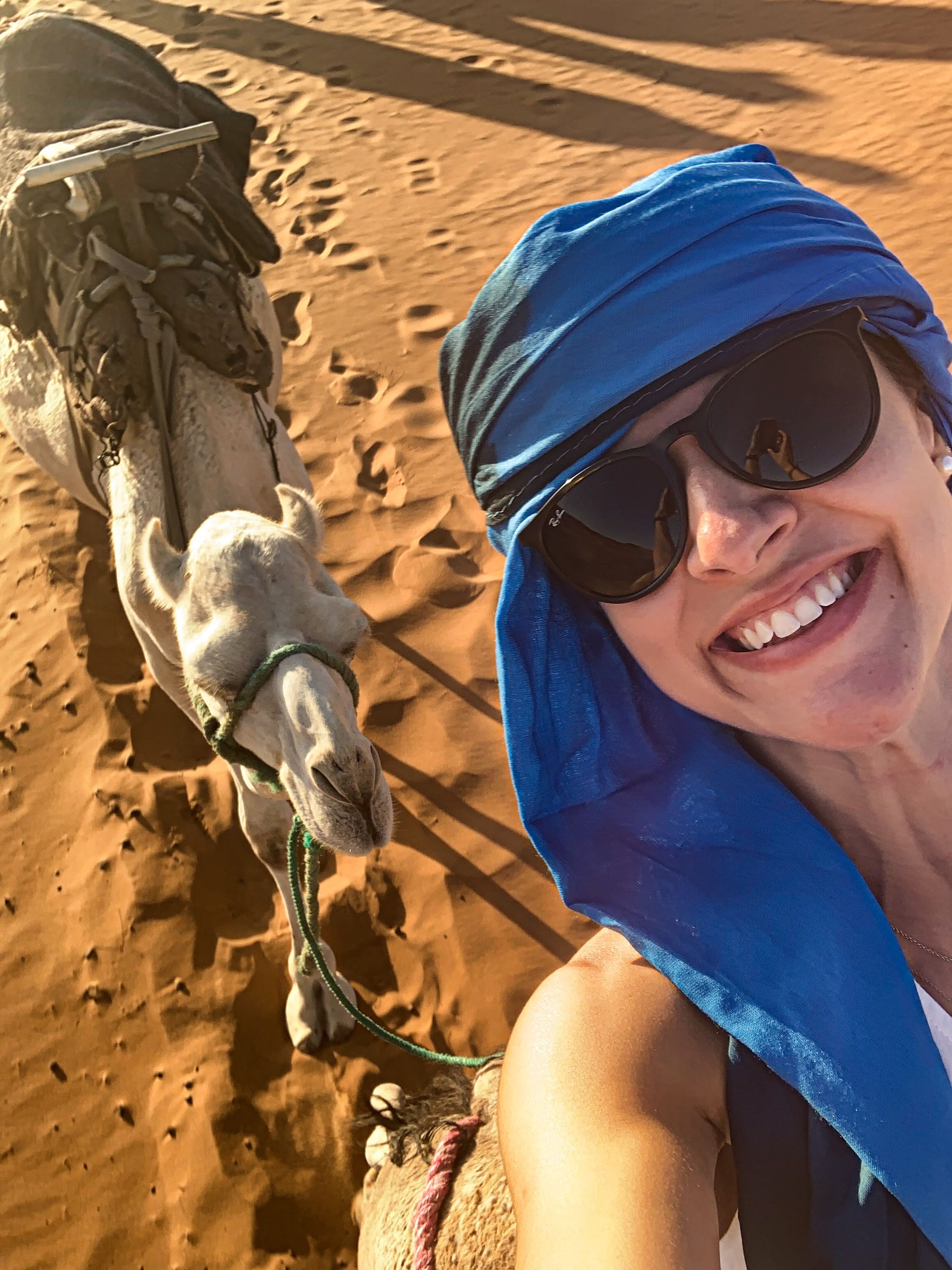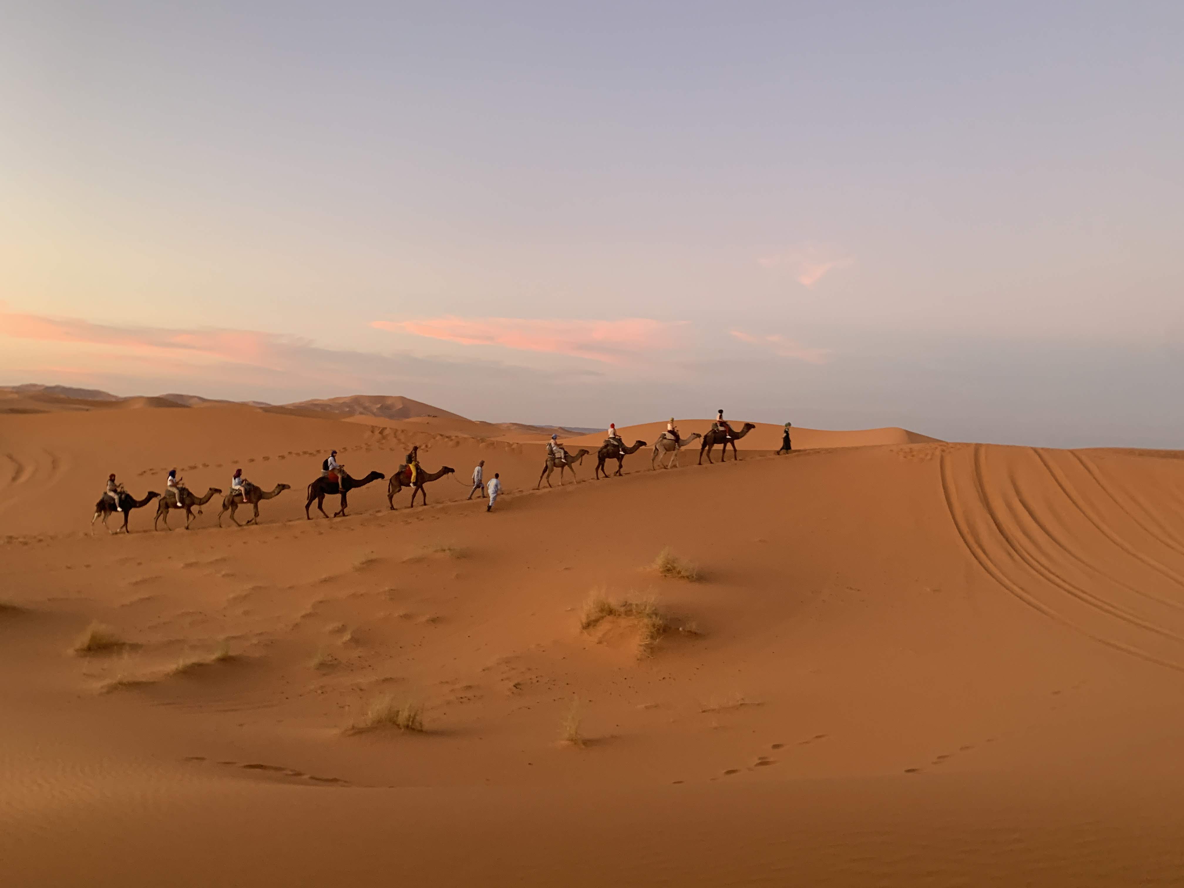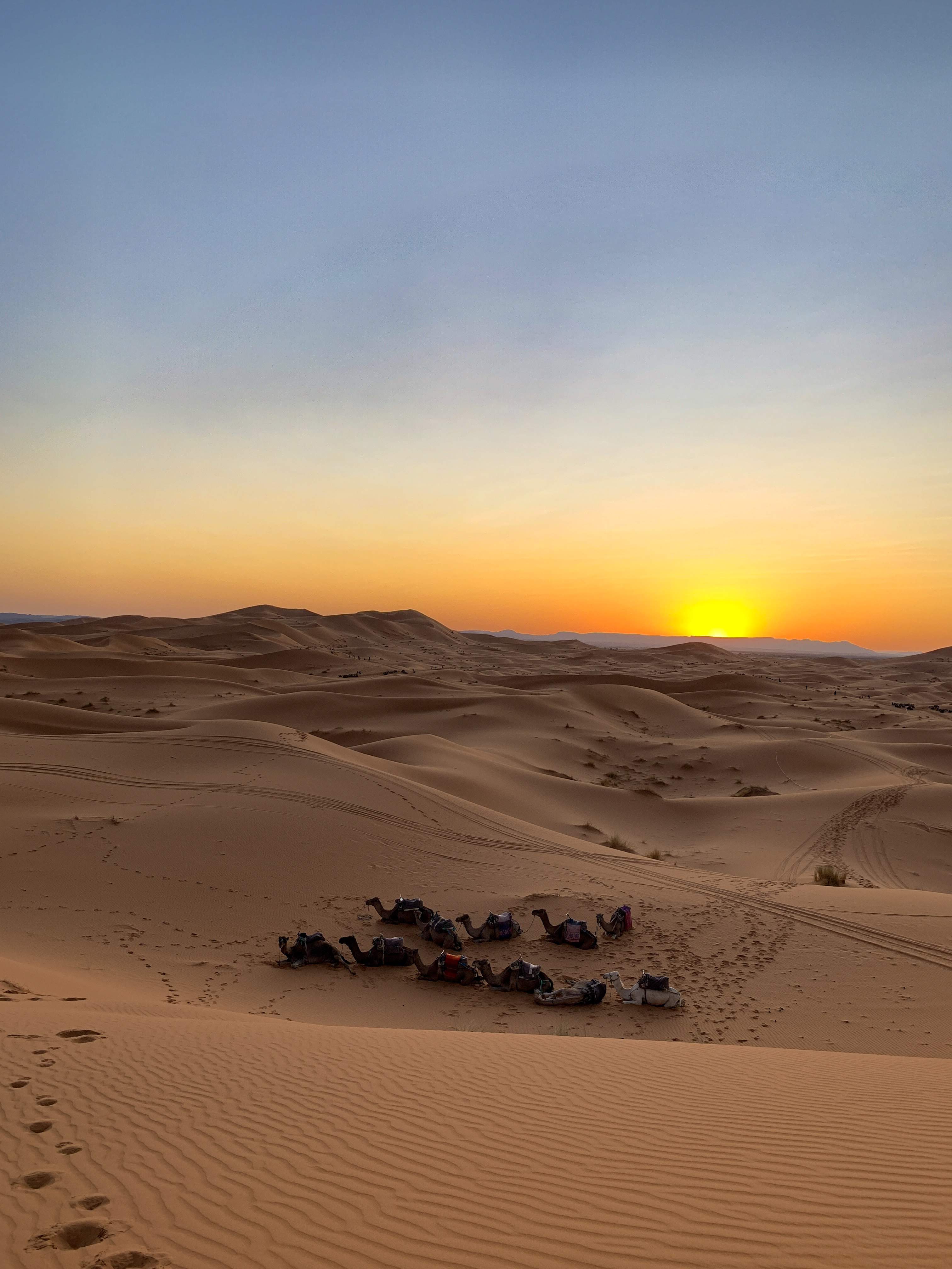 Por volta das 16h chegamos em Merzouga e paramos no alojamento onde tomamos uma ducha e deixamos nossas mochilas. Às 17:30 começou o tão esperado passeio de camelo pelas dunas do deserto em direção ao acampamento onde passaríamos a noite. No caminho, uma parada para apreciar o pôr do sol no deserto, um momento especial, muito lindo!!!