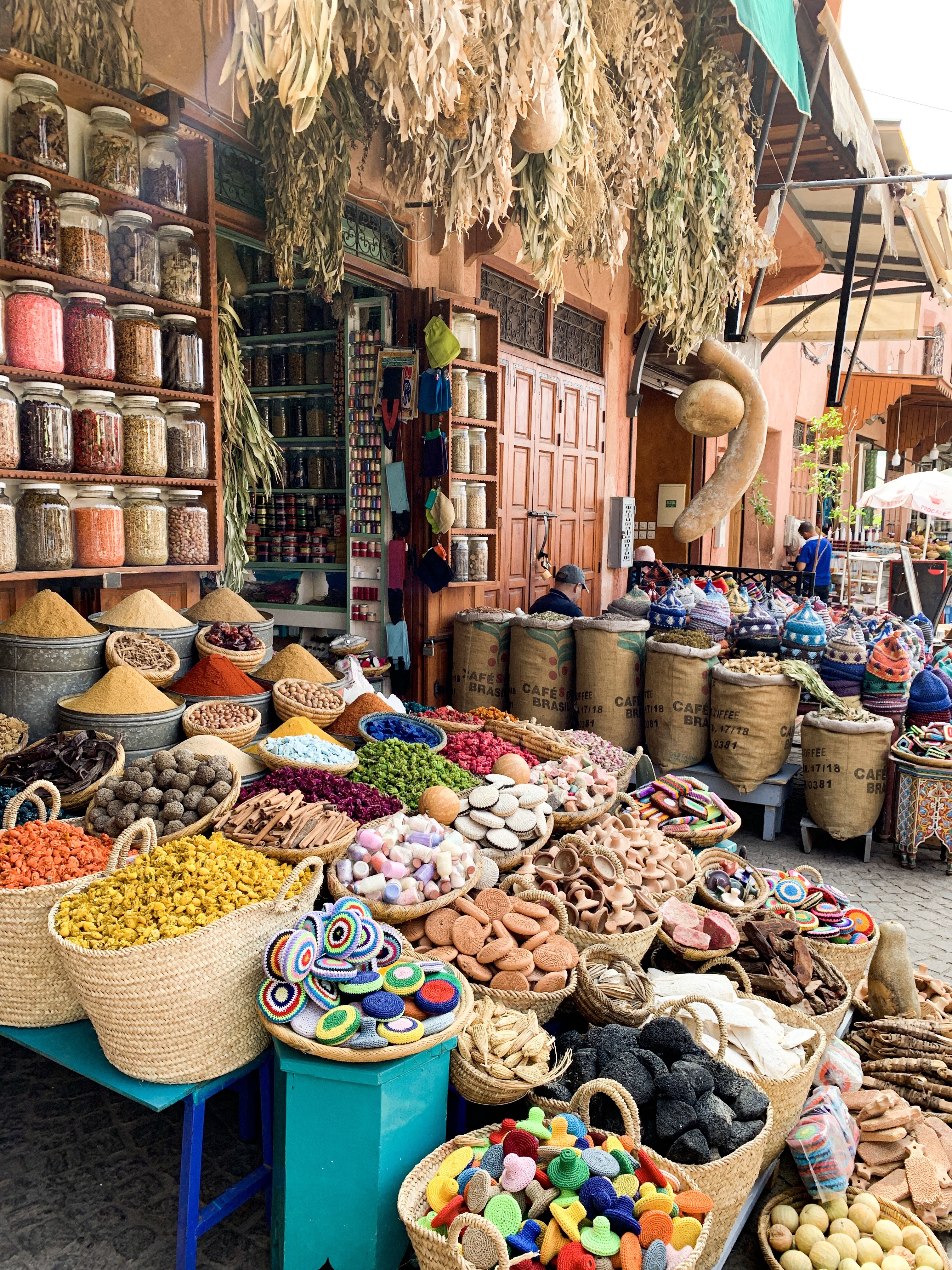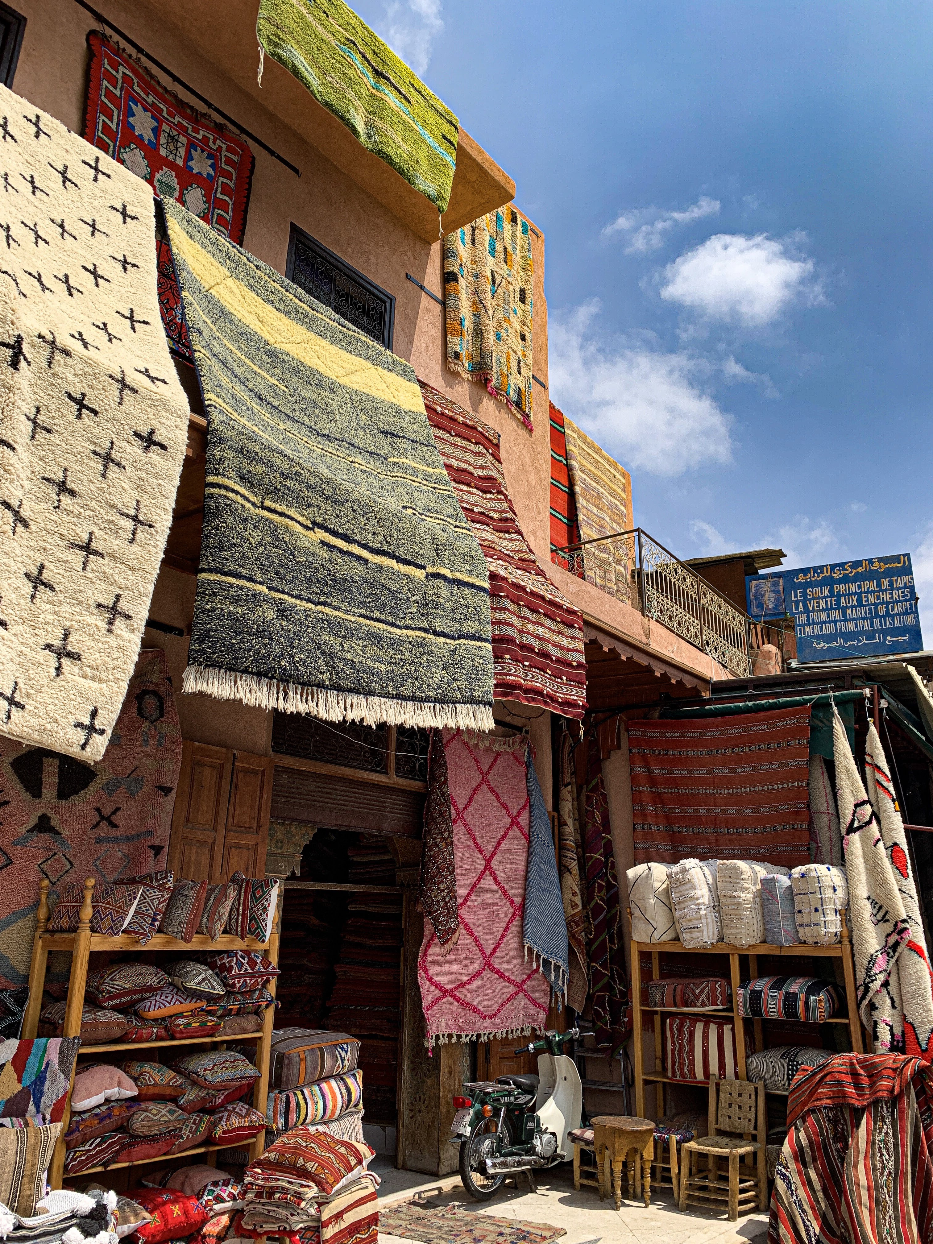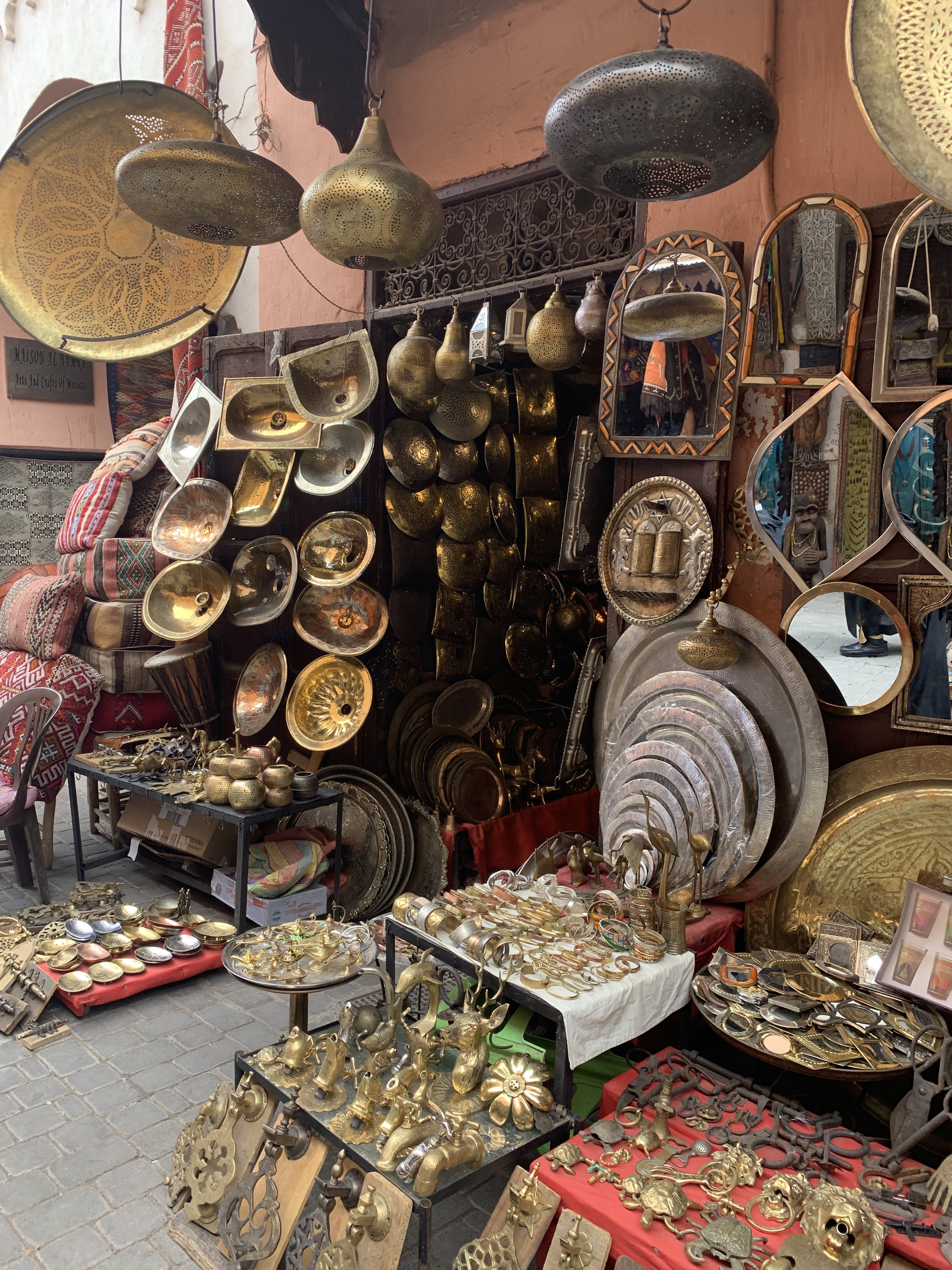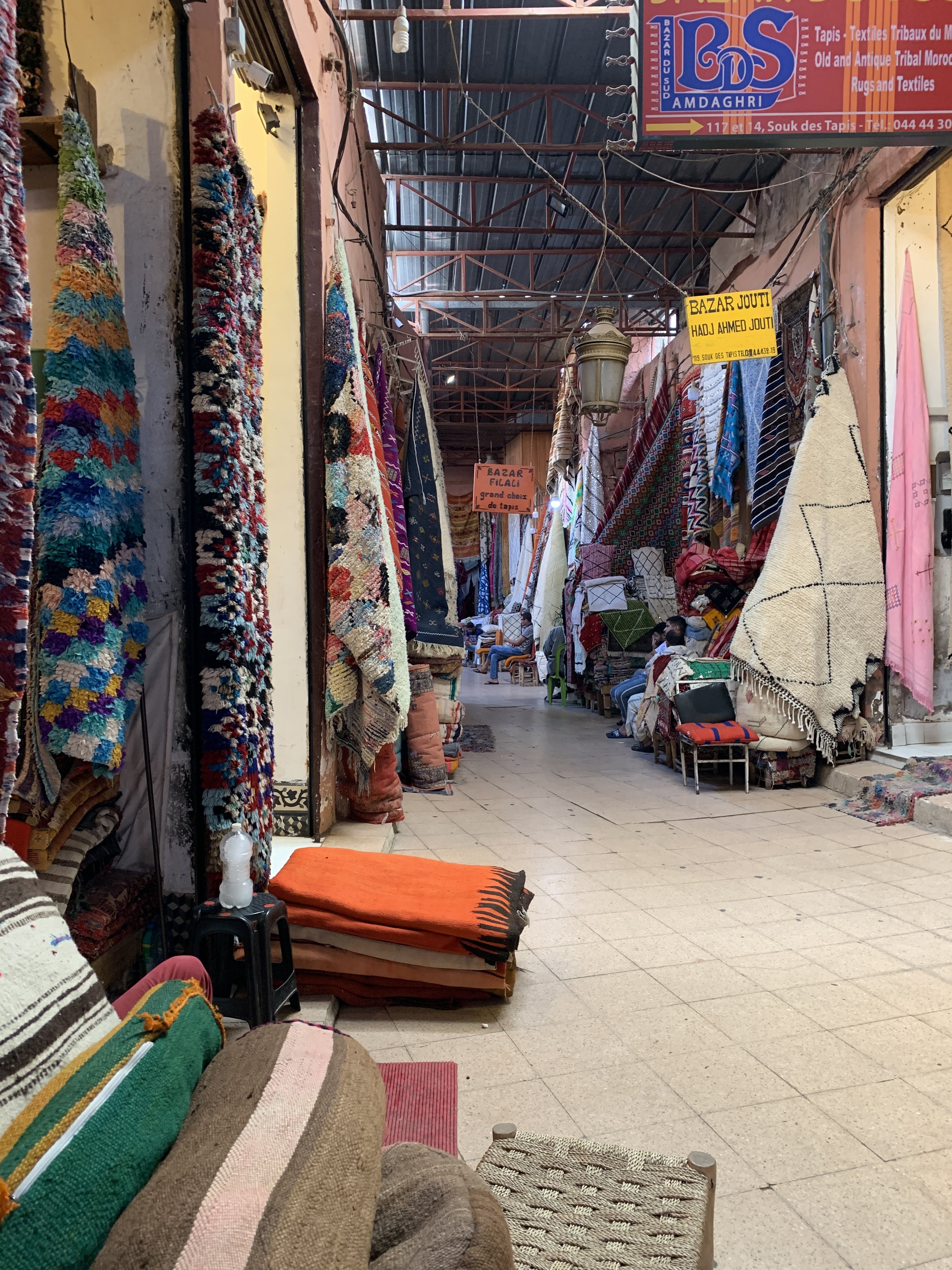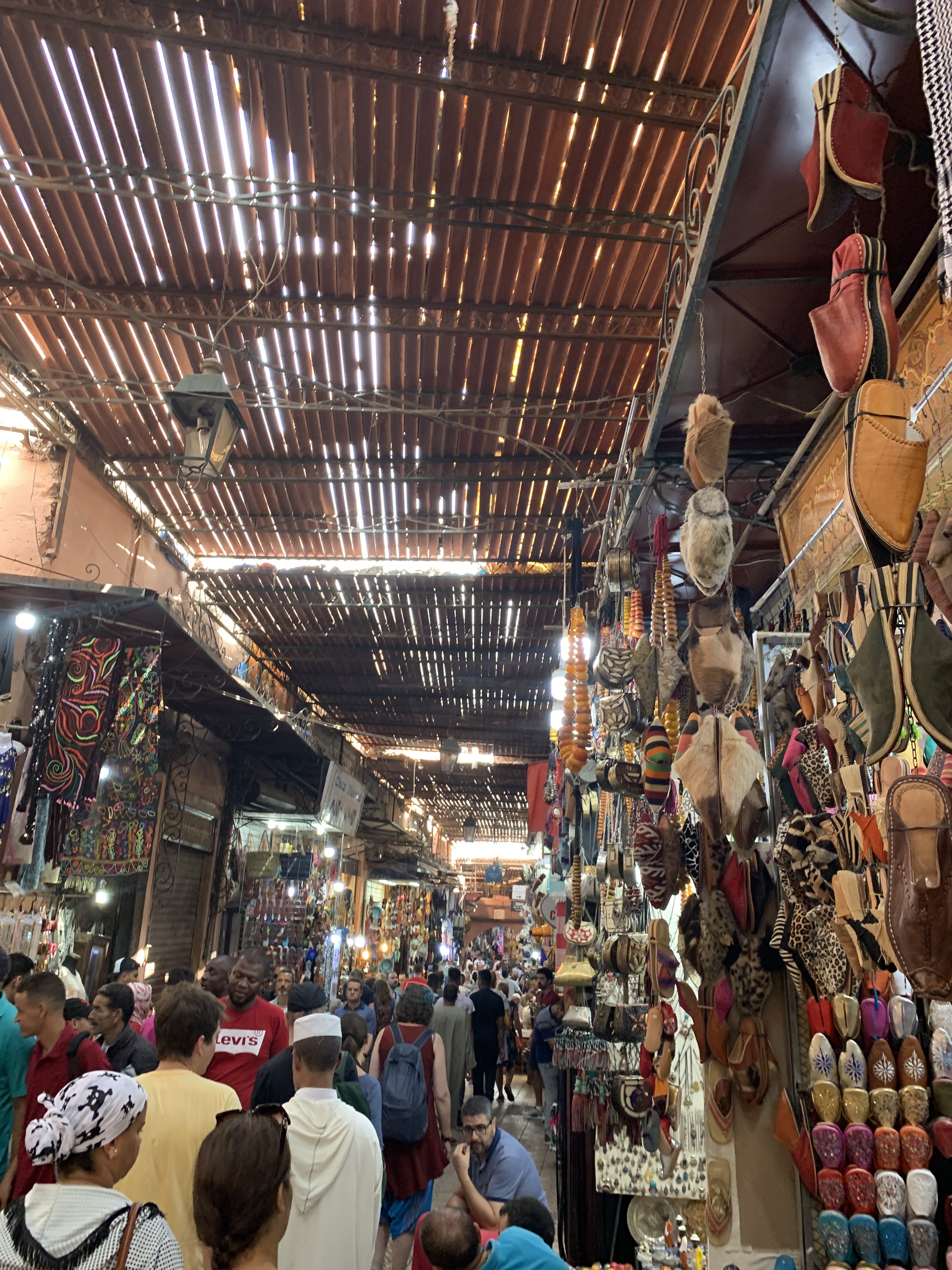 Caminhamos um pouco mais pela Medina com direção à Medersa Ben Youssef. Medersas (ou Madraças) são as escolas muçulmanas de ensino superior, e como é de se esperar, são especializadas em estudos religiosos. A Ben Youssef é a maior e mais importante de todo o país, com 130 quartos que permitiam abrigar até 900 estudantes. Por conta de sua arquitetura impressionante, o monumento é um dos principais lugares a se visitar em Marrakech. Nós infelizmente não conseguimos entrar, pois o local está fechado para reforma. Fica para a próxima… 😉 A última parte do walking tour foi pelo labirinto dos Souks. A parte legal de estar com um guia é que ele te leva a lugares do mercado que dificilmente descobriríamos, como a área onde ocorre leilão de couro cru durante as manhãs.