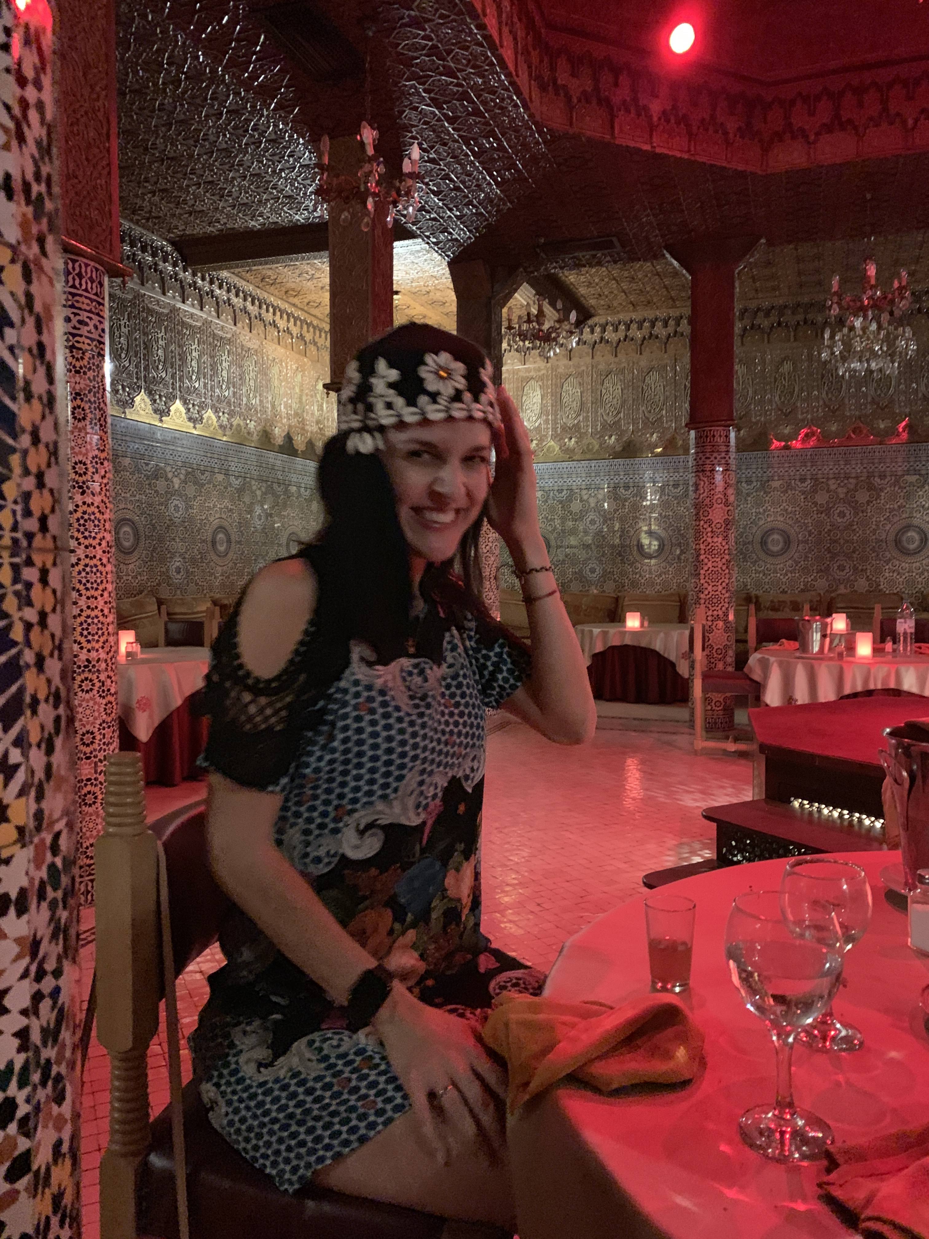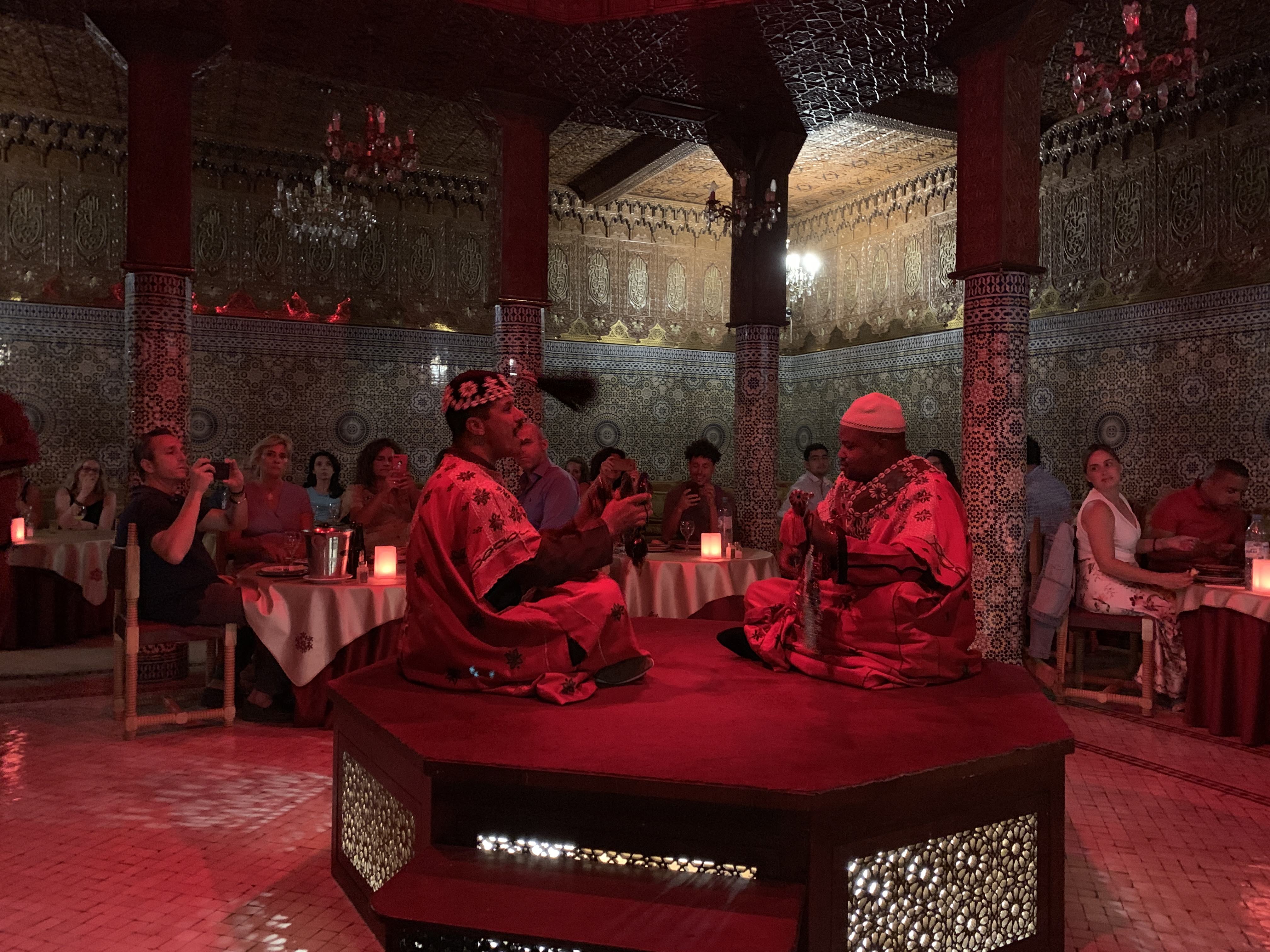 Na sexta-feira, nossa segunda noite por aqui, encontramos a Kat e o Afonso, casal de amigos de SC/SP que estava de férias no Marrocos. Fomos jantar num restaurante que tem apresentações de dança do ventre e músicas tradicionais. Um programa bem turístico, mas que valeu à pena. Deu pra se divertir bastante… 😅
