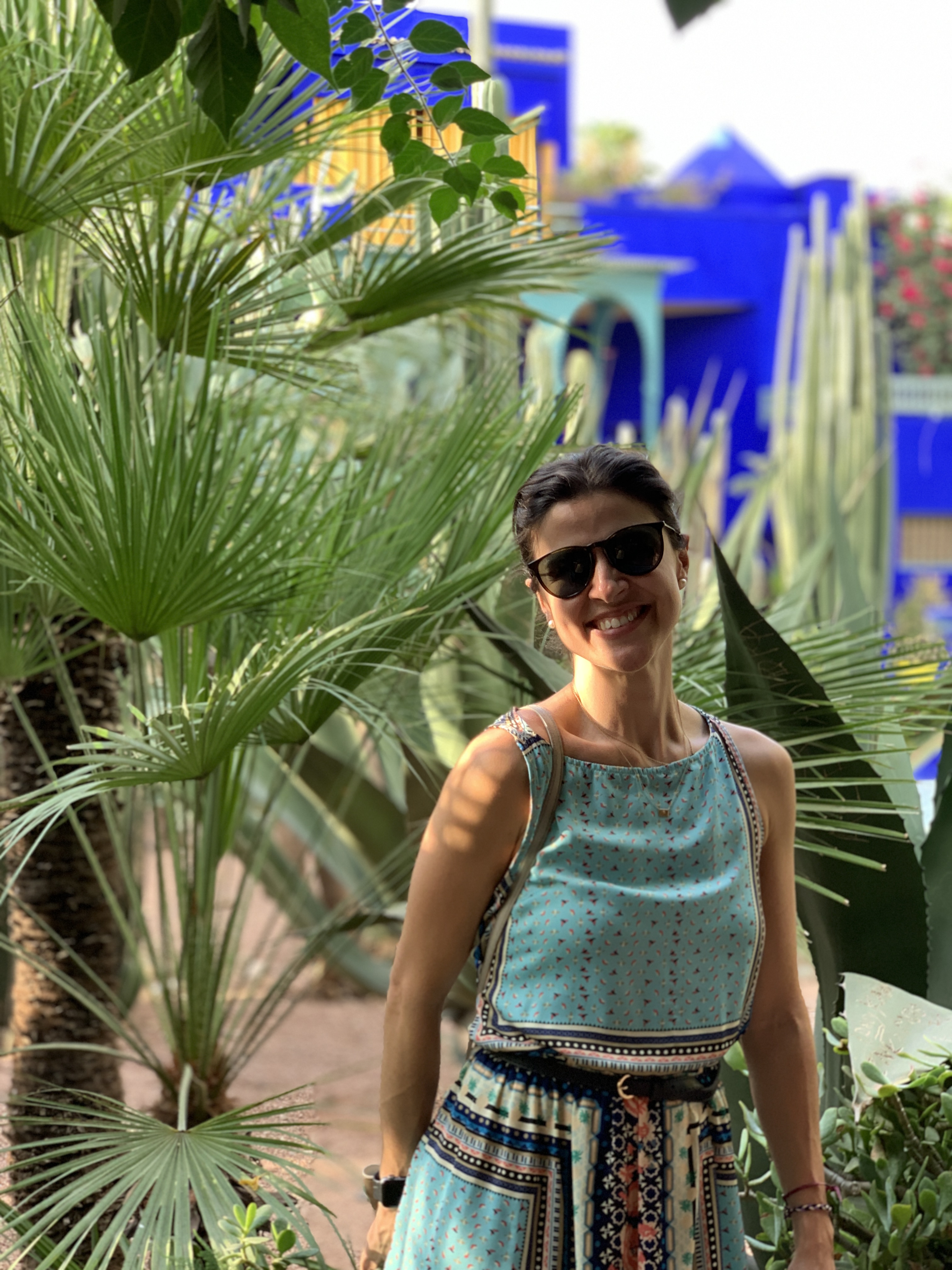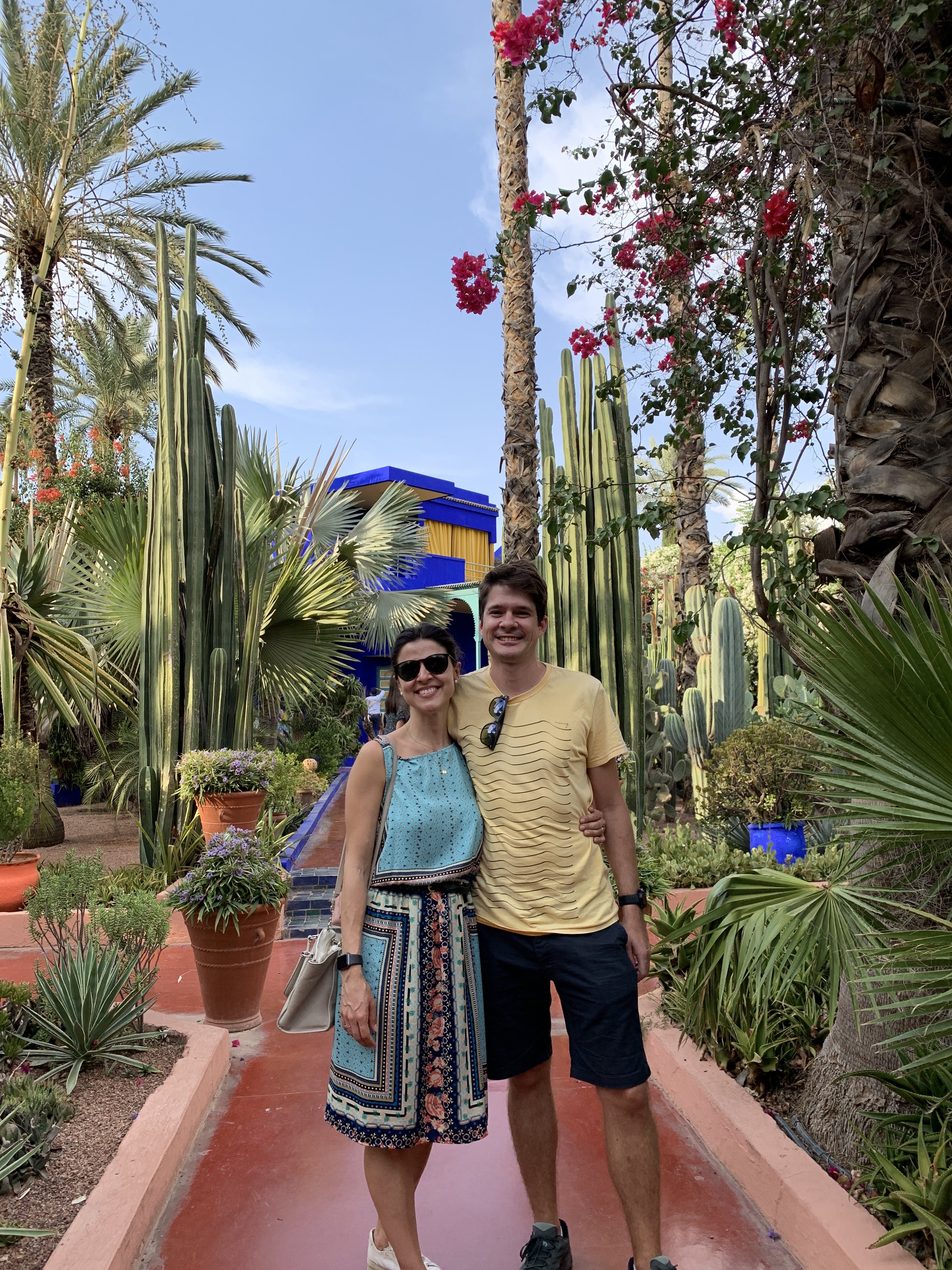 A próxima parada foi no Jardin Majorelle. Trata-se de um jardim botânico que leva o nome do seu fundador, o pintor francês Jacques Majorelle, que o criou em 1931. Posteriormente, o jardim foi adquirido por Yves Saint Laurent e Pierre Bergé, seu esposo. Lá, inclusive, foram depositadas as cinzas de Saint Laurent após a sua morte. O jardim é cheio de cores vivas, misturando o azul (majorelle) das paredes e vasos com o verde das plantas exóticas trazidas de várias partes do mundo. Um lugar maravilhoso e uma espécie de refúgio em meio ao caos de Marrakesh.