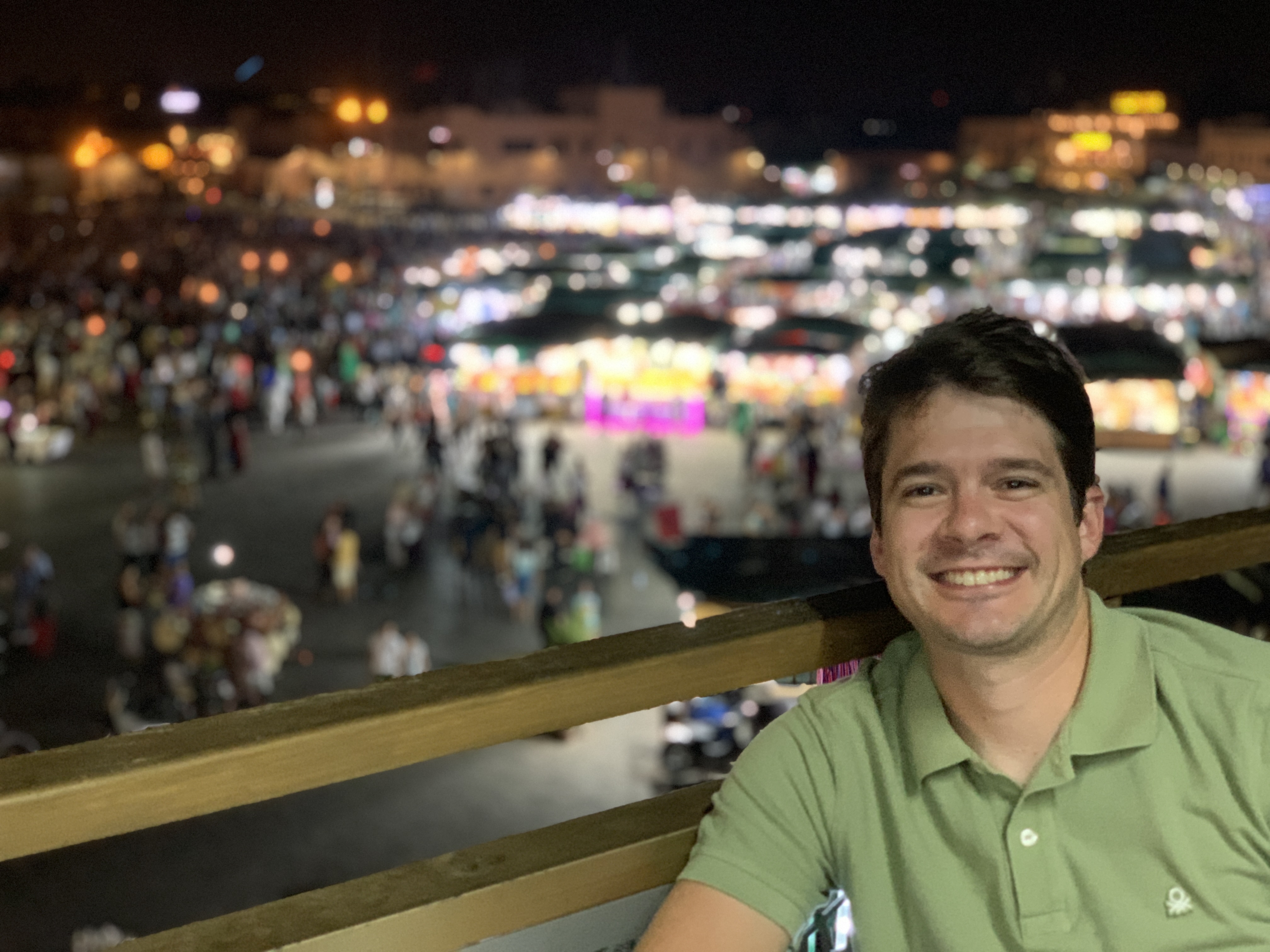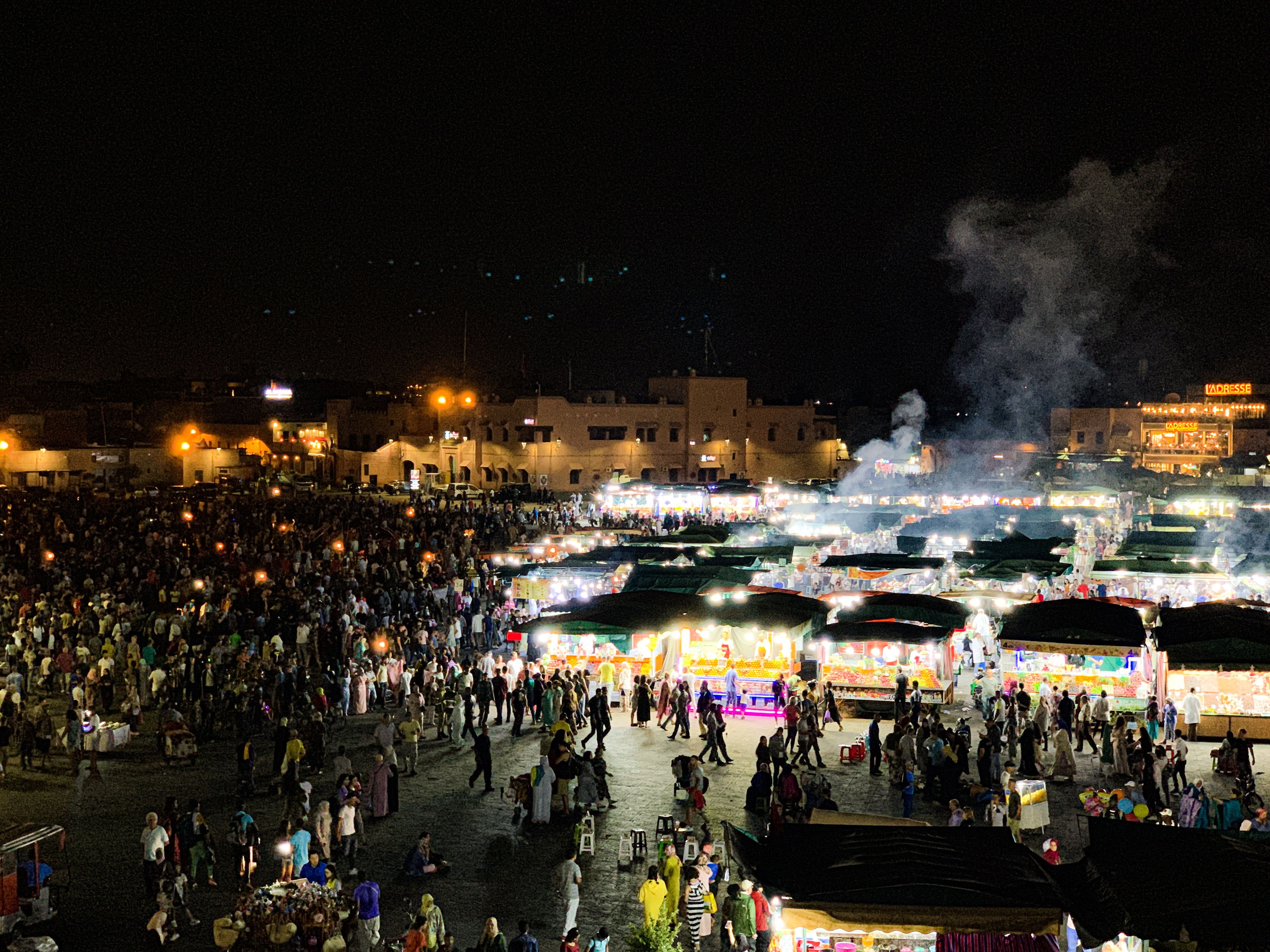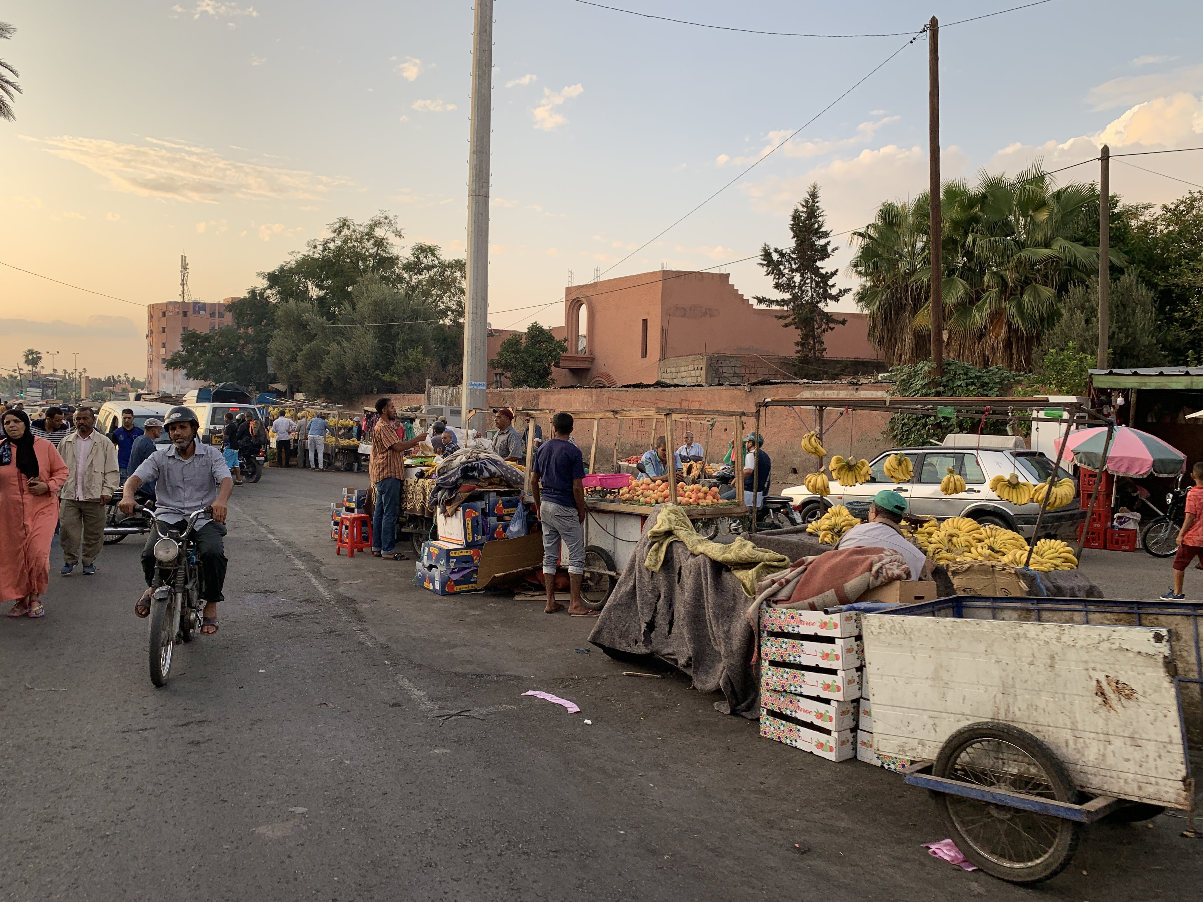 No Marrocos o consumo de bebida alcoólica é bem restrito, especialmente nas Medinas. Aproveitamos que o jardim fica fora da Medina e nos abastecemos com algumas cervejas e vinhos e fomos pro Riad onde a Kat e o Afonso estavam hospedados para curtir o último sunset marroquino deles. O pôr do sol no Marrocos é algo especial, muuuito lindo!  Na negociação para pegar um taxi que levasse nós quatro, conseguimos só um tuktuk improvisado, uma emoção a mais pro nosso passeio 😅. Anoiteceu e bateu a fome, saímos para comer algo e, no meio do caminho, ainda rolaram as últimas pechinchas e compras pelos Souks de Marrakech, um fim de noite bem divertido! Kat e Afonso, que bom que conseguimos organizar os roteiro para nos encontrarmos por aqui. Saudades dos nossos dias já, nos reencontramos por SP, SC, ou algum outro canto 😘