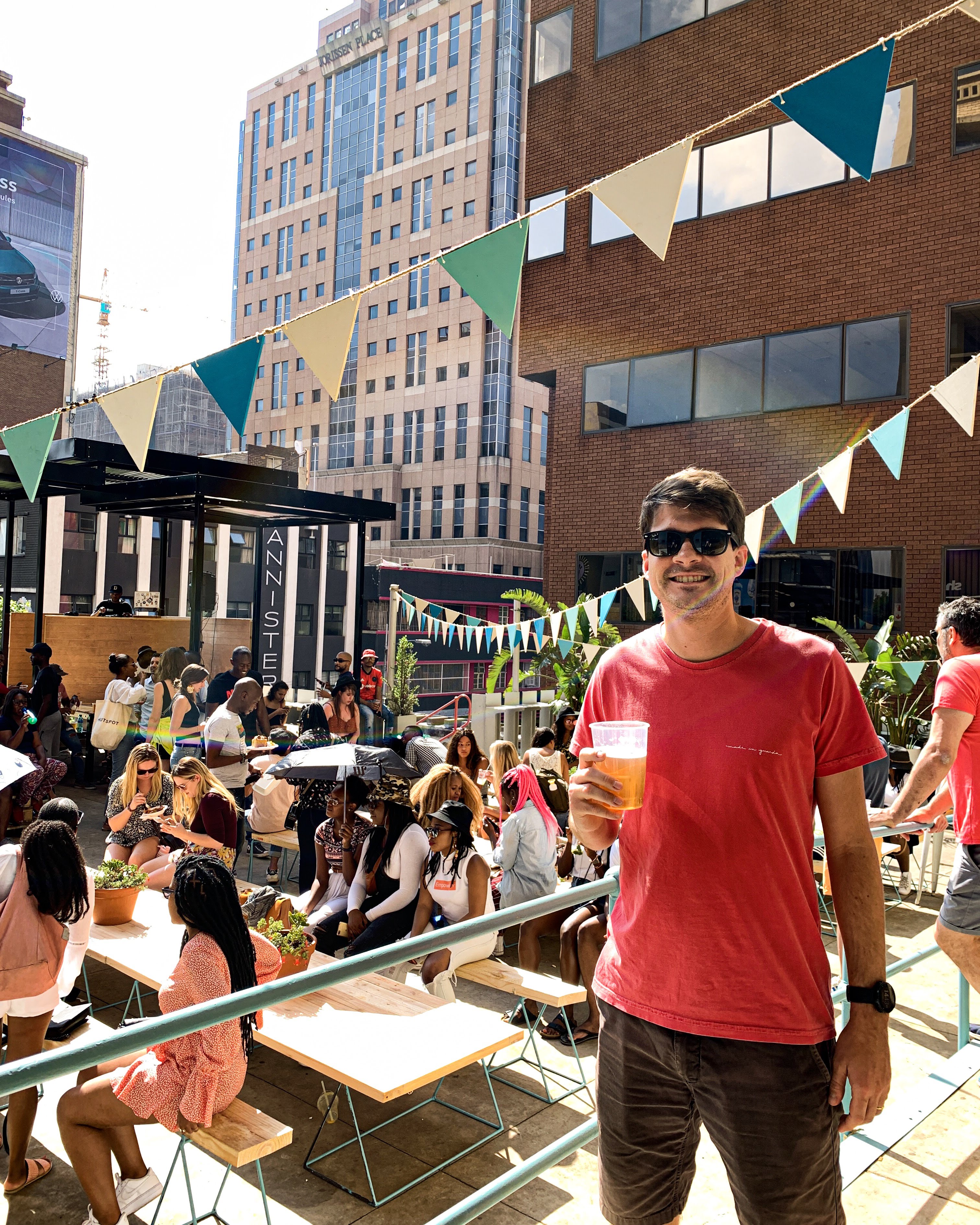 Saindo do museu fomos até Maboneng, uma região que era muito perigosa, mas foi, em parte, revitalizada e hoje abriga vários bares, rooftops e galerias de artesanato. Por lá, comemos um almojanta e depois nos juntamos ao William e ao Felipe, que estavam num rooftop bar ao lado. O fim de domingo em Joburg é agitado! Aproveitamos para tomar uma cerveja curtindo o pôr do sol com eles. 👌🍻