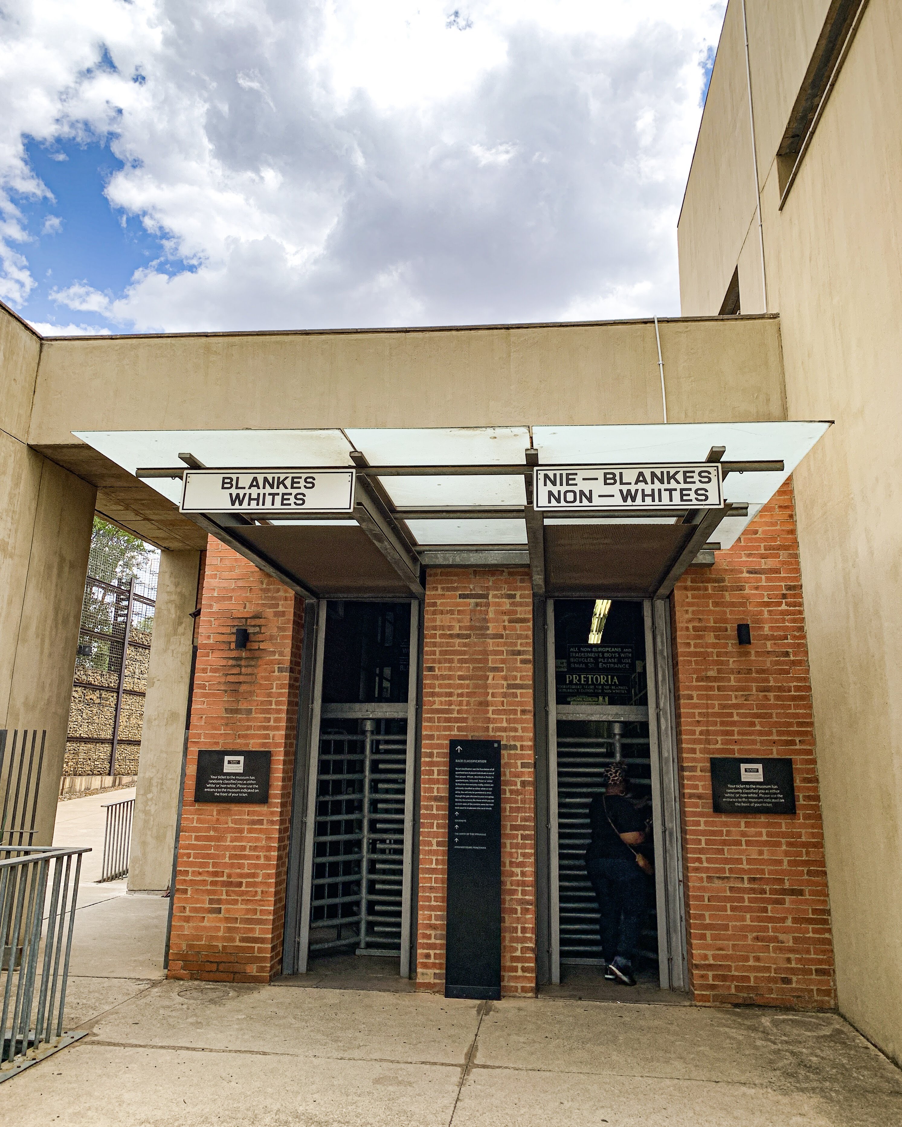 O primeiro deles foi o museu do Apartheid, praticamente uma biblioteca em formato de museu. O museu tem uma disposição muito boa e relata em detalhes a história da segregação na África do Sul desde a chegada dos primeiros holandeses, passando pela dominação britânica, a implantação do apartheid até o “fim” em 1994 com a libertação de Mandela e outros importantes nomes da luta contra a segregação. Na época que fomos, o museu contava ainda com uma exposição especial sobre o Mandela e sua história pessoal. Em conclusão, ficamos por lá durante 4 horas e ainda assim pulamos alguns relatos. Ter assistido o filme no dia anterior deixou a visita ainda mais interessante, recomendamos. 😉 Não é permitido tirar fotos dentro do museu, mas os detalhes do ingresso e da divisão entre negros e brancos na porta de entrada já dão uma prévia de como o lugar é intrigante.