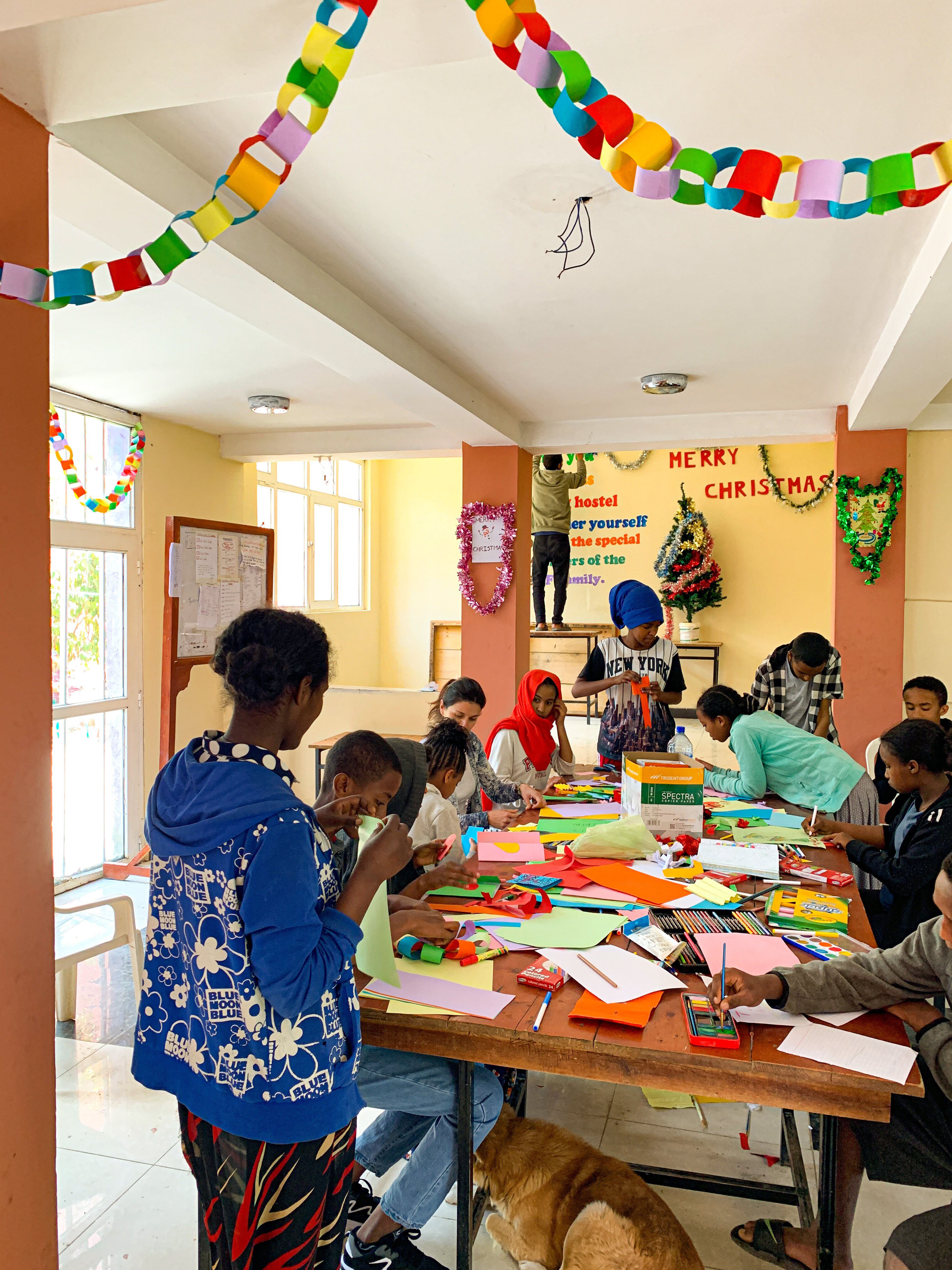 No último fim de semana, a Gabi decidiu organizar uma atividade de decoração de Natal com as crianças. Algumas delas aproveitaram o feriado para viajar, mas pelo menos metade ficou no alojamento e celebraria o Natal ali mesmo. Compramos papéis coloridos e outros aparatos de decoração e começamos a chamar as crianças para ajudar. Elas demoraram um pouco para pegar o ritmo, mas depois não queriam mais parar de cortar e desenhar. O resultado ficou bem legal!