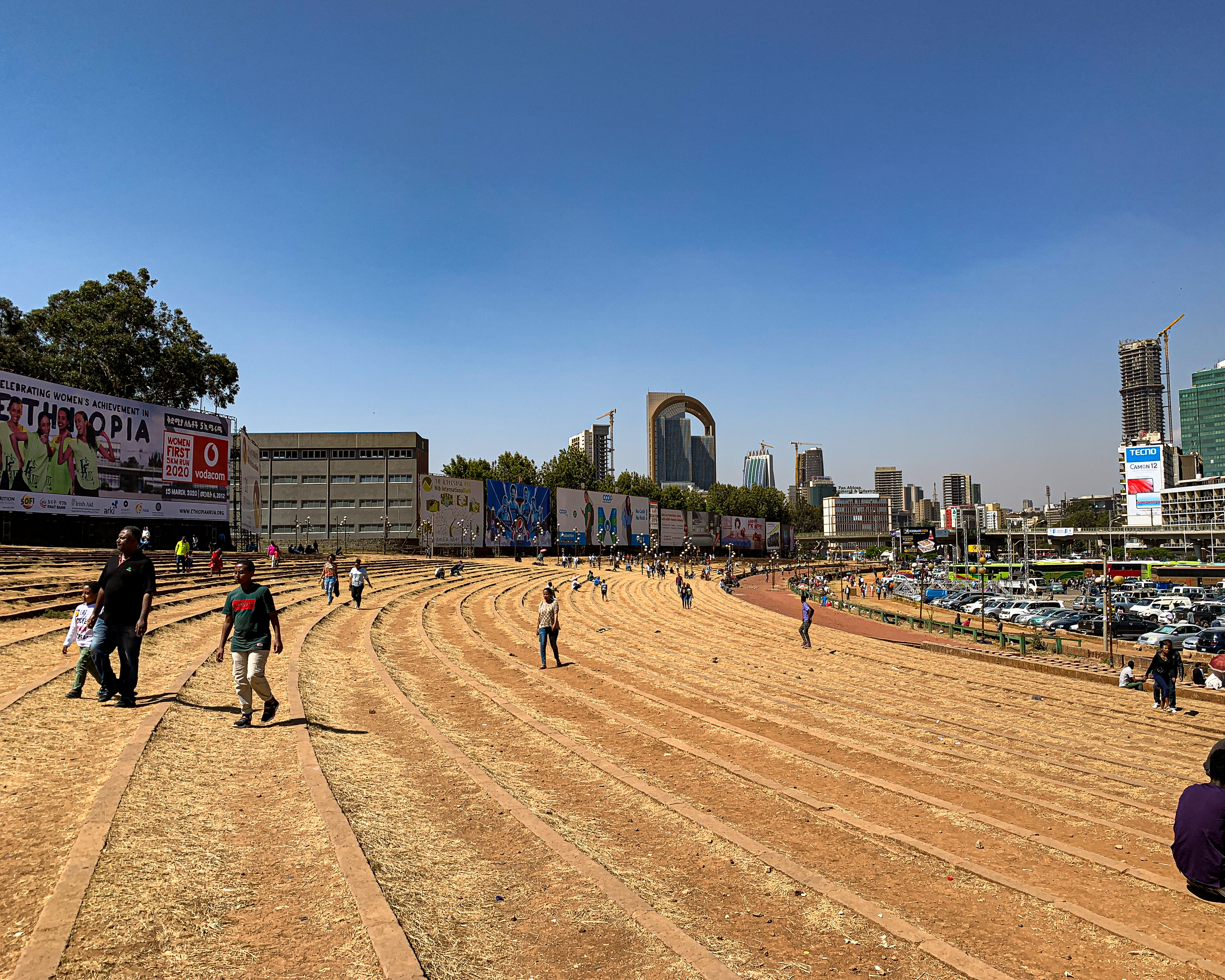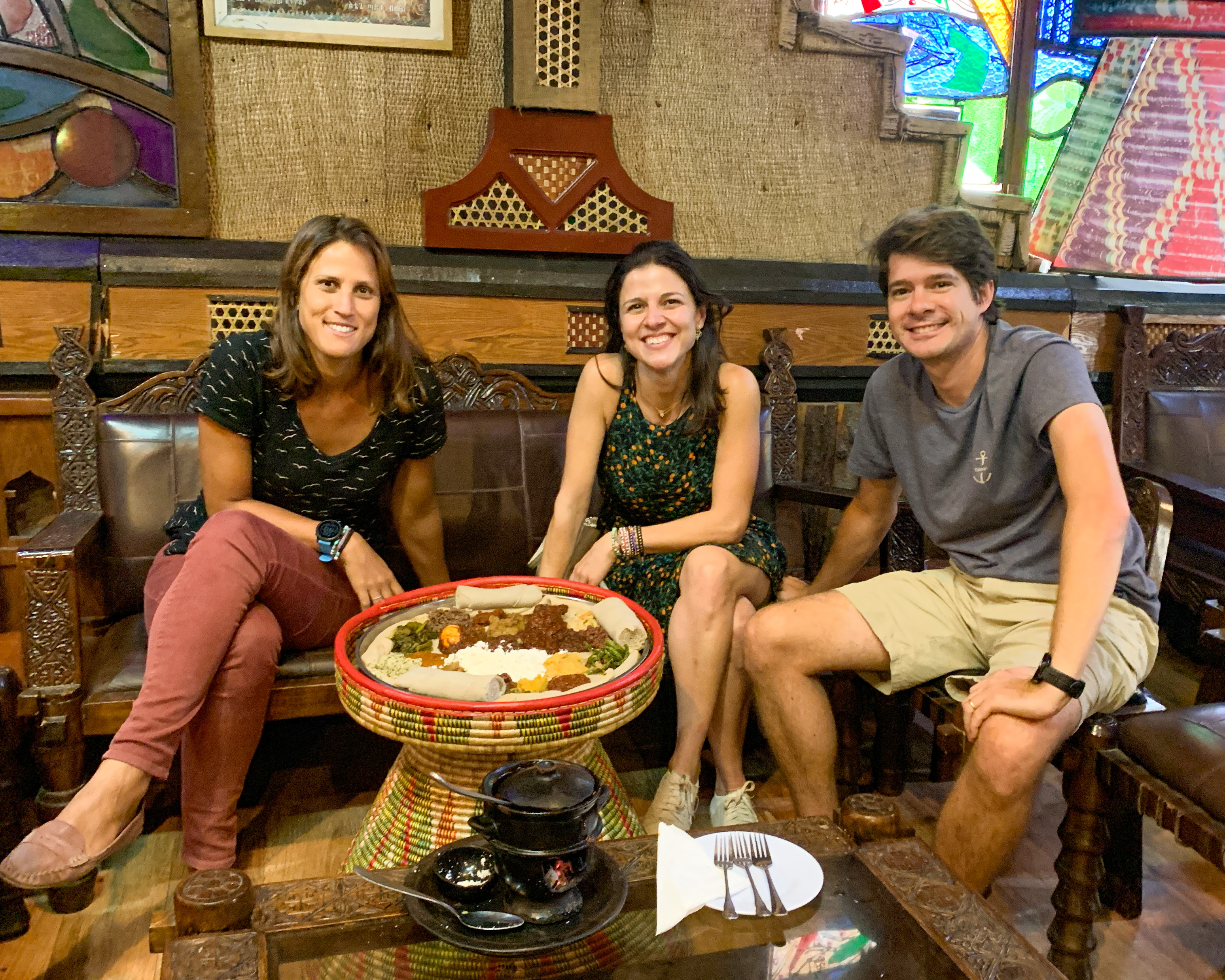 Retomando o passeio, passamos pela Praça Meskel, onde muitos corredores se reúnem na escadaria semi-circular para treinar, no início e no final do dia. Segundo a lenda, ao subir e descer a escada, correndo ao longo de todos os degraus, a distância de uma maratona – 42km – é percorrida. Não foi dessa vez que fomos conferir… 😅 Para fechar o passeio fomos almoçar num tradicional restaurante etíope.