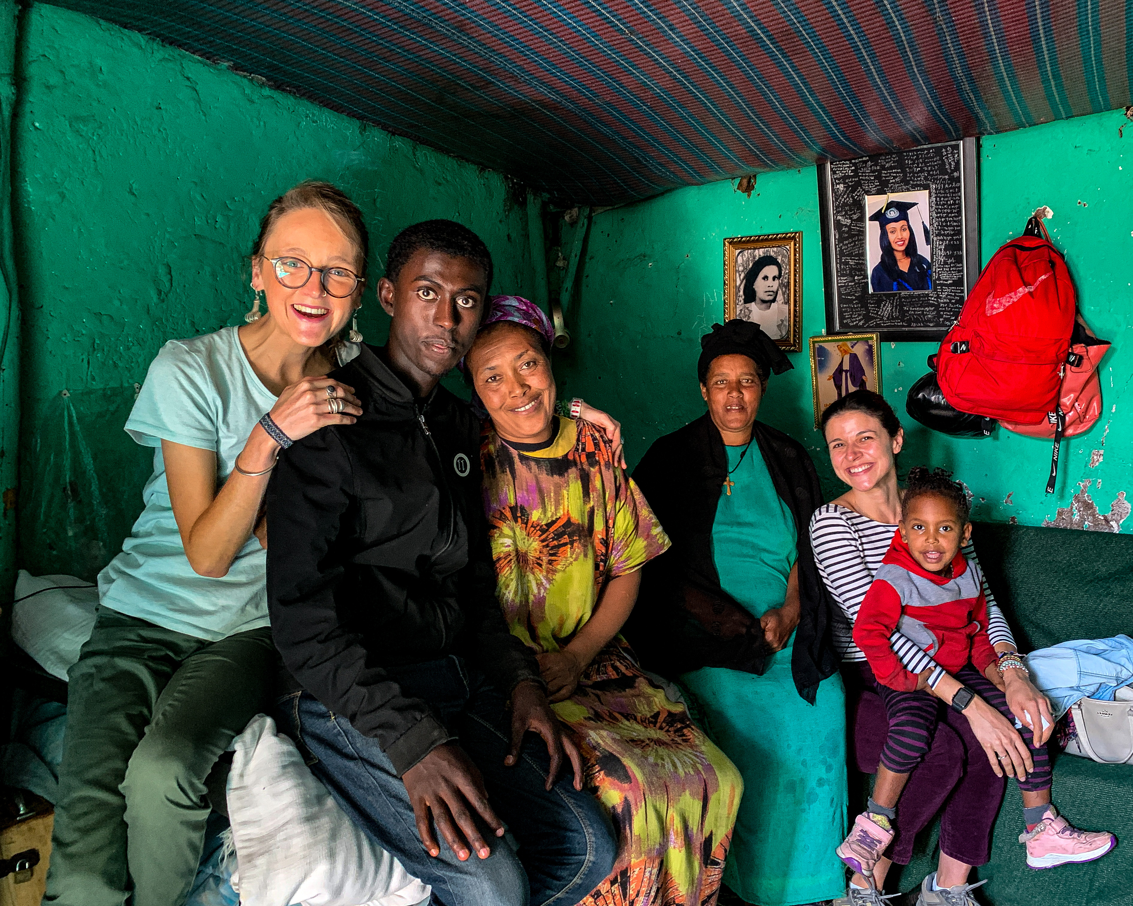 Durante o caminho, o Biruk nos contou um pouco mais de sua história. Ele não sabe quem é seu pai e perdeu a mãe quando criança. Seus familiares mais próximos são as irmãs mais velhas, que o criaram, e que vivem com as tias no centro de Addis. Infelizmente não tivemos a oportunidade de conhecer as irmãs que estavam trabalhando, mas as tias foram super receptivas e deixaram explícito a alegria de ter seu sobrinho no programa da EEF. A casa é bem simples e em um mesmo cômodo vivem as irmãs e o próprio Biruk quando vai visitá-las. Saímos de lá refletindo na realidade tão diferente e no choque transformador que a educação pode causar em uma família. 🙂