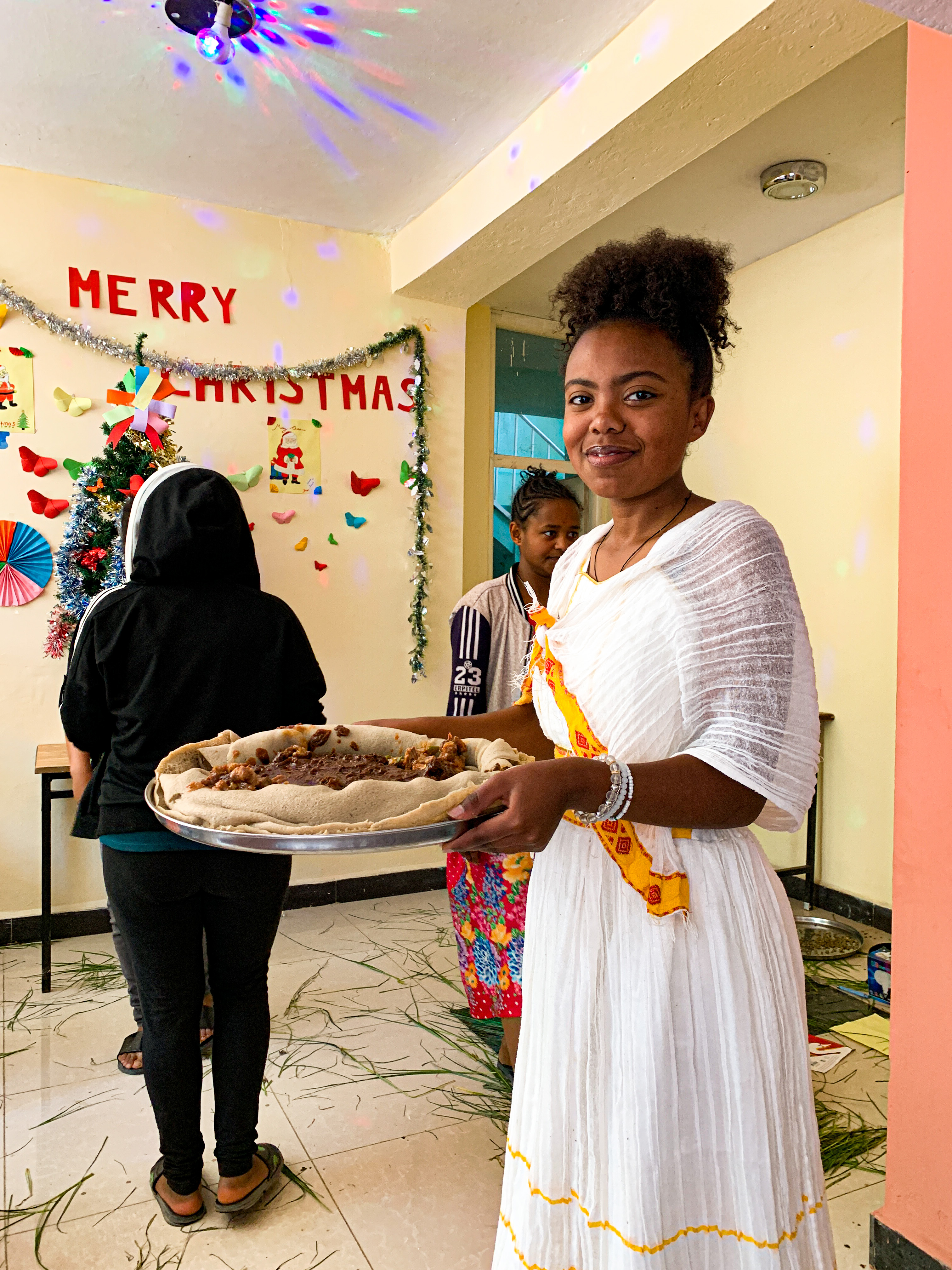 No dia de Natal, ficamos sabendo que a refeição seria especial: Doro Wot. A comida é um ensopado apimentado a base de frango ou cordeiro que é servido com a famosa injera (sempre ela 😋). Conforme aprendemos lá, vários católicos ortodoxos praticam o jejum e essa seria a primeira refeição com carne em cerca de 50 dias. Eles passam semanas no ano sem consumir carne ou qualquer derivado animal (ovo, leite, etc.).