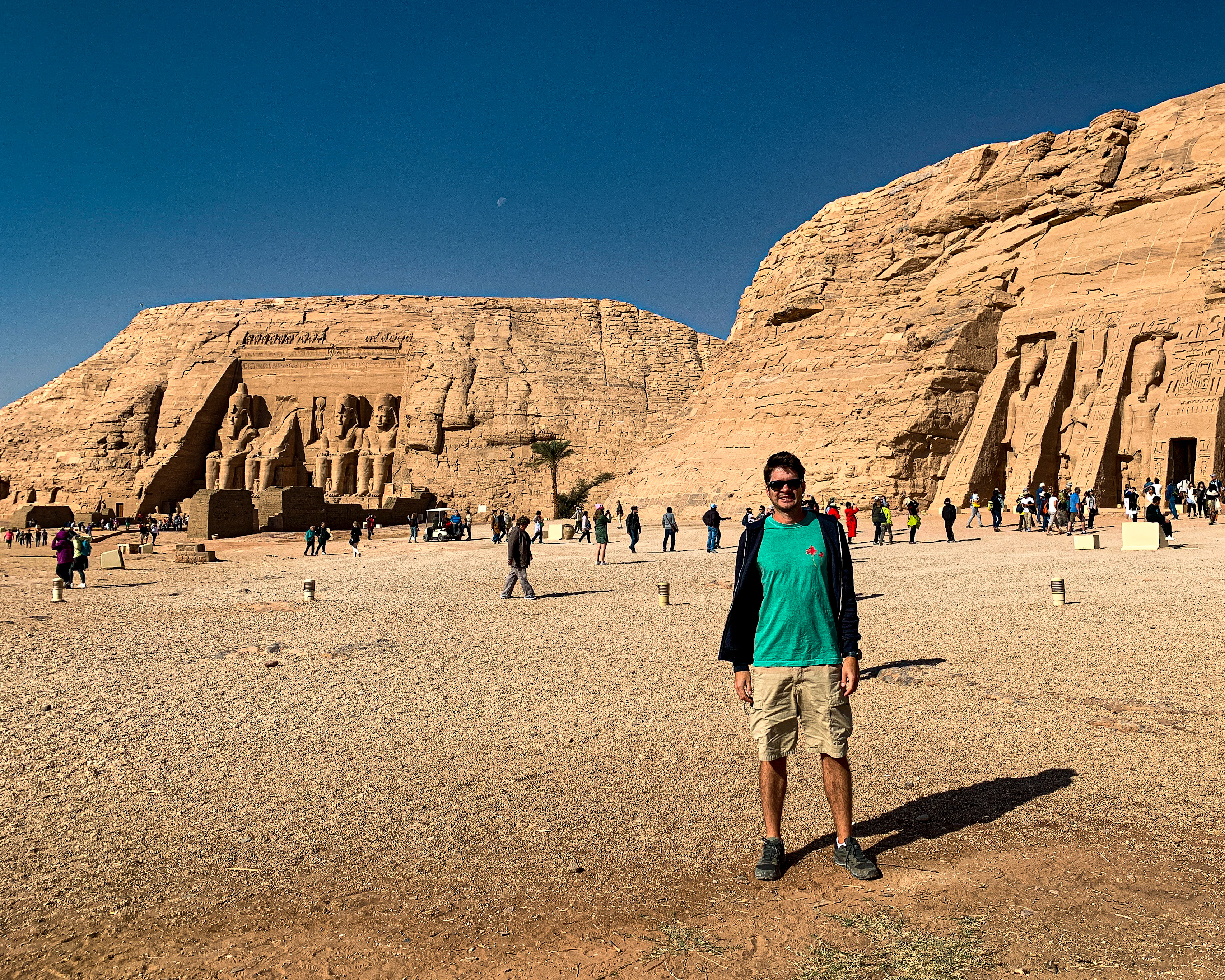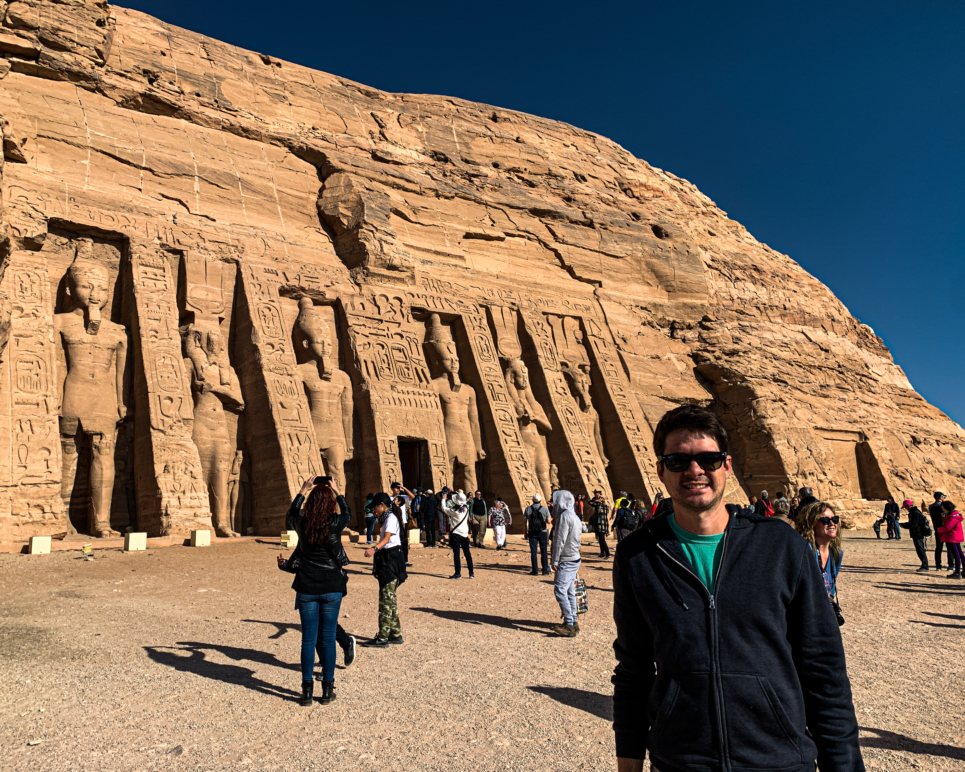 Como Abu Simbel fica próximo à fronteira do Egito com o Sudão, uma região que já foi muito conflituosa, todos os tours saem de Aswan no mesmo horário e seguem em carreata, afim de garantir a segurança de todos. Por conta disso, os templos ficam bem movimentados entre 8h e 11h da manhã. Nossa sugestão, para quem tem tempo de dormir na cidade, é que se desloquem por conta própria até Abu Simbel. Pelo que vimos e também nos relatos de muitos blogs, a vigem com ônibus interurbano a partir de Aswan é super tranquila e, apesar da cidade ser pequena, ela conta com uma estrutura de hotéis e restaurantes. Dessa forma, é possível evitar os horários de pico e visitar os templos com mais calma. Para quem precisa de agilidade, o bate volta acaba sendo uma boa saída. Os templos estarão mais cheios, mas o que não vale é perder a visita. 😉