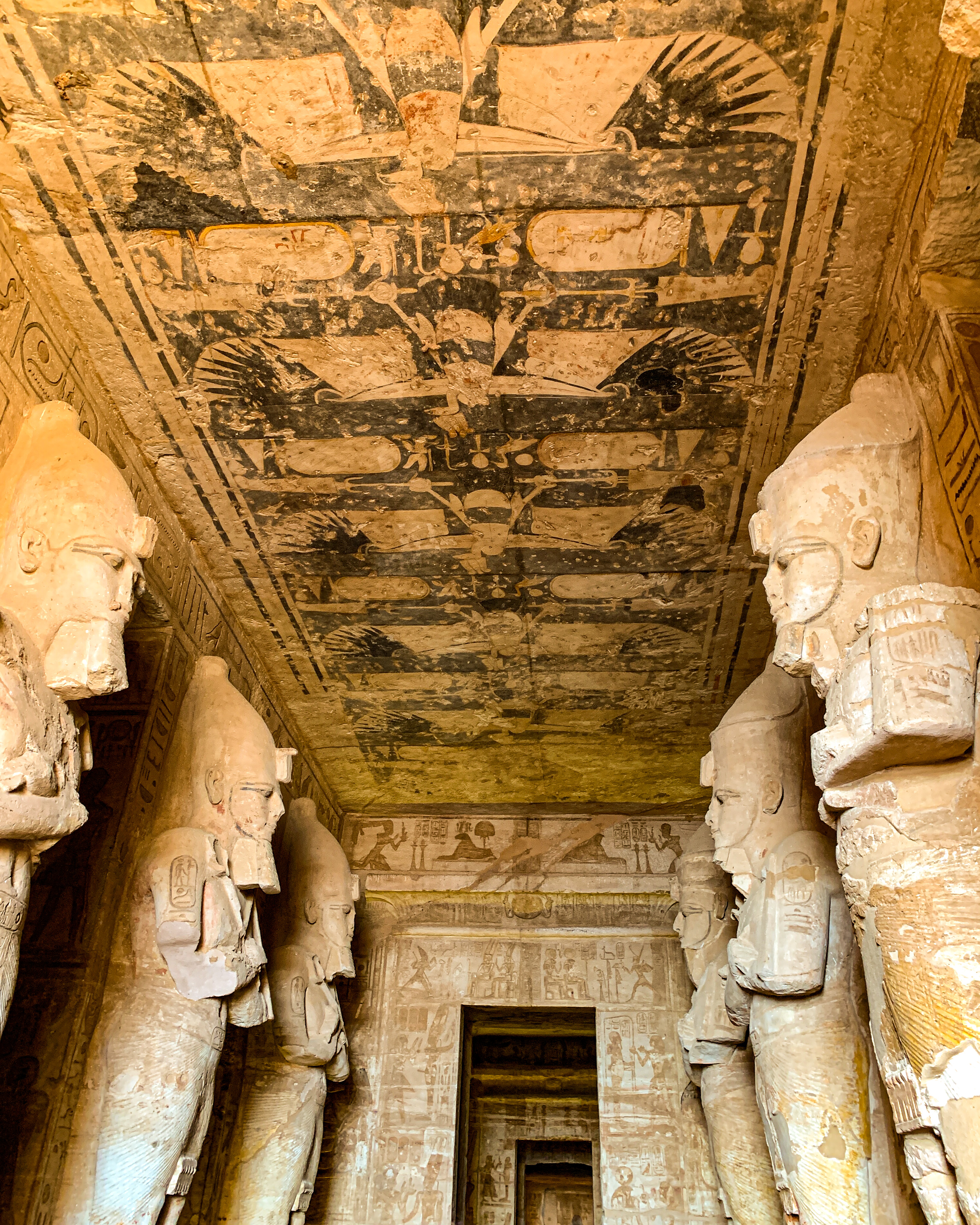 Apesar da grandeza já ser algo esperado das obras faraônicas, os templos de Abu Simbel impressionam a todos por terem sido escavados em rocha. A fachada do templo de Ramses II é composta por 4 estátuas de 20 metros de altura, que representam o faraó. Não menos surpreendente é a parte interna do templo. O salão hipostilo, o principal deles, é composto por oito estátuas enormes do Deus Osíris e todas as paredes internas do templo são cobertas de inscrições, muitas delas com as cores preservadas.