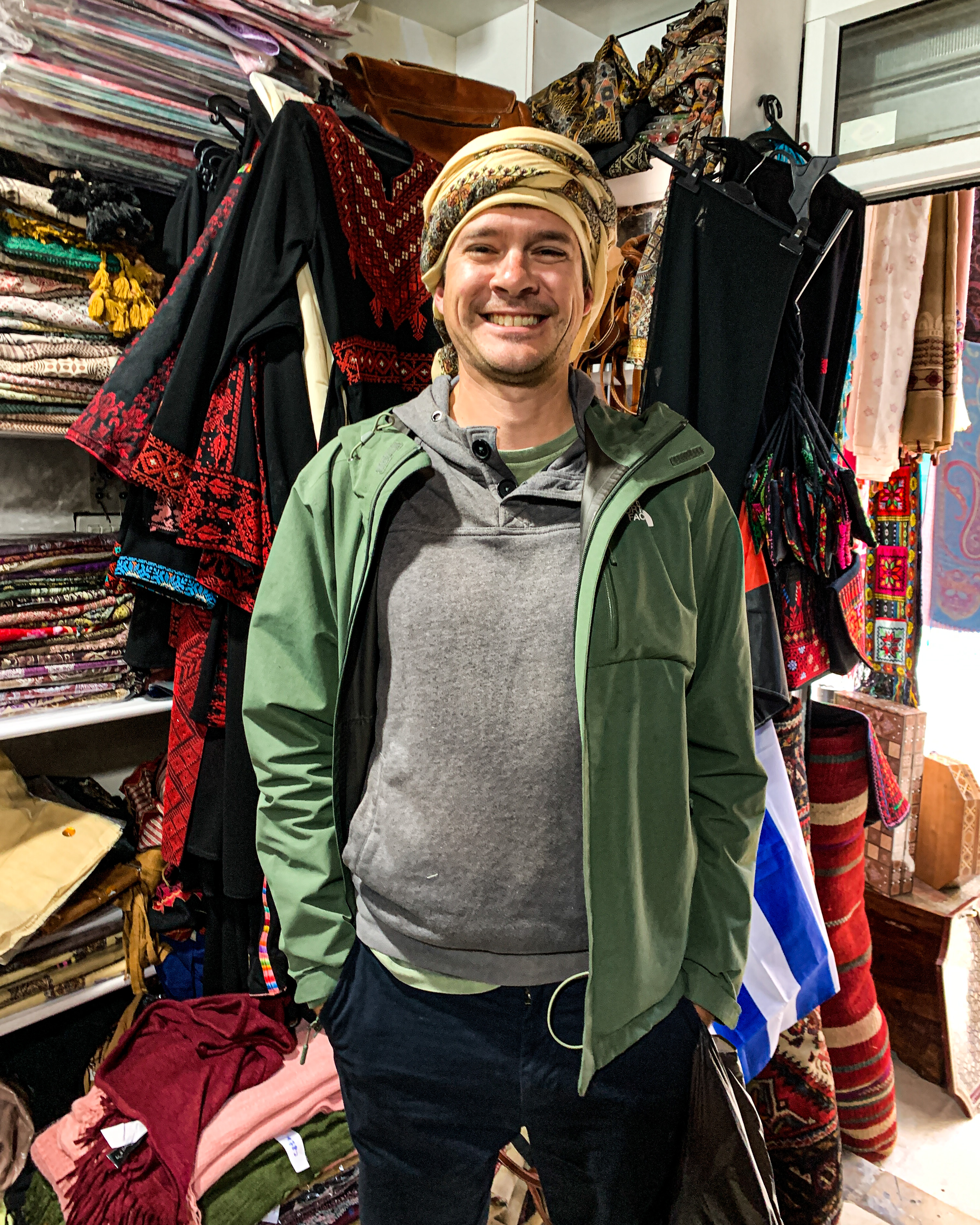 Almoçamos um shawarma (sanduíche árabe típico) ali perto e por volta das 14h voltamos até a igreja para comprar umas lembrancinhas. Nessa hora, a igreja já estava lotada. Ainda bem que fomos mais cedo! Saindo de lá, caminhamos pelo Souk, onde a mãe da Gabi ficou encantada com os lenços e levou uma coleção pro Brasil. 😅