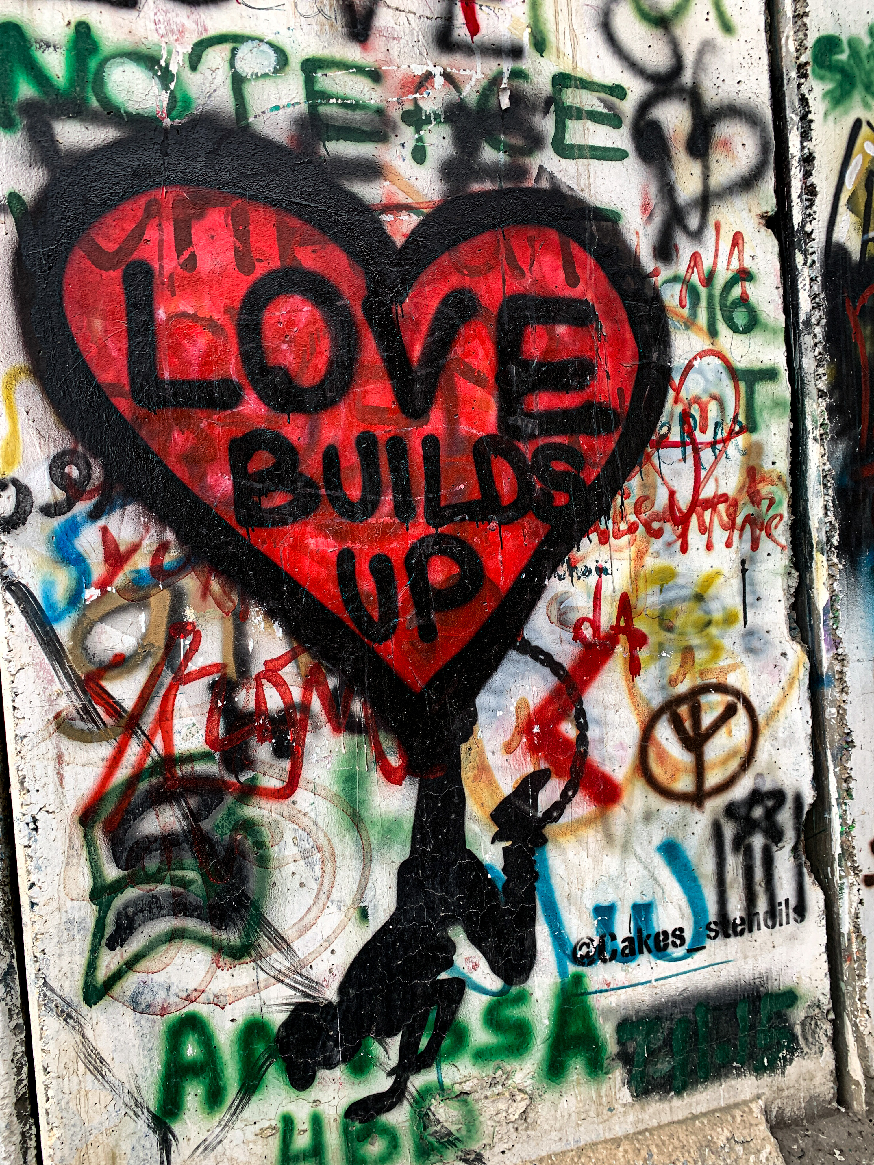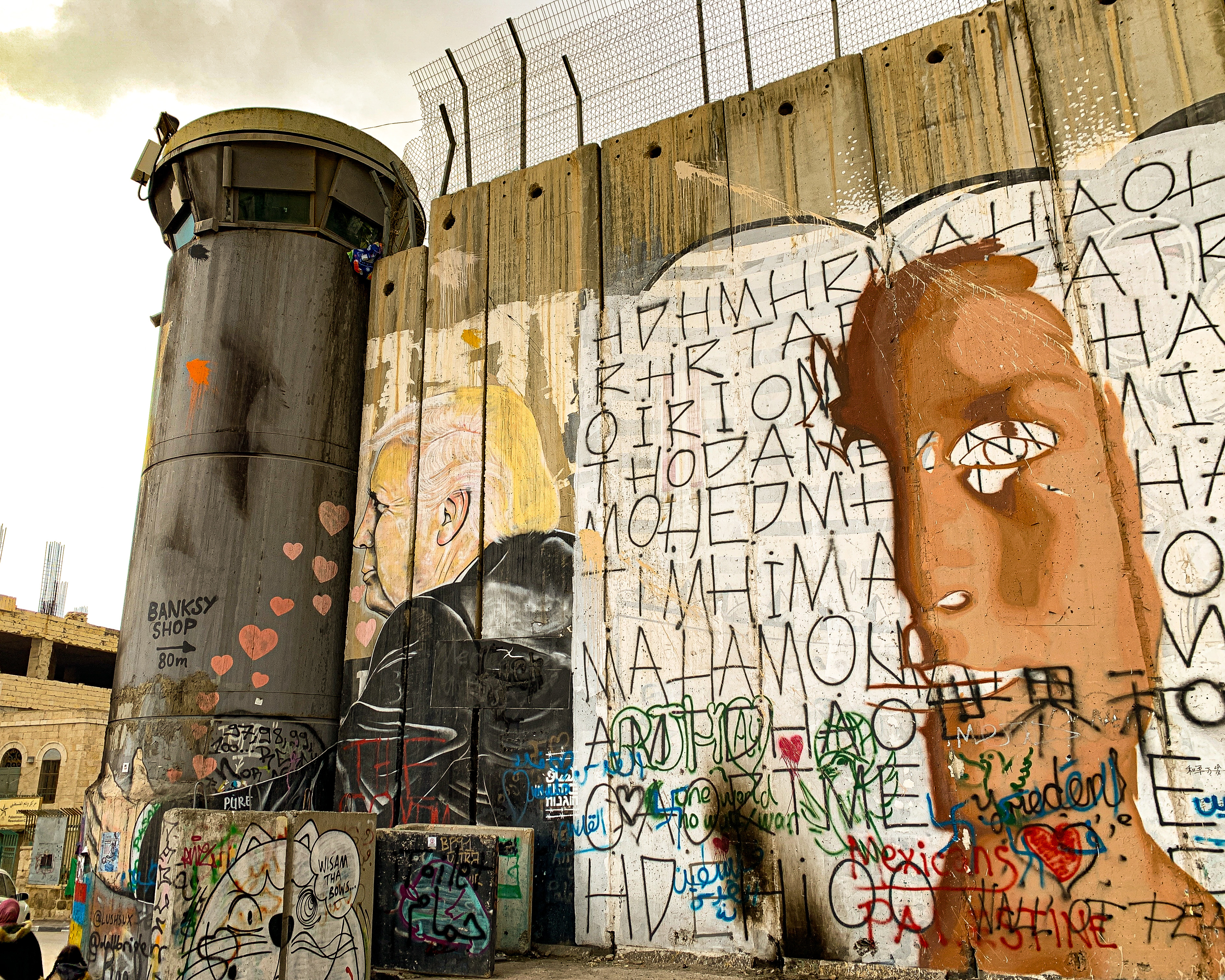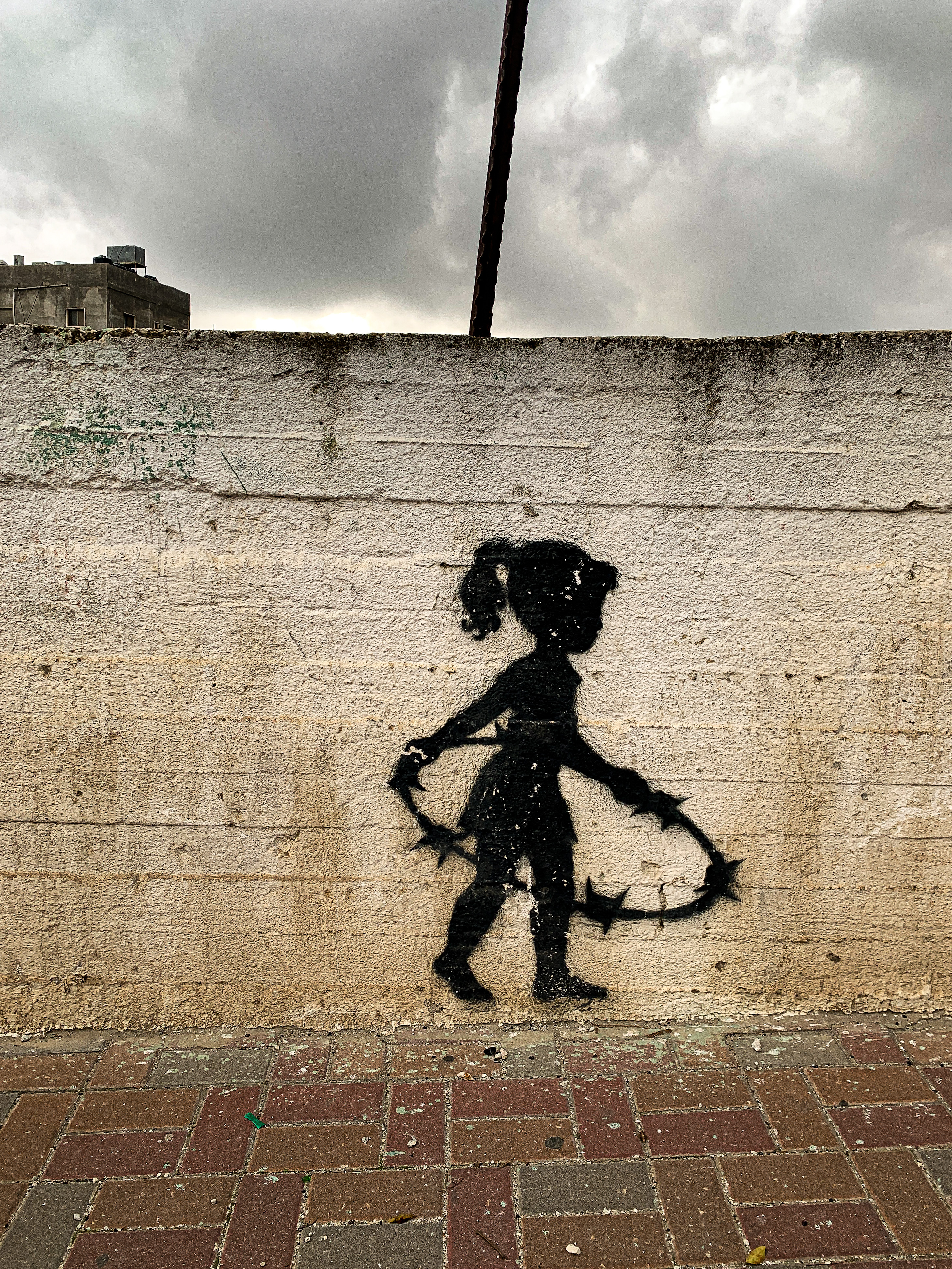 Saindo um pouco da parte histórica e religiosa, seguimos em direção aos muros que separam a Palestina de Israel, os quais são cobertos de graffiti e mensagens de protesto. Um dos grandes nomes é o do artista Banksy, o qual realizou alguns dos seus trabalhos mais icônicos ali. A proximidade com os muros e as torres de vigilância com policiais armados acabaram nos chocando ainda mais. Sem entrar no mérito de quem está certo, ver muros que lembram os de Berlim em pleno 2020 é muito triste! 😞