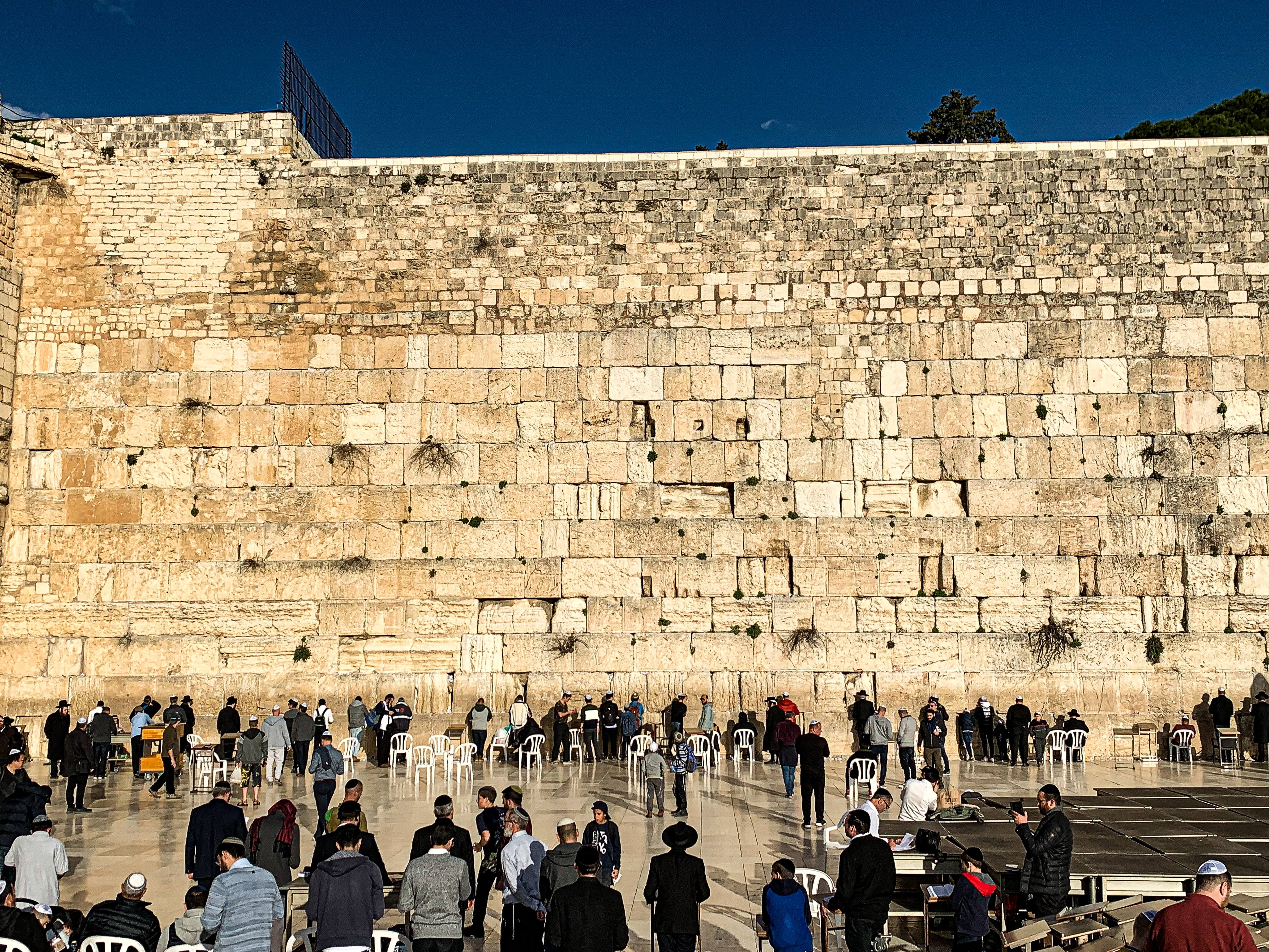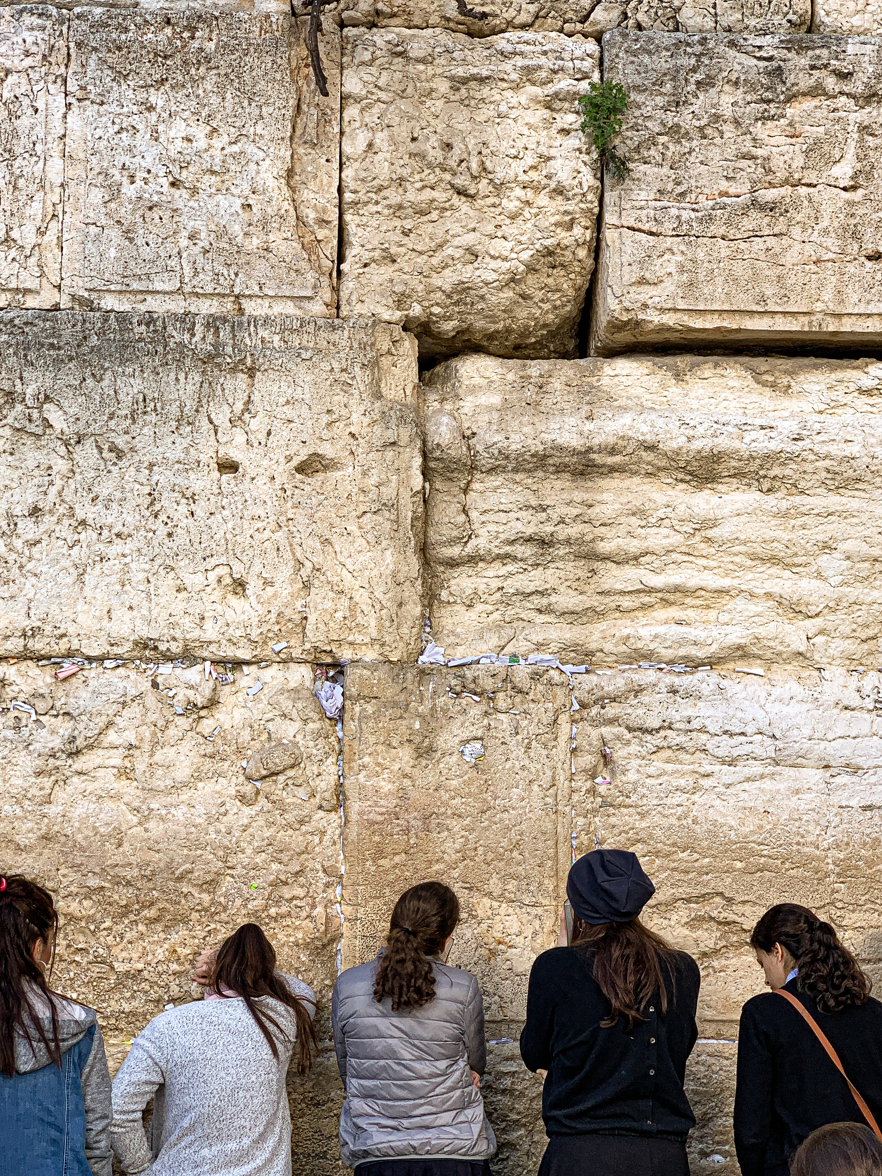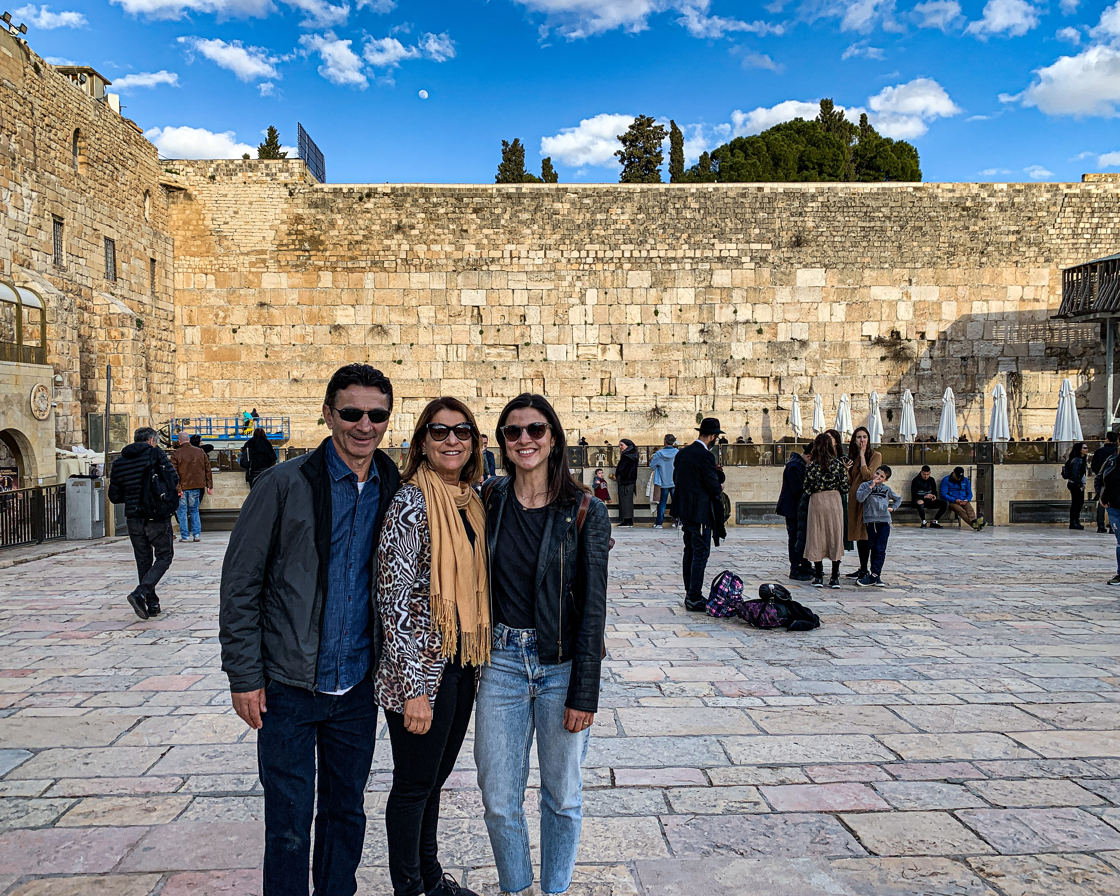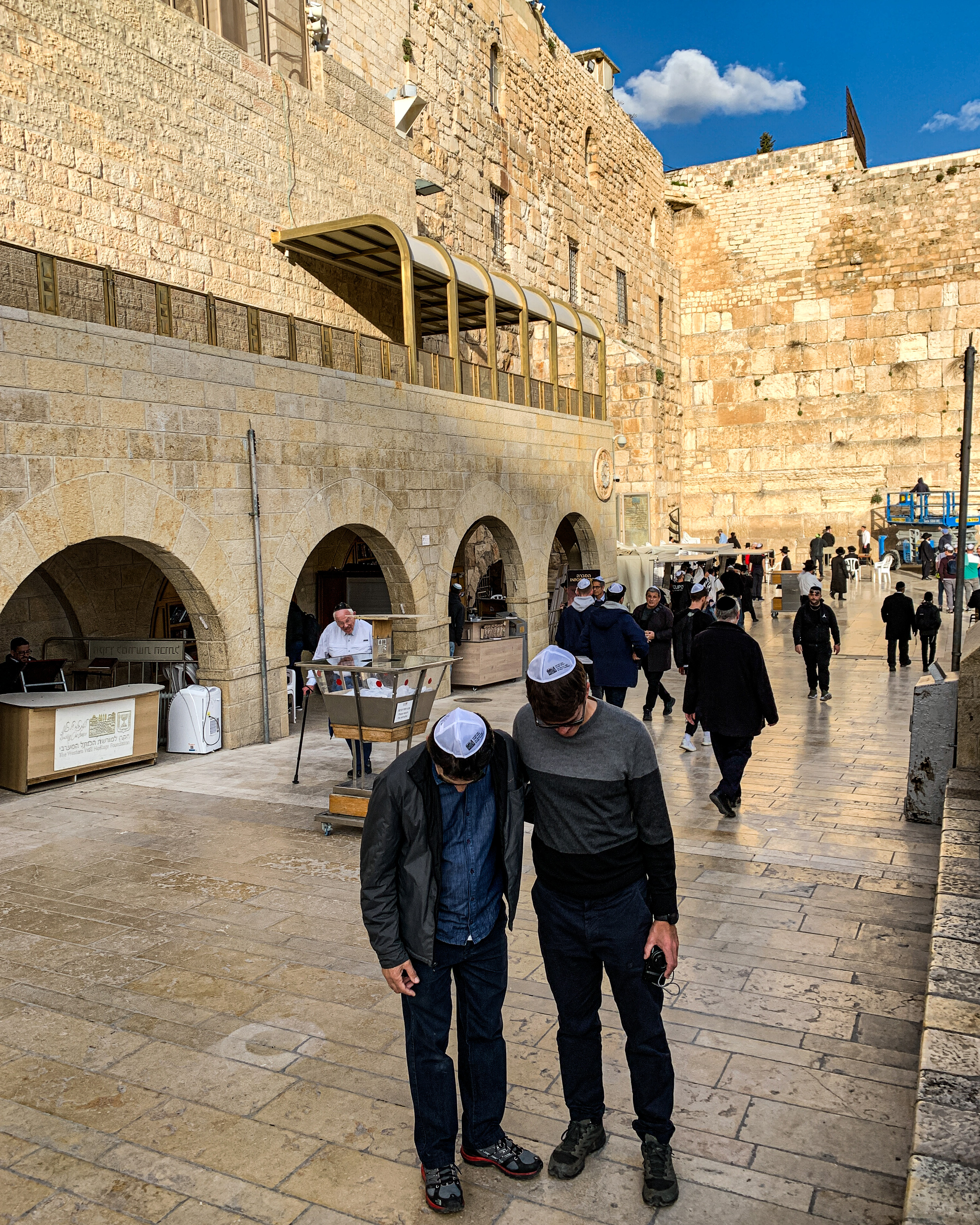 Apesar de cansados, faltava conhecer ainda um dos locais mais emblemáticos de Jerusalém, o Muro das Lamentações. Um pouco mais de história: o Muro das Lamentações é um pedaço da antiga estrutura do Templo de Salomão, o qual abrigava, entre outros, a famosa rocha onde Abraão teria sido testado por Deus e que hoje está sob a Cúpula Dourada. Assim, a importância desse muro milenar está diretamente ligada à rocha, a qual não pode ser acessada por judeus. Dessa forma, o Muro se tornou o local mais sagrado do judaísmo por ser o local mais próximo à rocha que os judeus tem acesso e podem orar livremente. 🤓