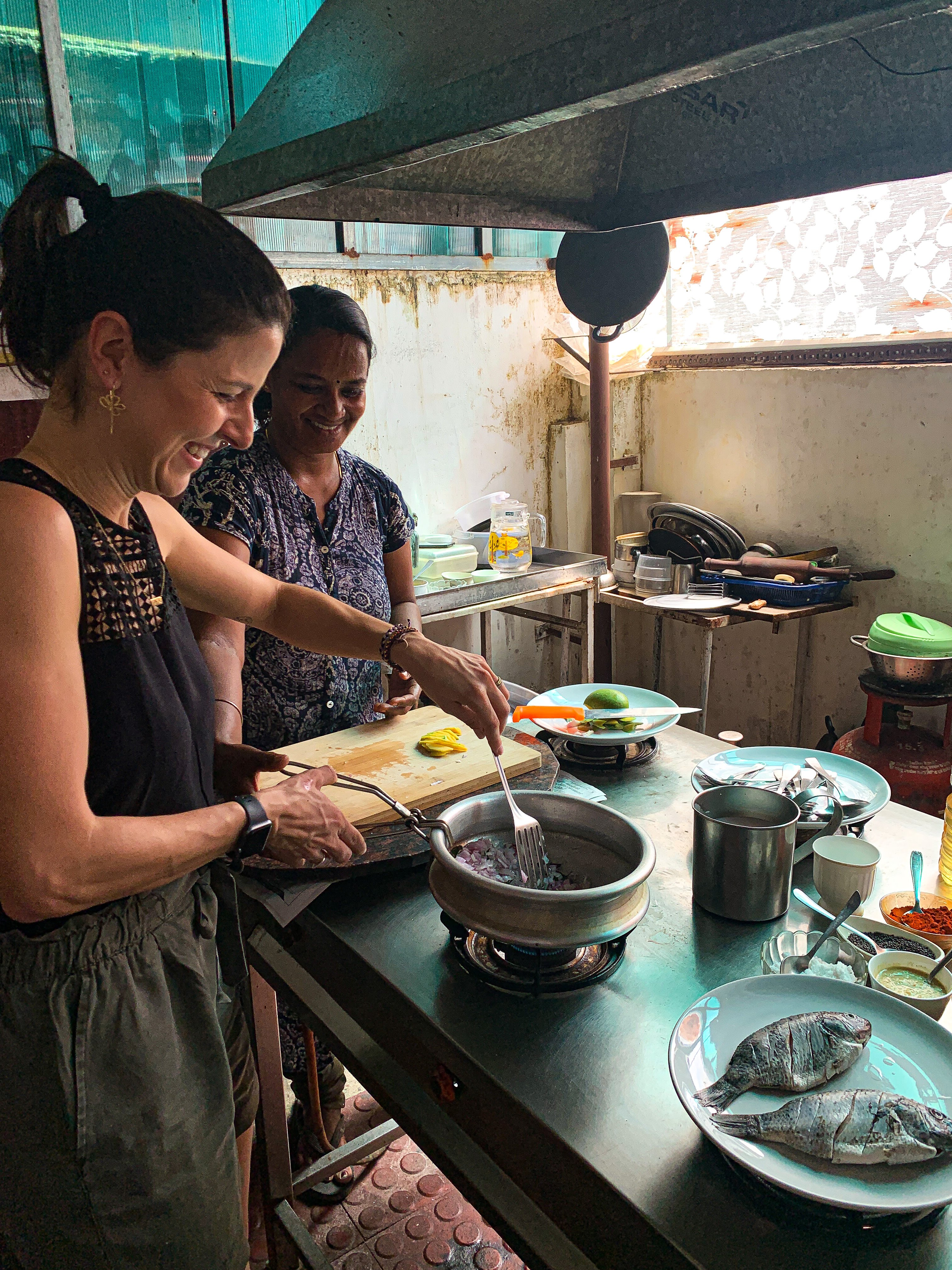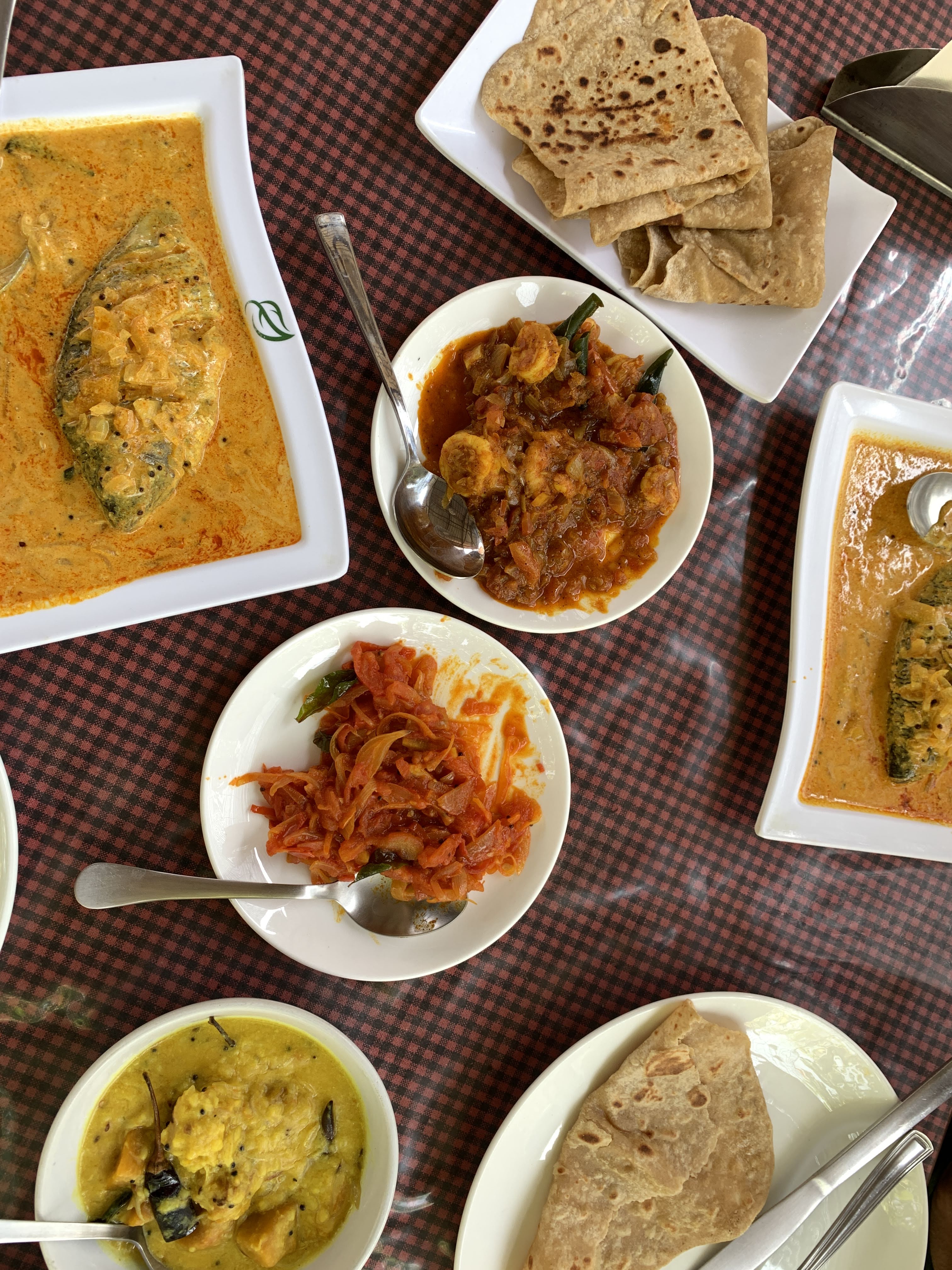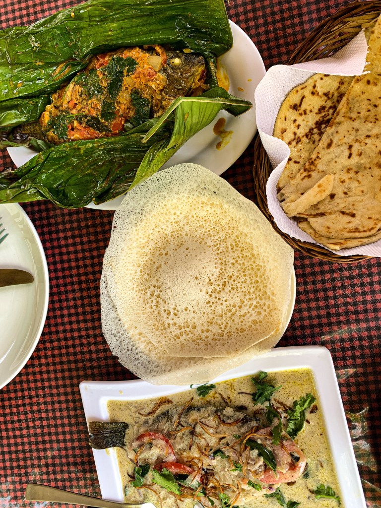 Por recomendação dos donos, comemos o Fish Pollichathu, um prato com peixe cozido com temperos na folha de bananeira, e Fish Molly, outro prato de peixe, dessa vez com molho à base de leite de coco. Dá água na boca só de lembrar! 😋 Gostamos tanto que resolvemos nos informar sobre a aula de culinária oferecida no local…