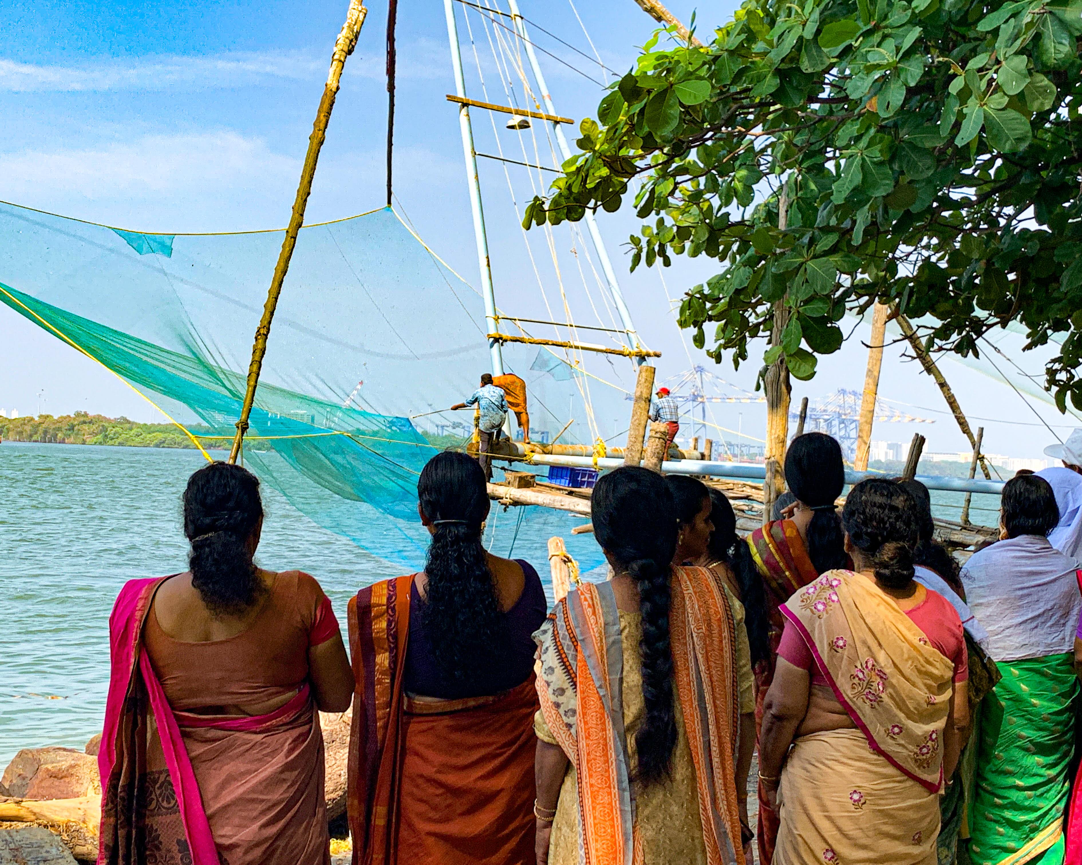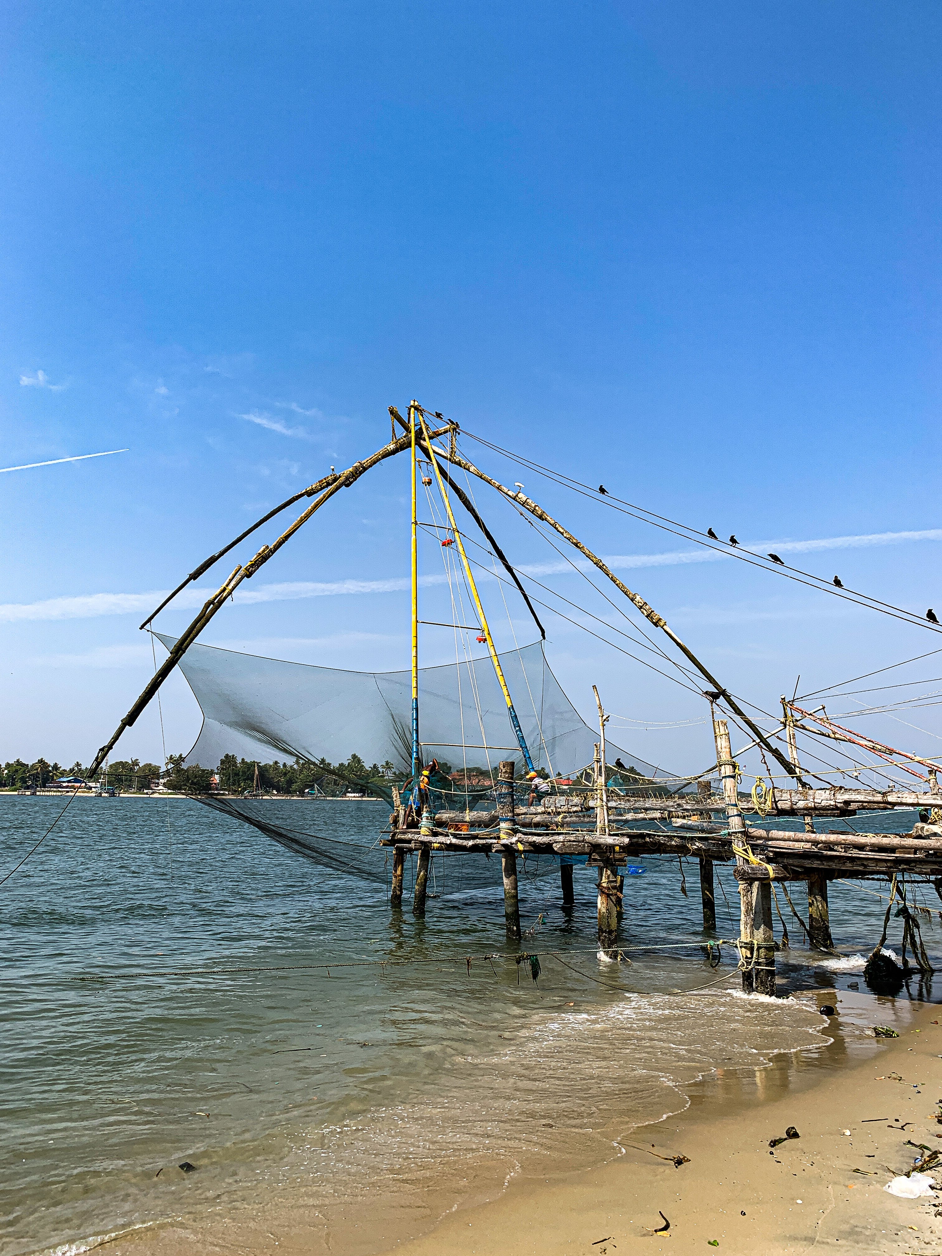 Para fazer a digestão, fomos caminhar à beira-mar e conhecer as famosas “chinese fishing nets”, redes de pesca centenárias em estilo chinês que são uma das atrações da cidade. As redes são grandes estruturas operadas por vários pescadores que ajudam a puxar a rede do mar através de um sistema de cordas, pedras e roldanas. Interessante! O calor e a umidade eram grandes e então logo voltamos pro hostel pra descansar um pouco e tomar um novo banho. À noite, fomos jantar no Fusion Bay e novamente nos deliciamos com a culinária local. Dessa vez, lula, camarão masala (molho indiano à base de tomate) e berinjela com molho de iogurte. Sensacional! Se toda comida indiana for assim, nossos dias serão muito felizes! 😁