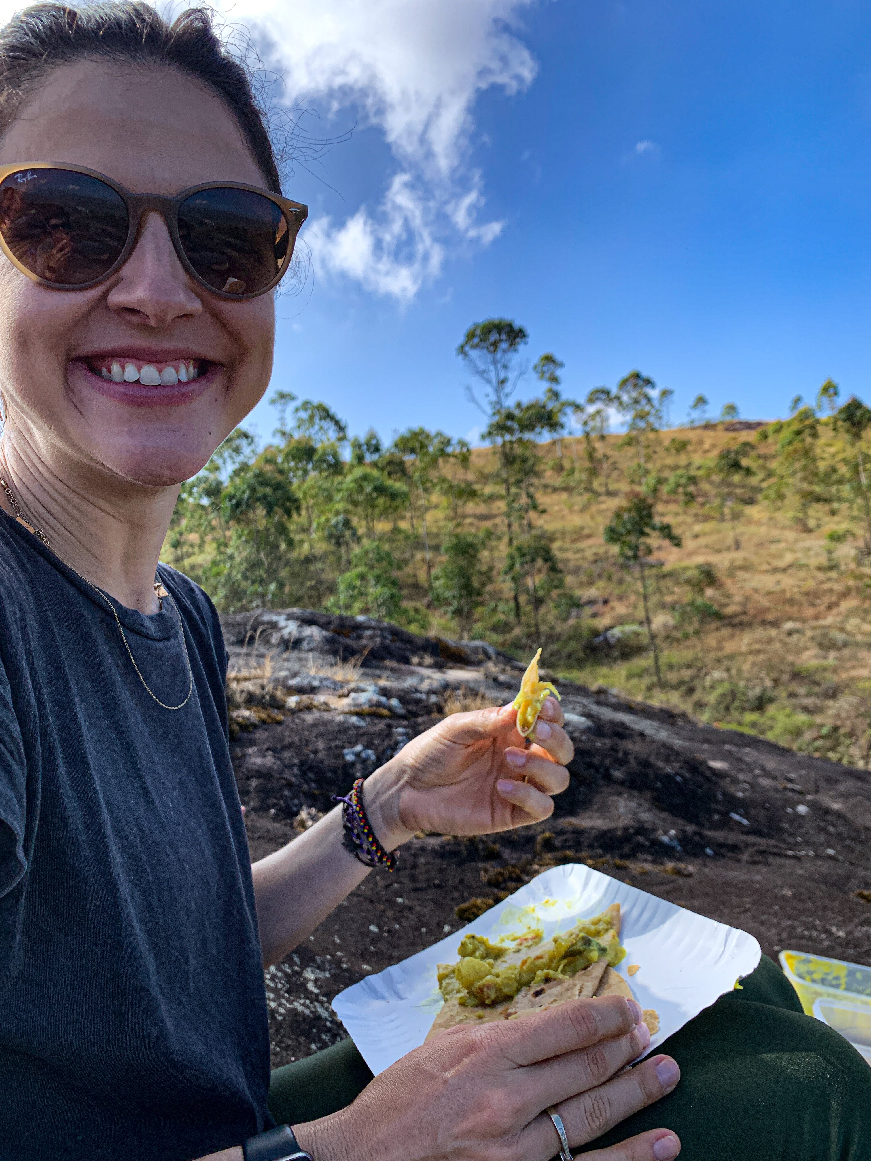 Voltando ao trekking, paramos em um lindo mirante no alto da montanha para o nosso merecido café da manhã. Seguindo a tradição indiana, tivemos chapati e curry de batatas, tudo preparado pela esposa do nosso guia. Isso mesmo, o café da manhã deles mais parece o nosso almoço. 😅 Não sei se era a fome, mas comemos super bem! Como sobremesa, abacaxi e banana. 😋