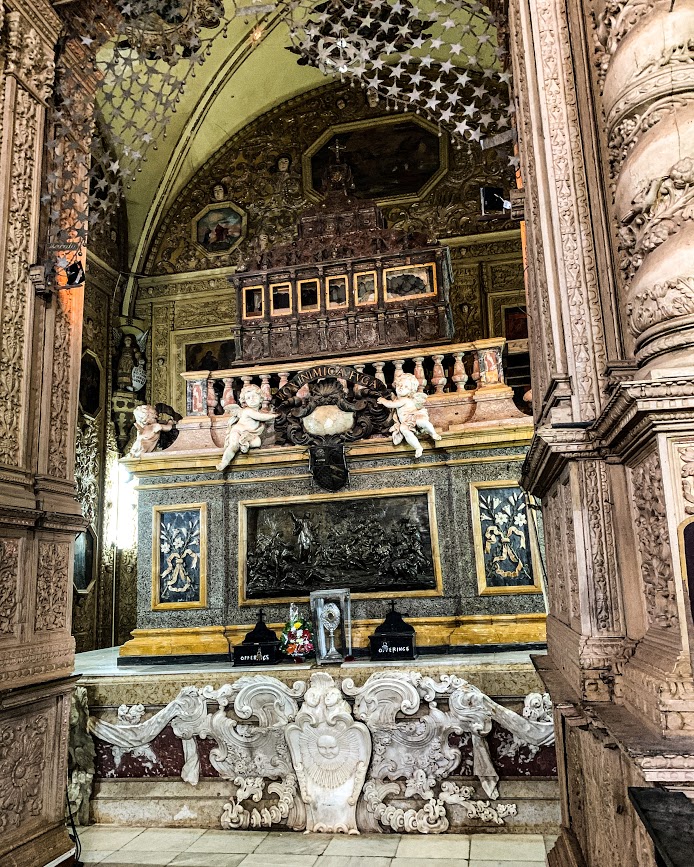 A poucos metros da Sé, está a Basílica de Bom Jesus. Essa igreja é famosa por conter o túmulo e os restos mortais de São Francisco Xavier, conhecido como o apóstolo das Índias, por seu trabalho missionário na região. As duas últimas fotos abaixo mostram respectivamente o túmulo e os restos mortais, que se encontram dentro de um caixão de prata, guardado por dois anjos no altar do mausoléu. A basílica é da mesma época que a Catedral da Sé, início do século 17, mas ao contrário da vizinha, sua fachada e altar chamam mais atenção pelos detalhes arquitetônicos.
