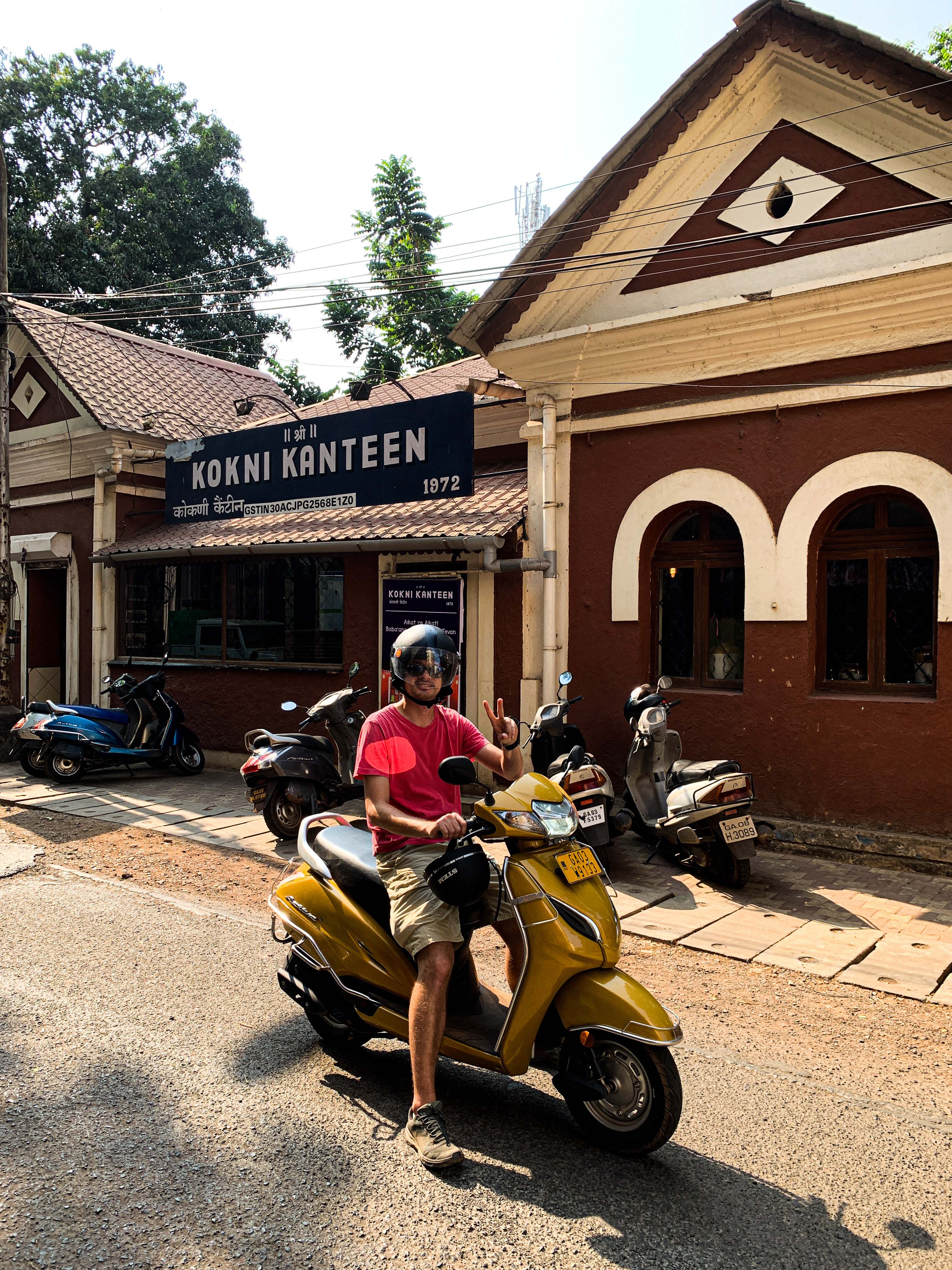Depois de conhecer as igrejas, fomos em direção ao bairro de Fontainhas, tido como o mais português da cidade. A ideia era almoçar algo português, mas o restaurante que tínhamos listado não estava aberto para almoço. Por fim, acabamos em um lugar chamado Kokni Kanteen, que estava lotado e tem como especialidade o Thali (seleção de vários pequenos molhos servido com arroz ou chapati) de frutos do mar. A comida estava um pouco apimentada demais, mas bem gostosa mesmo assim.