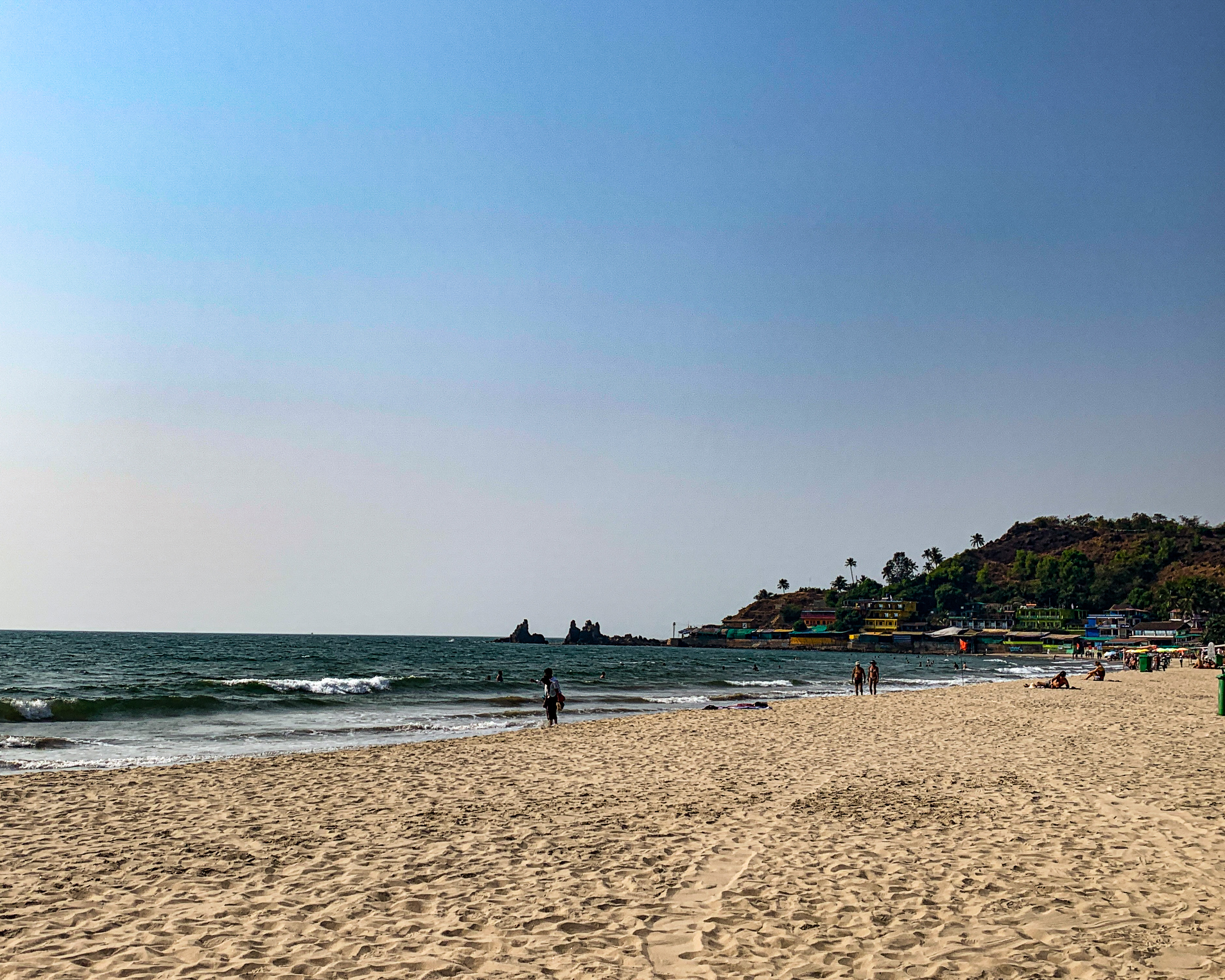 O último dia por Goa foi dedicado inteiramente às praias. Já experientes 🙄, alugamos a moto novamente e fomos explorar algumas praias da região sugeridas pelo gerente do hostel. A primeira parada foi em Arambol Beach, tido como um reduto hippie e barato para viajantes. A praia não é lá essas coisas, mas escolhemos um dos vários bares de praia e ficamos ali relaxando algumas horas. Ainda demos uma passada rápida pelo hippie market (feirinha local) e depois seguimos em direção a Mandrem Beach. Mandrem é muito mais tranquila e bonita que Arambol, mas acabamos ficando pouco pois já era um pouco tarde e tínhamos outro plano para o pôr do sol.