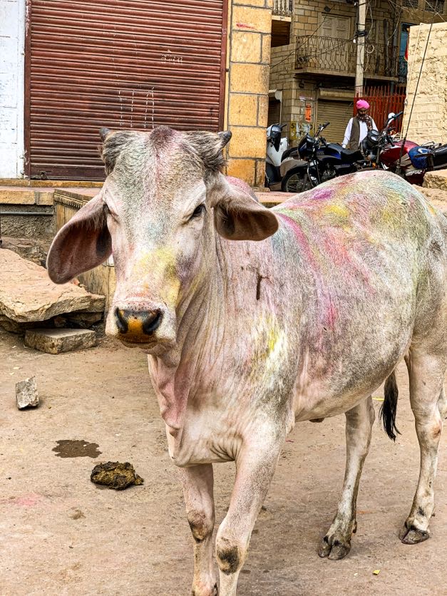 Tínhamos um total de 1,5 dia em Jaisalmer e então focamos nas atrações principais. Quando saímos da pousada, a cidade ainda amanhecia preguiçosa depois das celebrações da noite anterior e os resquícios do Holi estavam por toda a parte, inclusive nos animais. 😬😅