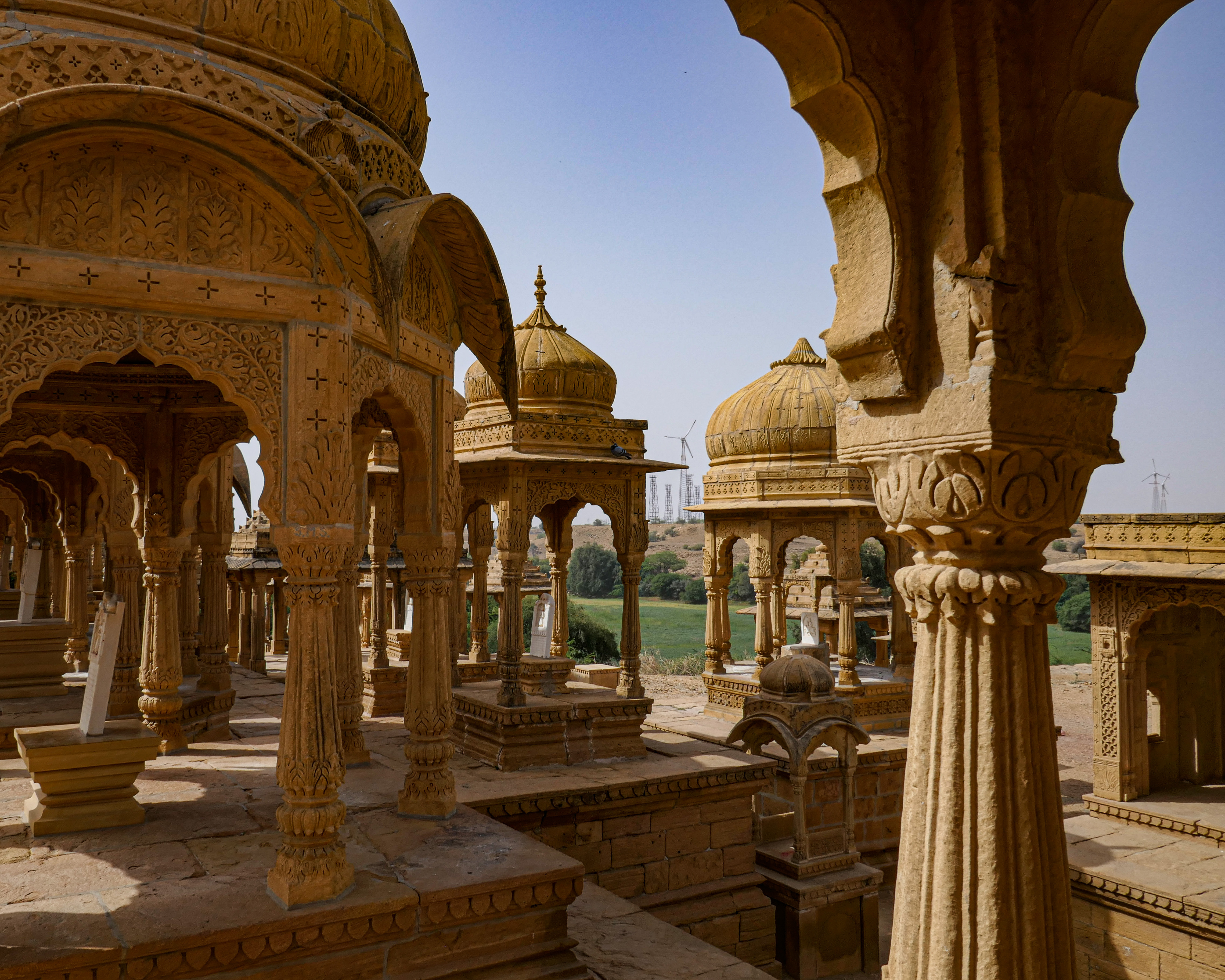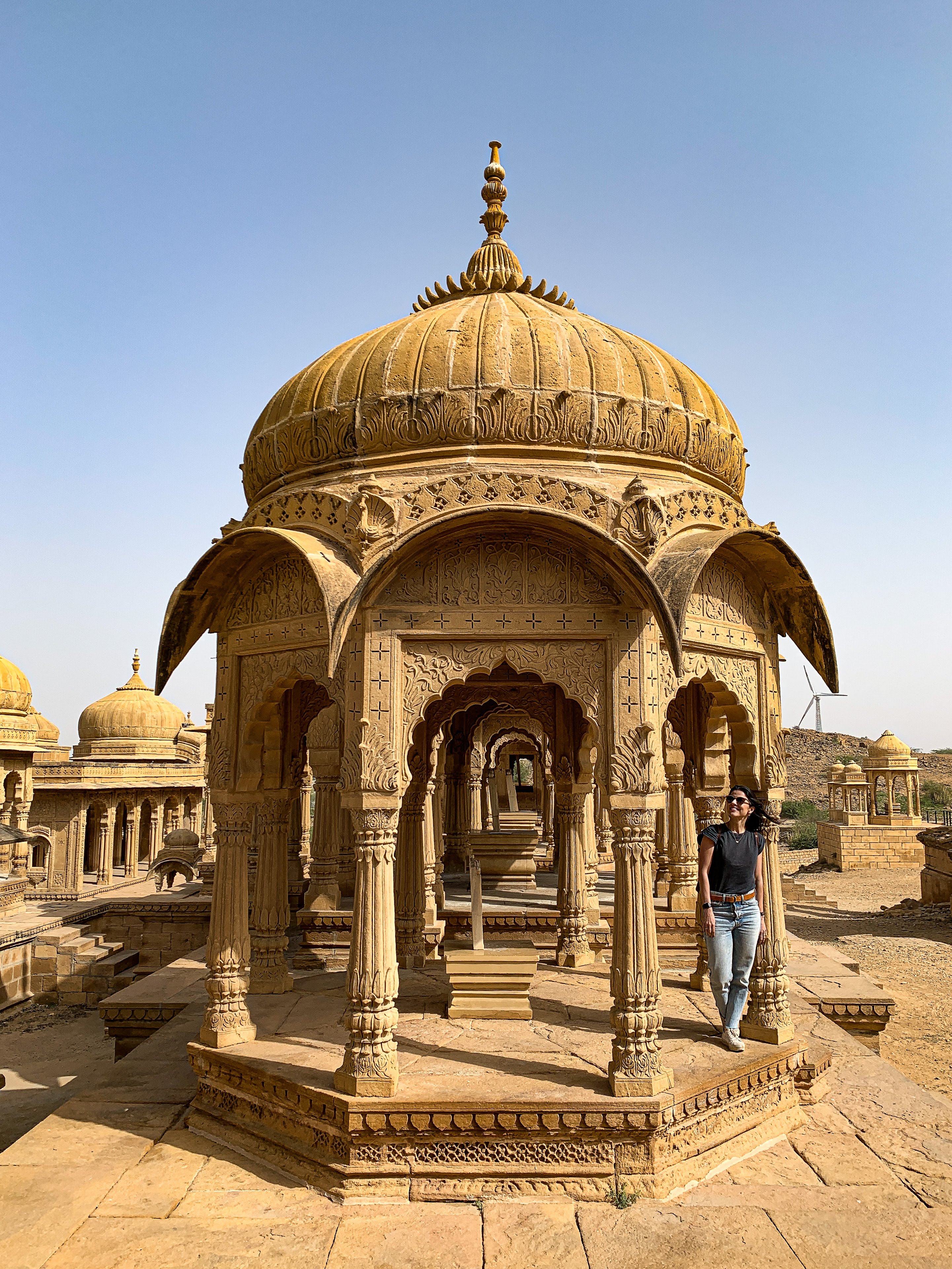 No dia seguinte, tínhamos mais algumas horas antes de partir e pegamos um tuktuk para otimizar o tempo. Fomos primeiro até um local chamado Bada Bagh, onda estão dezenas de cenotáfios, que são uma espécie de mausoléu / memorial fúnebre em homenagem a uma pessoa que não está enterrada ali. Os cenotáfios de Bada Bagh são em homenagem aos reis, rainhas, príncipes e outros membros da família real do estado de Jaisalmer desde o séculos 18 até à independência indiana. O local é icônico e rende ótimas fotos.
