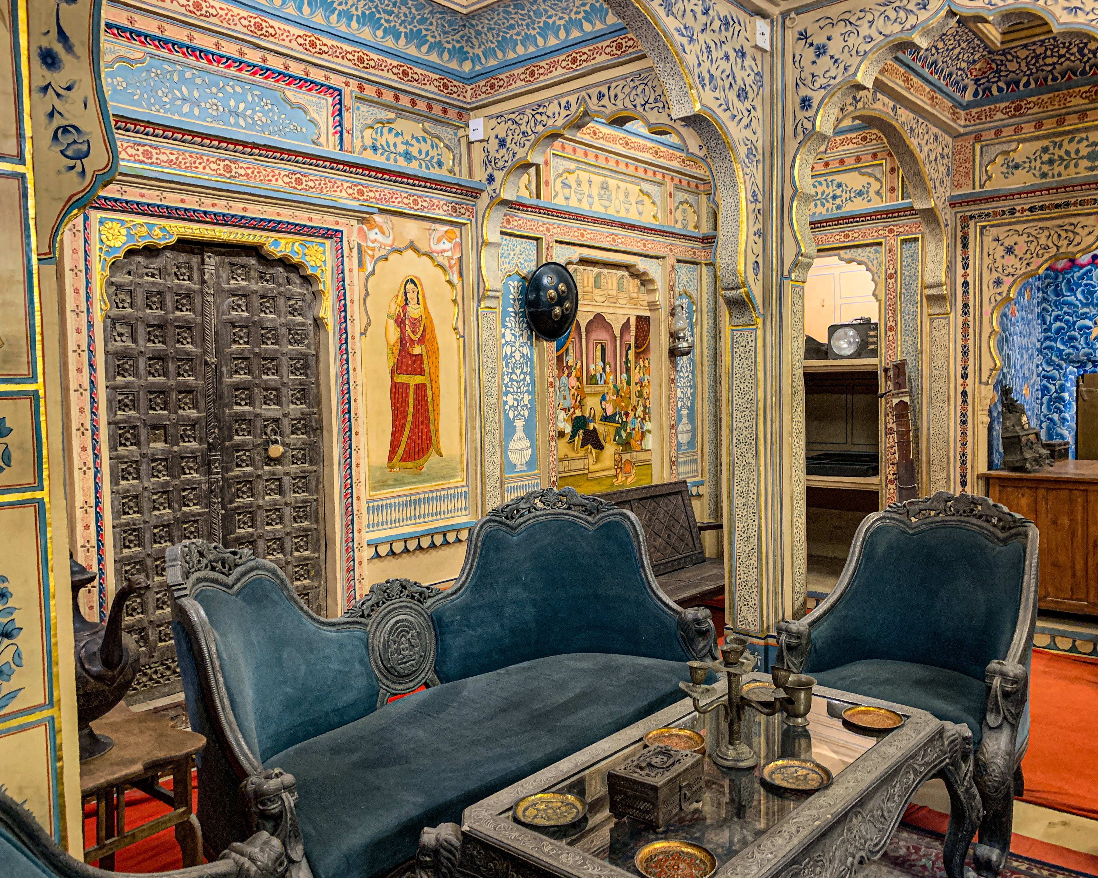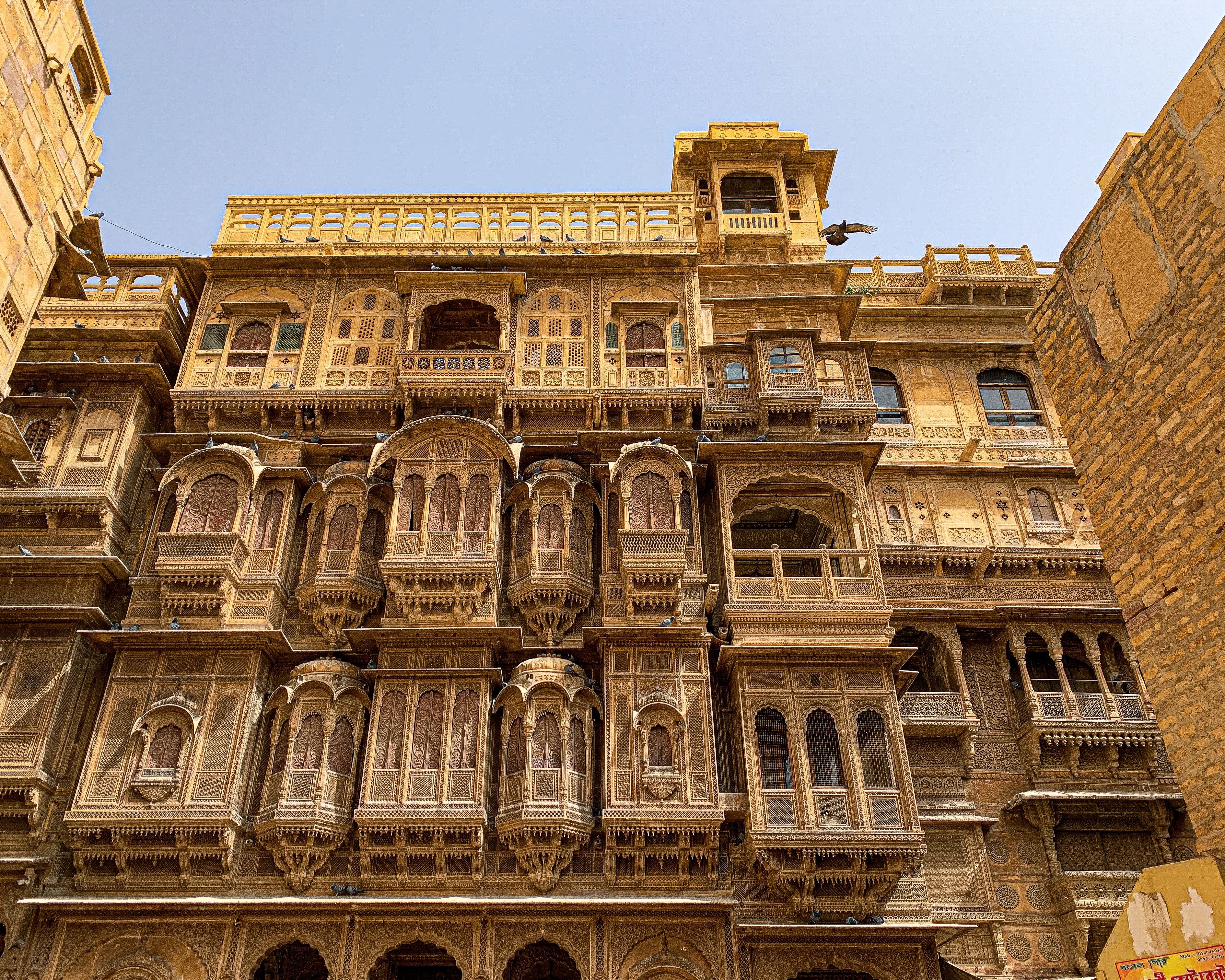 Para fechar o passeio rápido por Jaisalmer, fomos conhecer um dos vários Havelis (mansões) históricos que embelezam as ruelas da cidade, tanto dentro quanto fora do forte. O maior e mais emblemático é o Patwa Haveli, construído por uma família de um comerciante jainista. A fachada é toda em pedra trabalhada e o interior foi convertido em um museu. O terraço permite algumas das melhores vistas para o Forte de Jaisalmer. 🤩