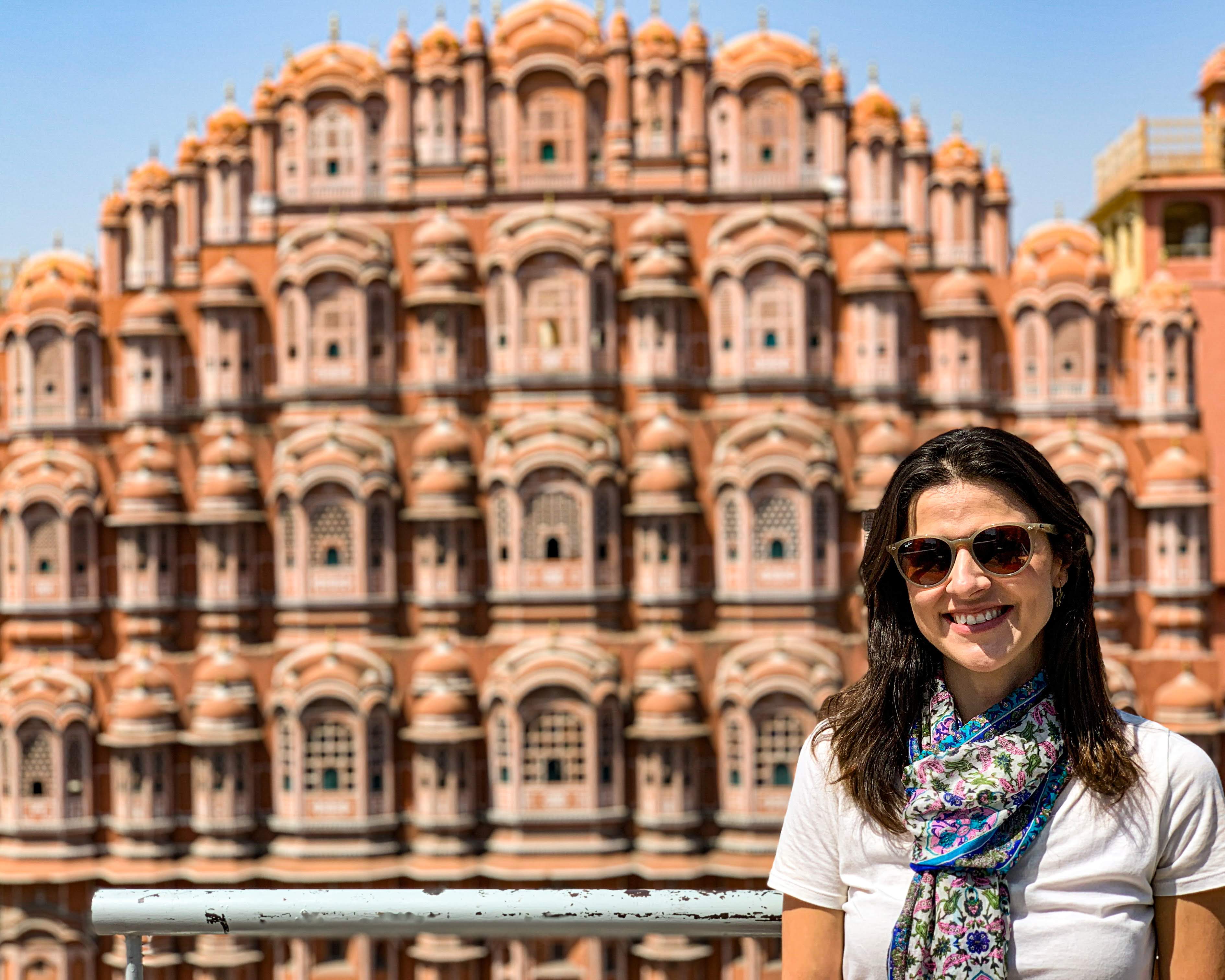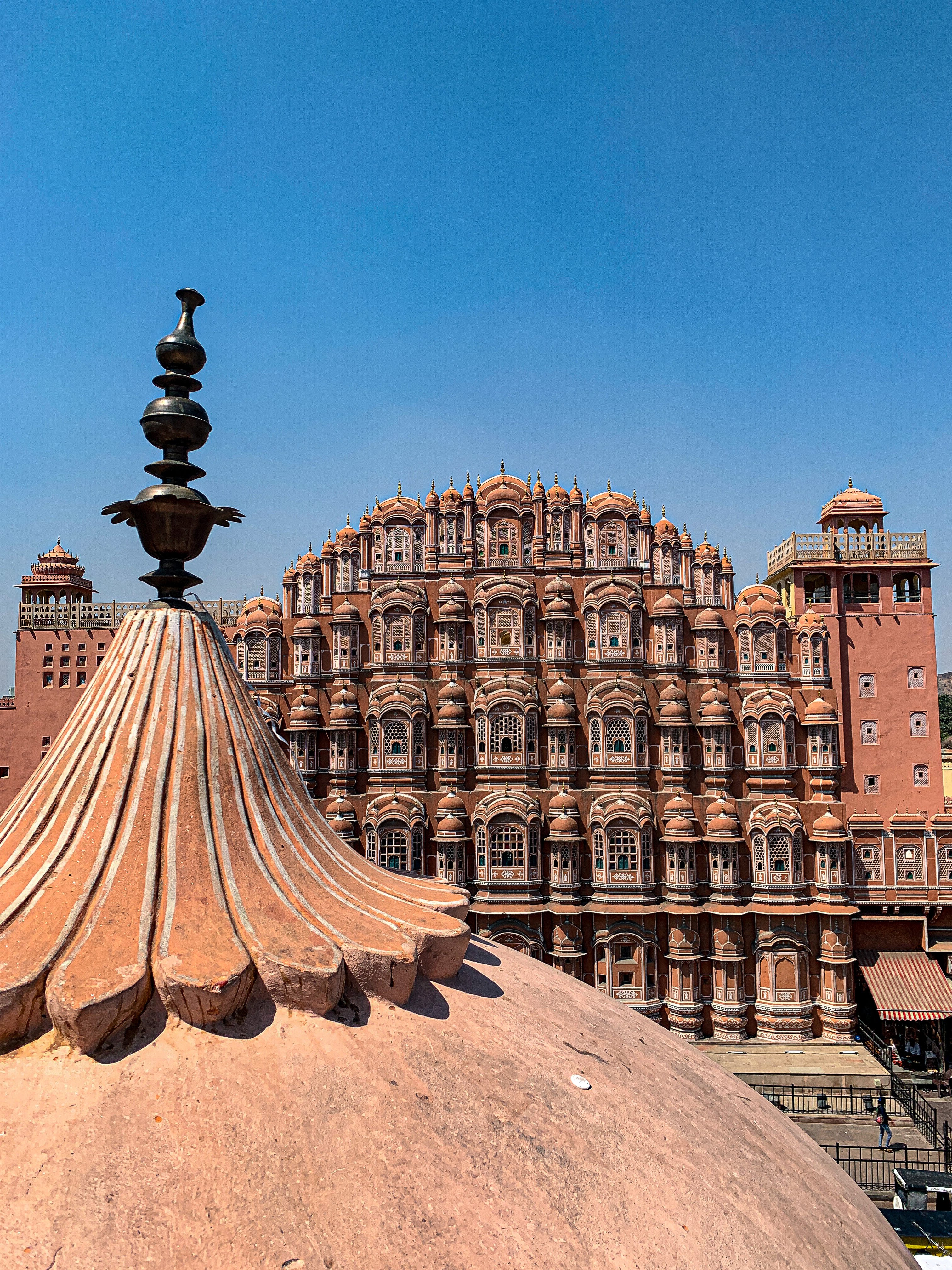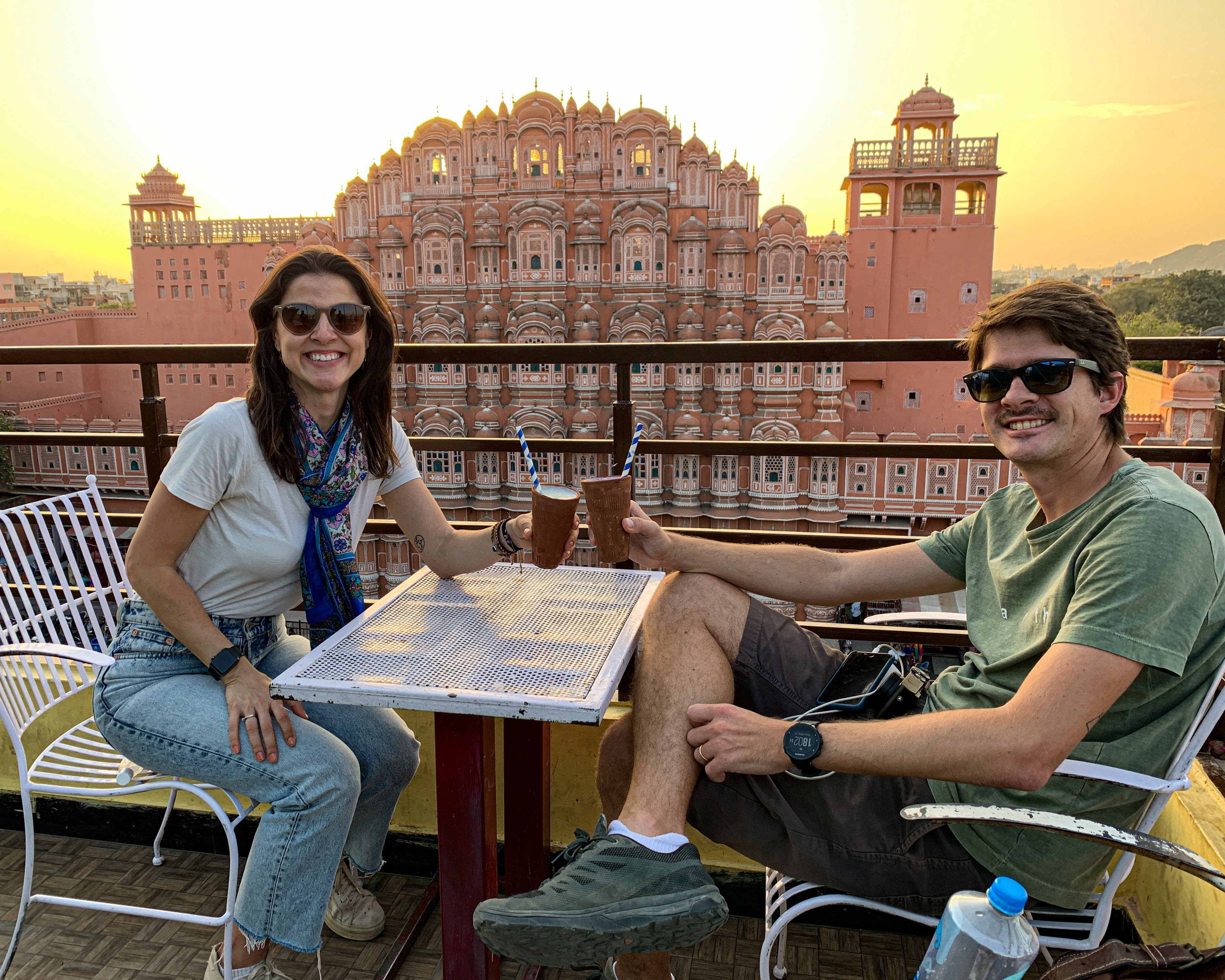 Para fechar a tarde, fomos tomar um lassi (bebida típica indiana à base de iogurte e frutas) de frente para o monumento mais icônico de Jaipur: o Hawa Mahal. De arquitetura única, com suas dezenas de varandas, esse prédio foi inicialmente construído para servir de ponto de observação de procissões e desfiles para as mulheres da família real, as quais não podiam ser vistas em público. Hoje, esse edifício tornou-se o símbolo da cidade por conta de seu estilo diferenciado e a cor tradicional que representa Jaipur, o rosa. 😊