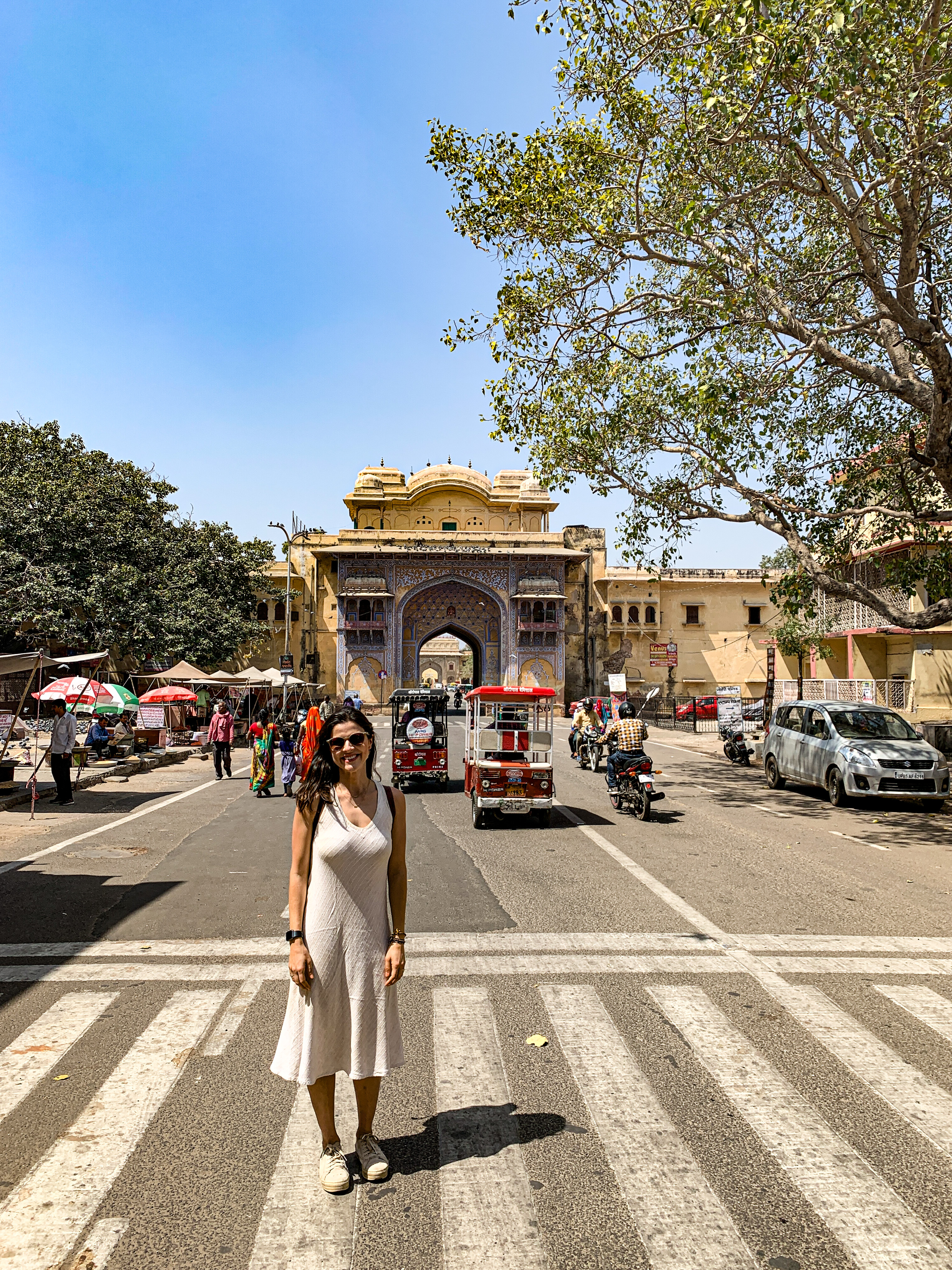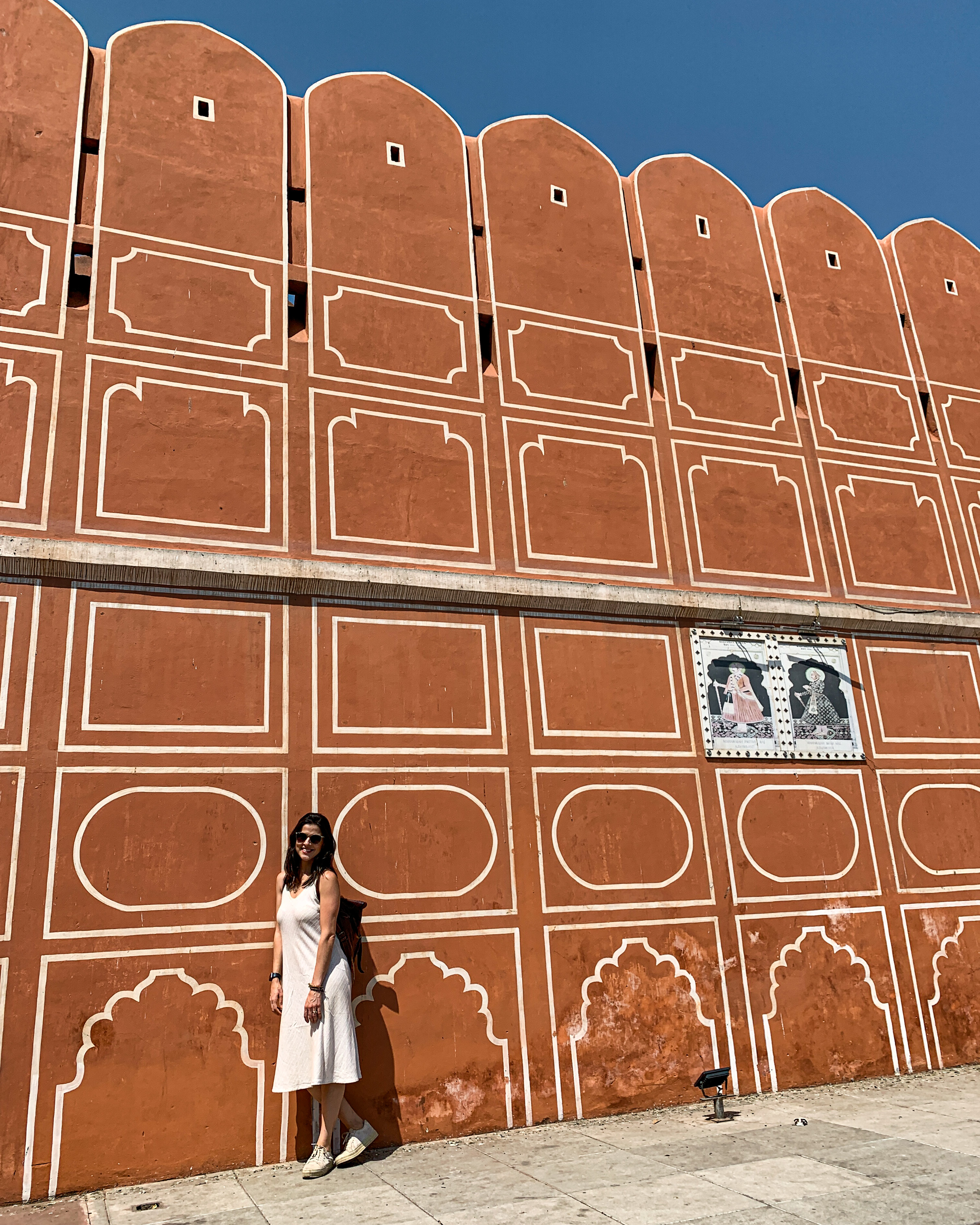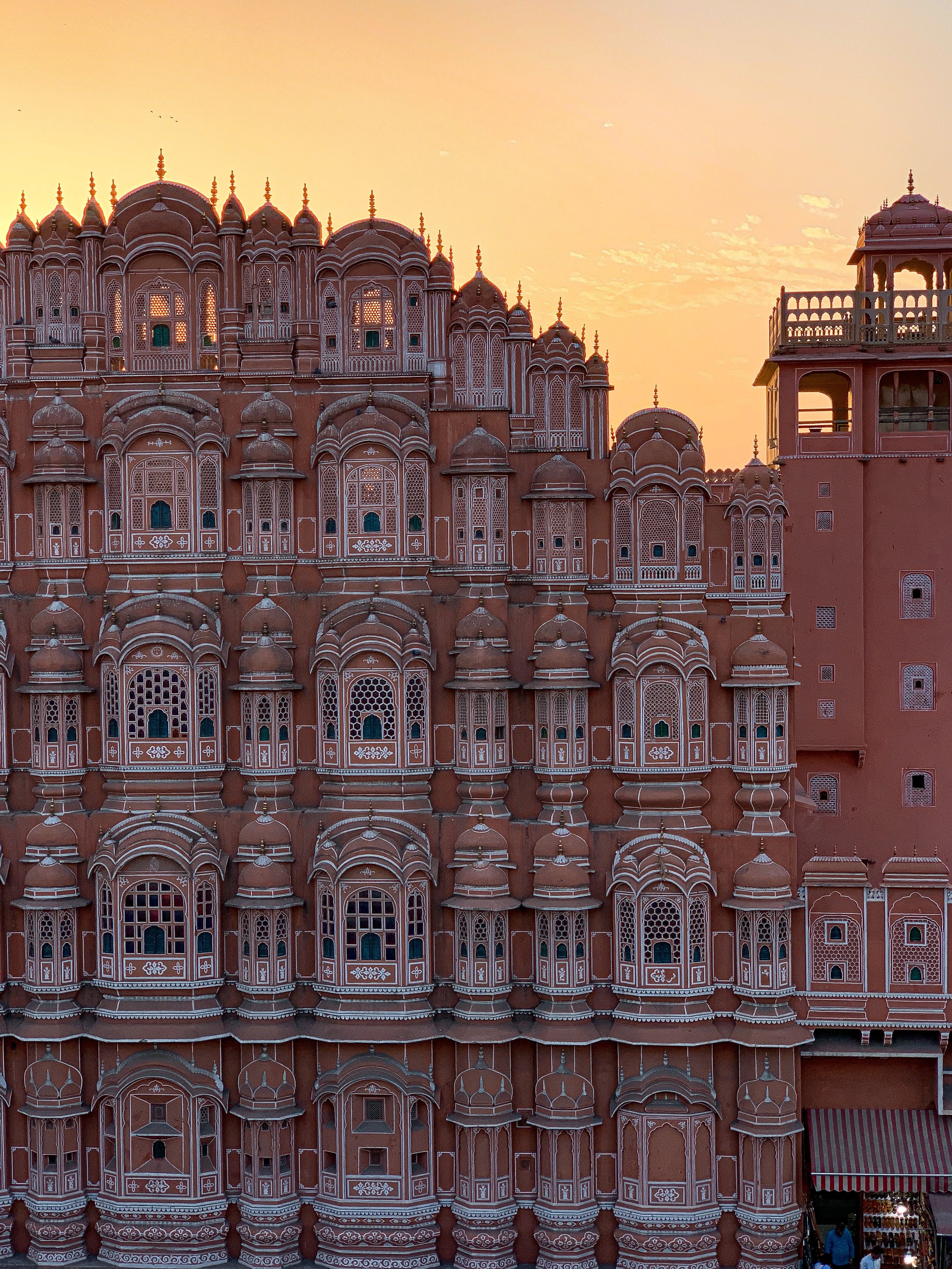 Para fechar a tarde, fomos tomar um lassi (bebida típica indiana à base de iogurte e frutas) de frente para o monumento mais icônico de Jaipur: o Hawa Mahal. De arquitetura única, com suas dezenas de varandas, esse prédio foi inicialmente construído para servir de ponto de observação de procissões e desfiles para as mulheres da família real, as quais não podiam ser vistas em público. Hoje, esse edifício tornou-se o símbolo da cidade por conta de seu estilo diferenciado e a cor tradicional que representa Jaipur, o rosa. 😊