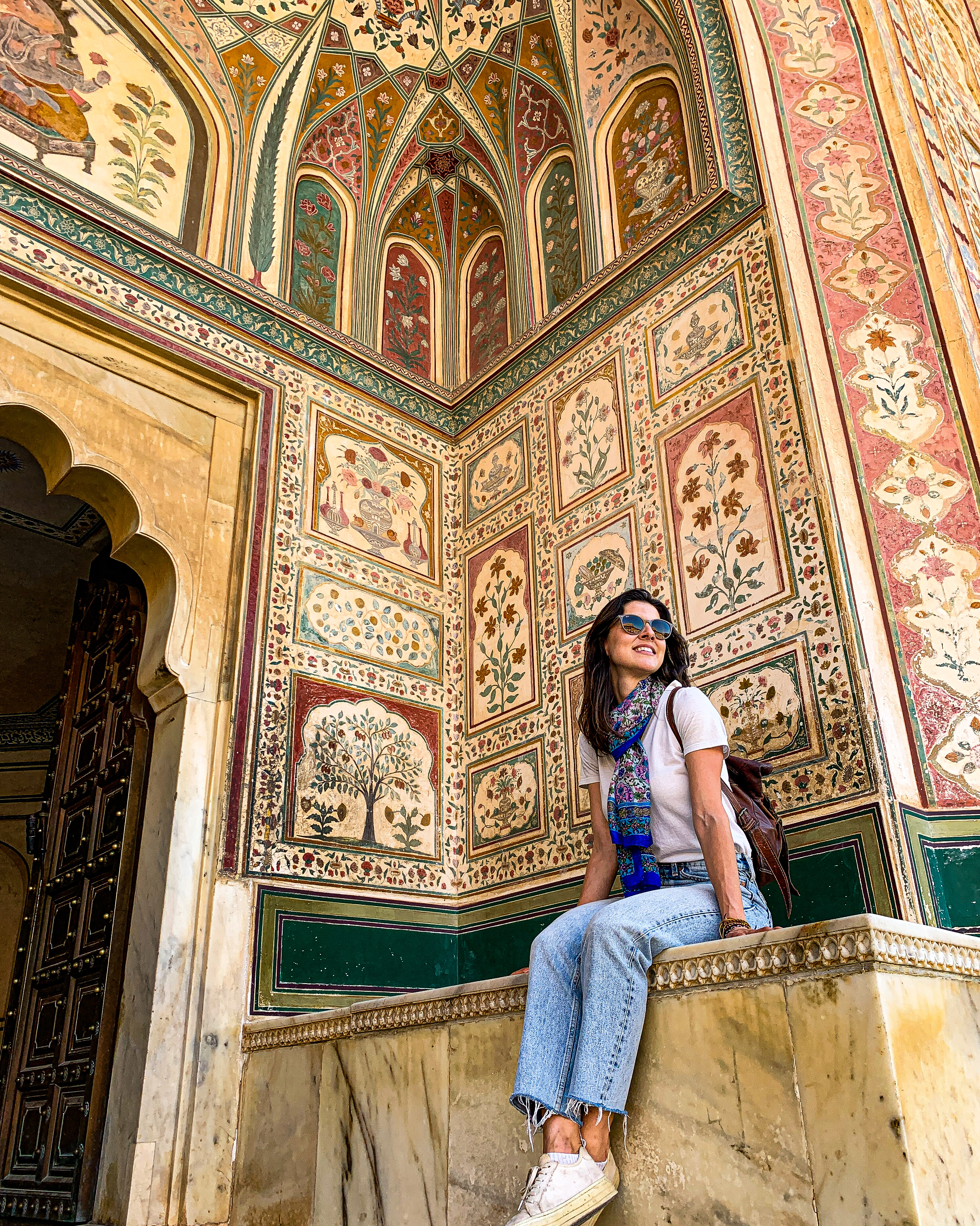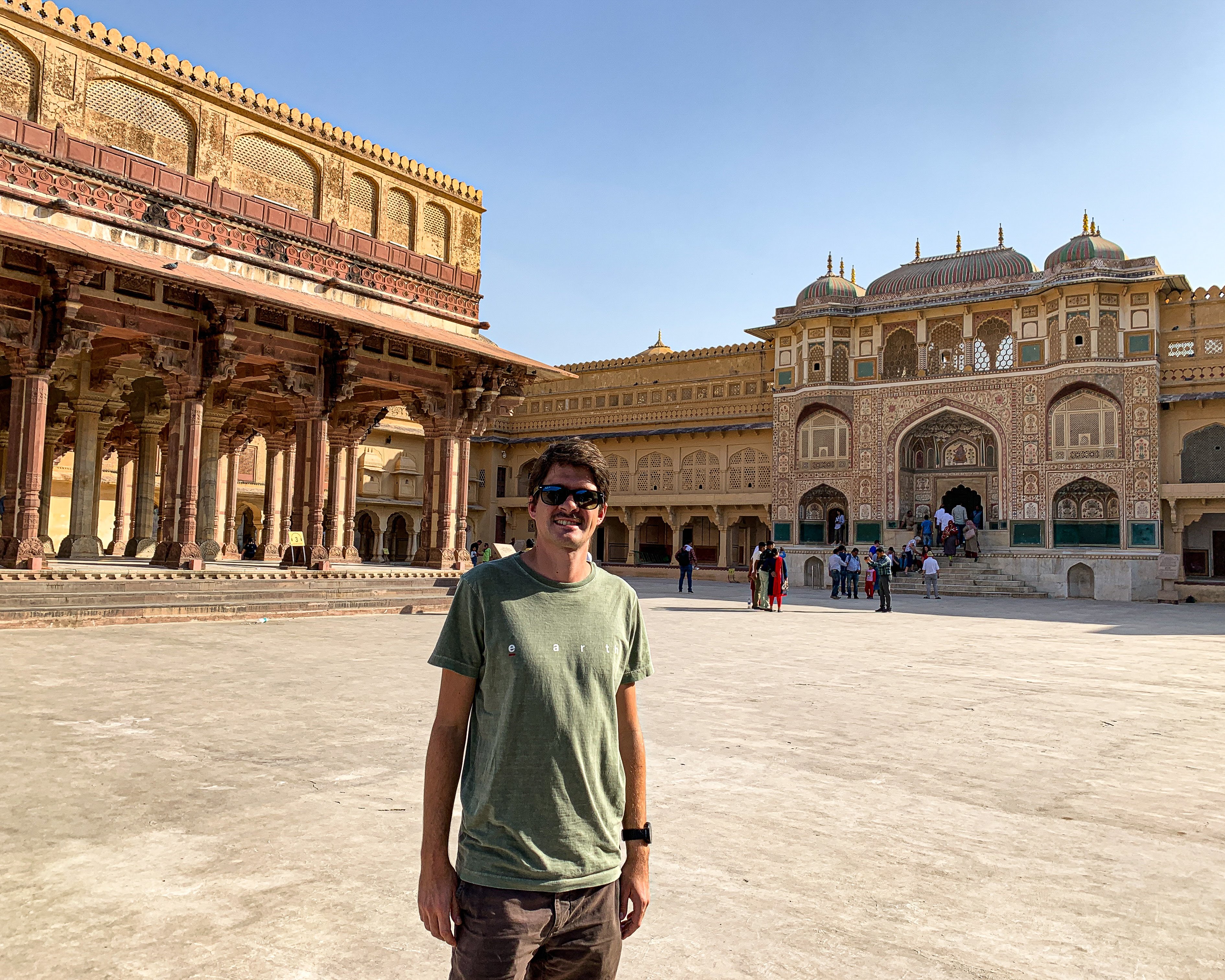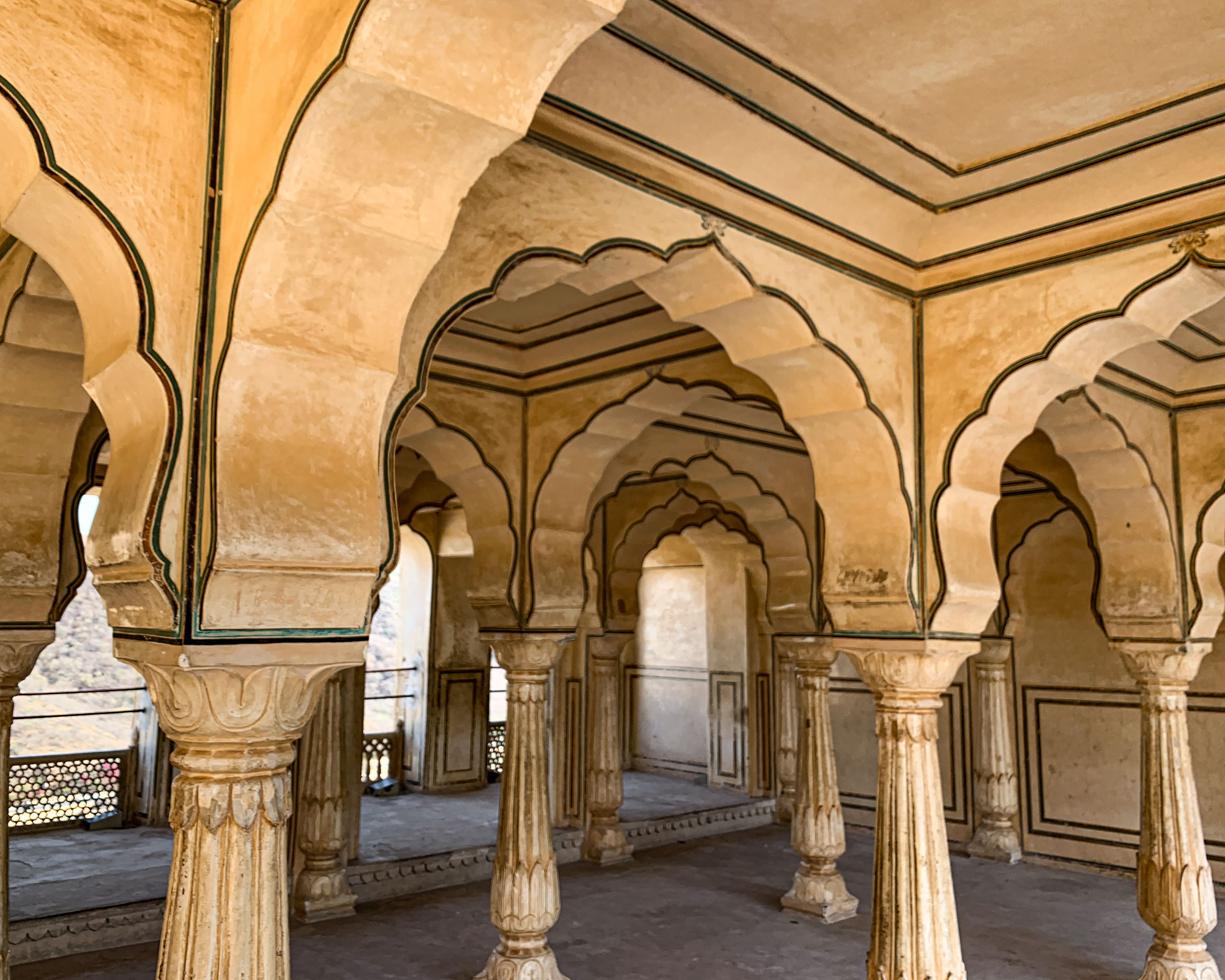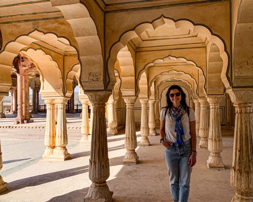 Como tínhamos pouco tempo e é fácil “se perder” nos vários labirintos do Forte, decidimos contratar um guia para nos levar às principais atrações. Dentre os destaques, estão a área conhecida como Diwan-e-Aam (ou Hall das Audiências Públicas) com suas dezenas de pilares em mármore; a Ganesh Pol (uma porta enorme decorada com mosaicos coloridos); e o Sheesh Mahal (ou Hall dos Espelhos) que, como o nome já diz, é decorado com vidros espelhados de origem belga e já foi a residência da família real de Jaipur. 🤩