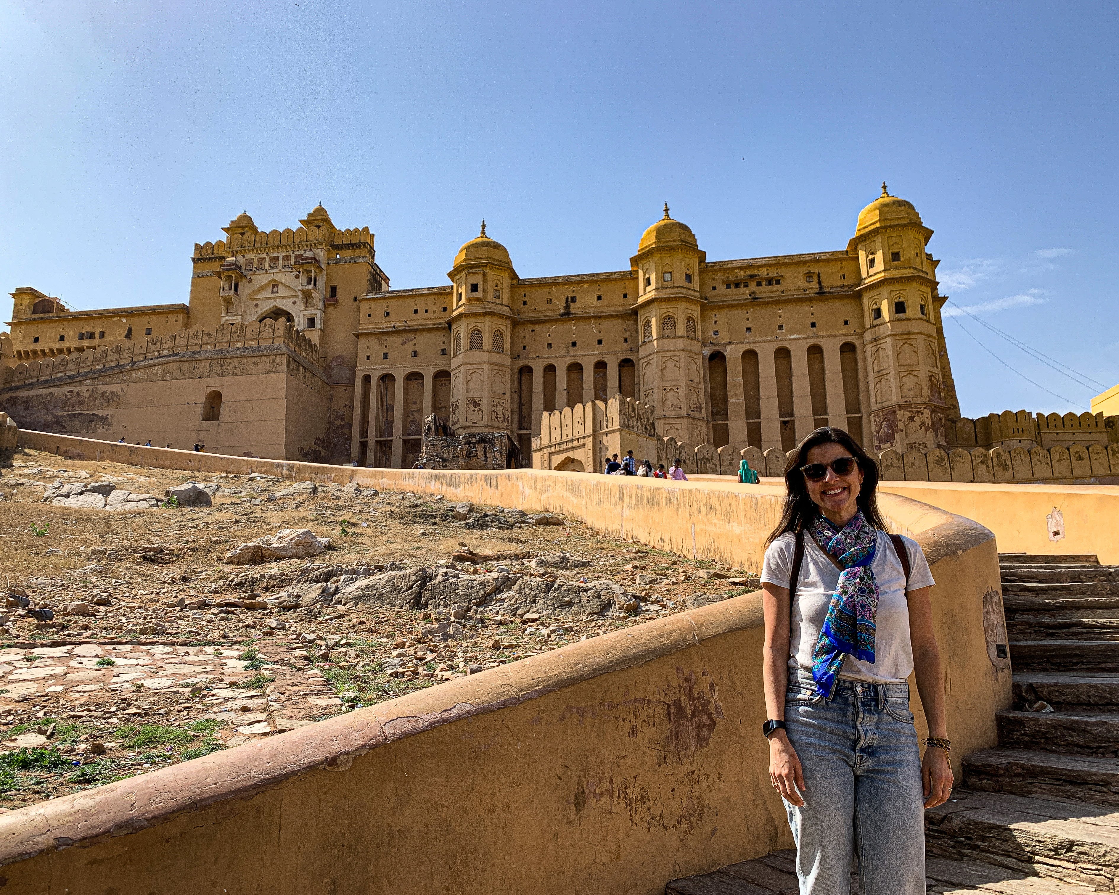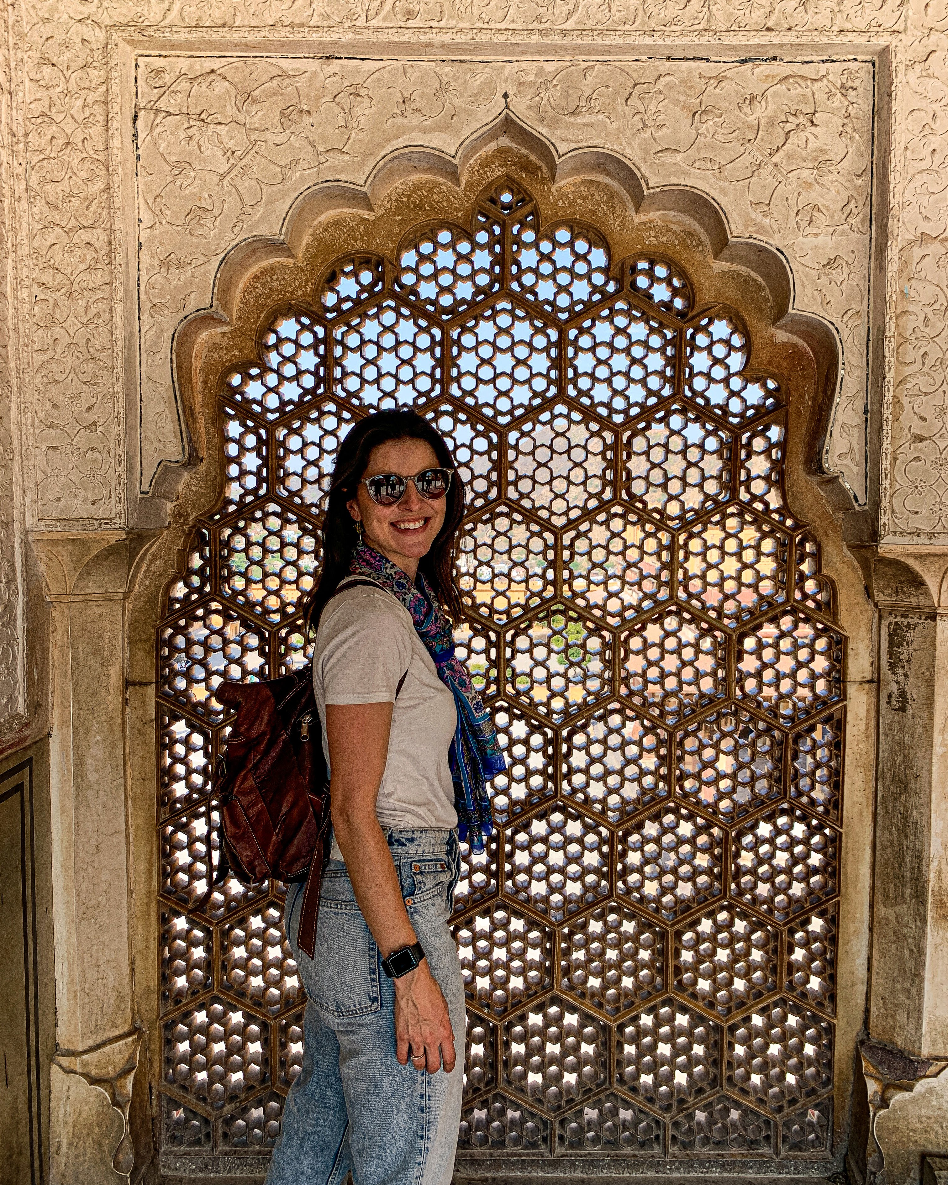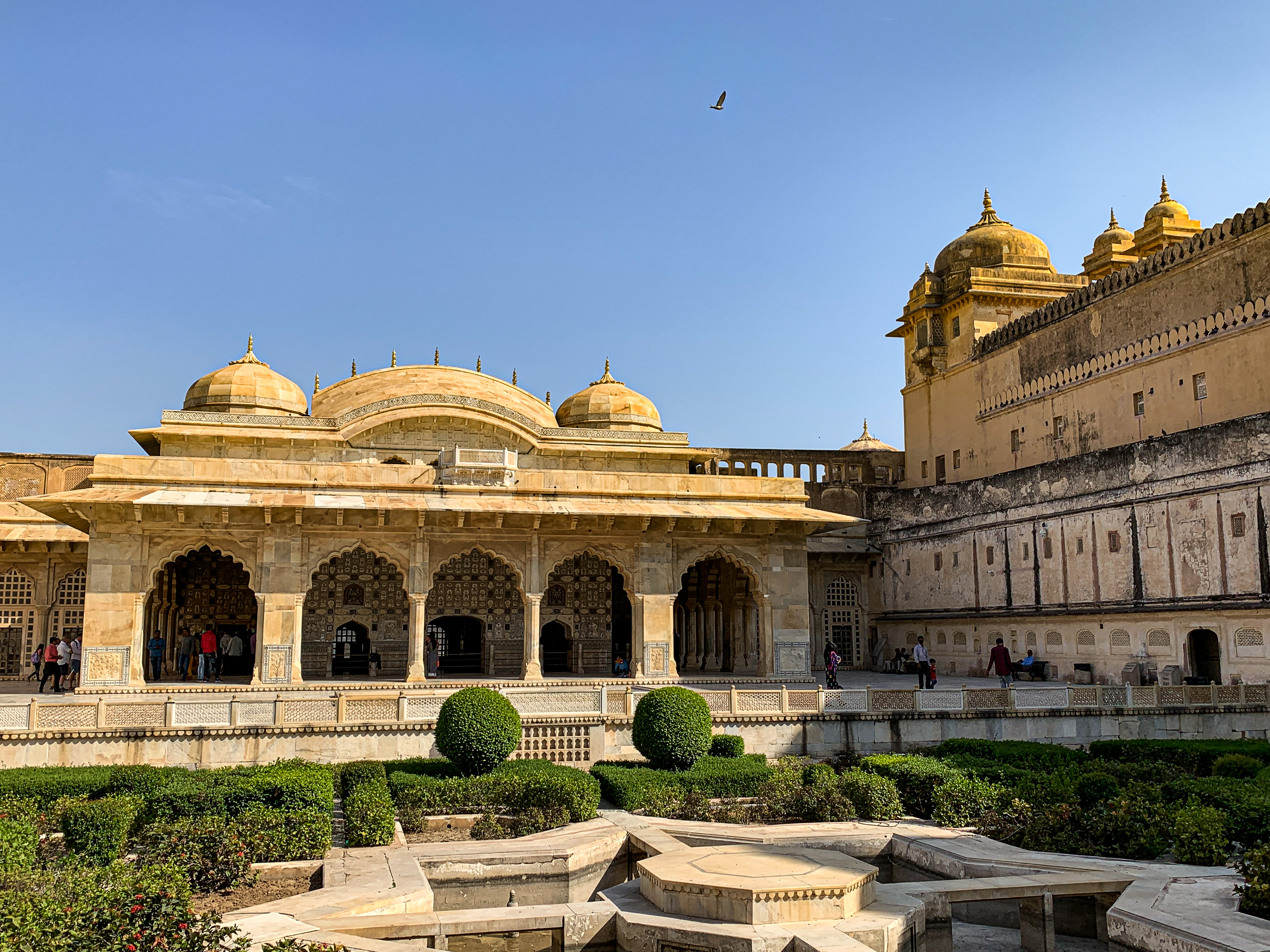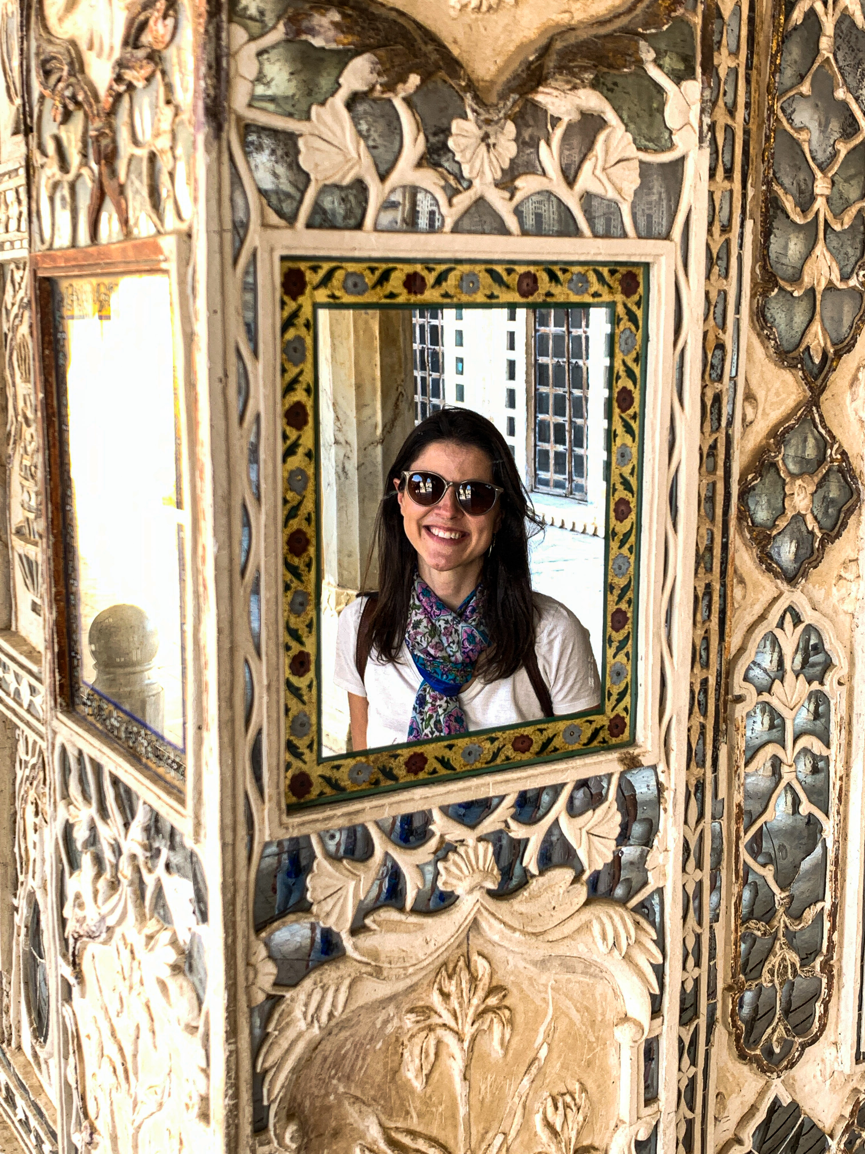 Como tínhamos pouco tempo e é fácil “se perder” nos vários labirintos do Forte, decidimos contratar um guia para nos levar às principais atrações. Dentre os destaques, estão a área conhecida como Diwan-e-Aam (ou Hall das Audiências Públicas) com suas dezenas de pilares em mármore; a Ganesh Pol (uma porta enorme decorada com mosaicos coloridos); e o Sheesh Mahal (ou Hall dos Espelhos) que, como o nome já diz, é decorado com vidros espelhados de origem belga e já foi a residência da família real de Jaipur. 🤩