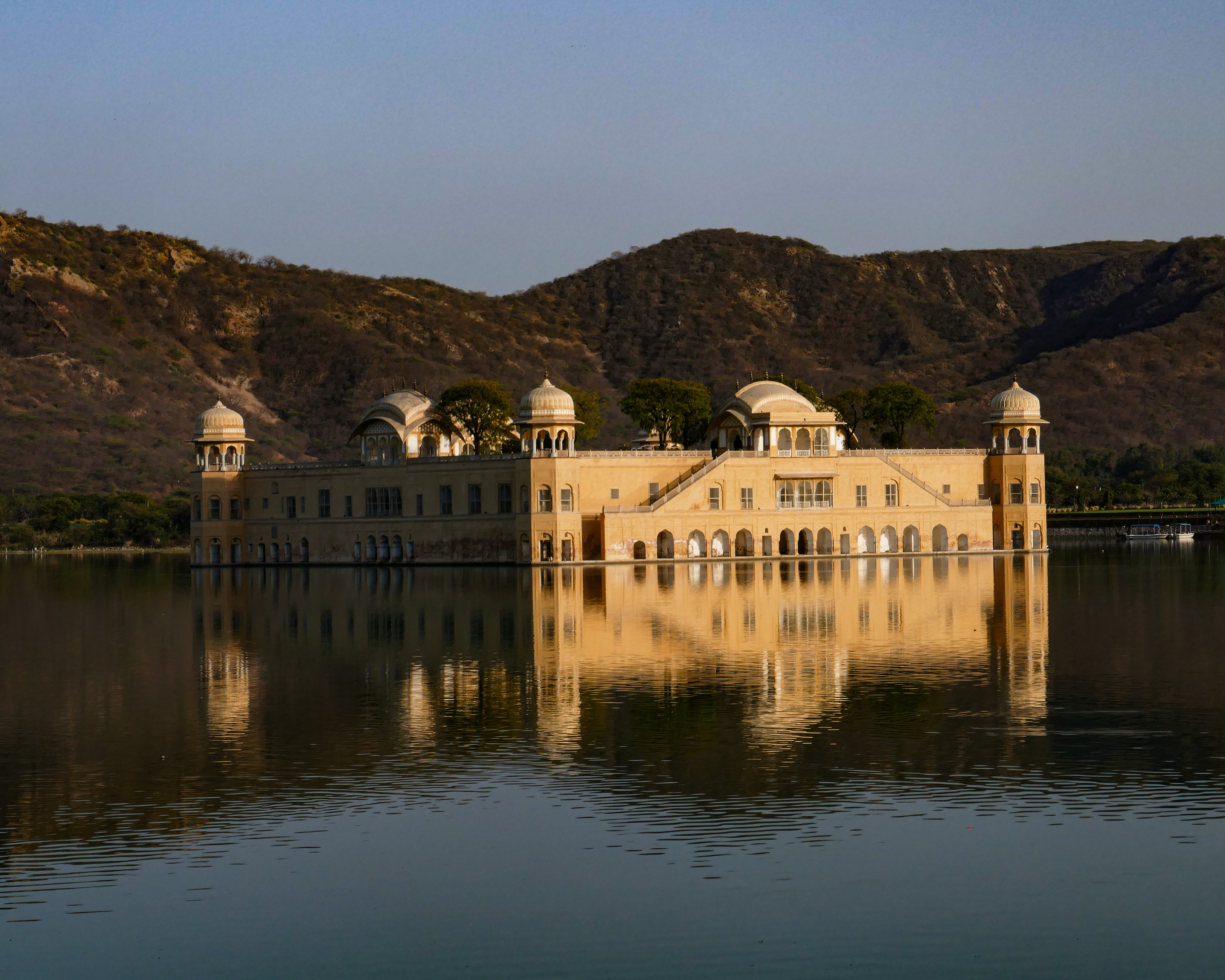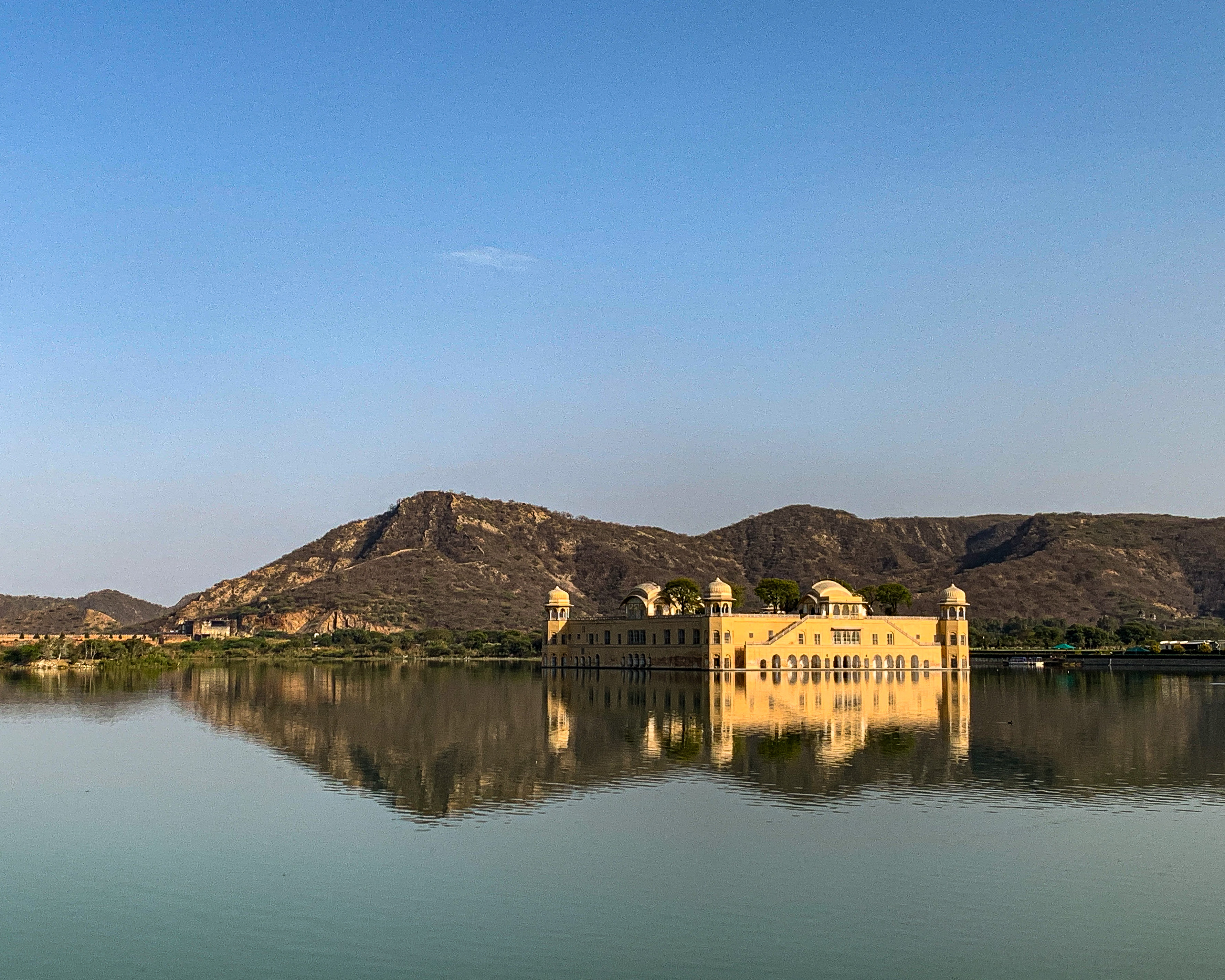 Pegamos um tuktuk e fomos até o Jal Mahal ou Palácio da Água. Esse Palácio fica no meio de um lago, literalmente, e o acesso até ele é proibido, mas a vista do conjunto palácio-lago é incrível. O reflexo da luz na água no fim do dia deixa a paisagem ainda mais especial e rende ótimas fotos. 🌅