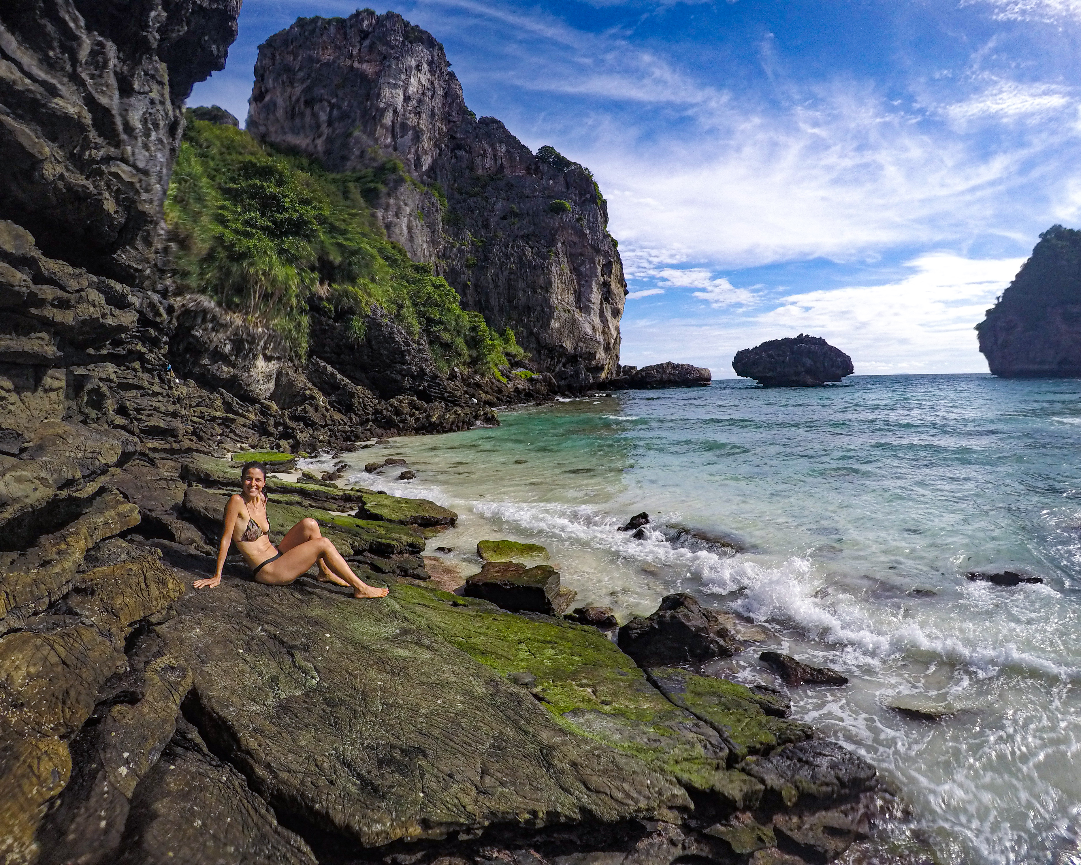 Já no meio da tarde, fizemos uma trilha partindo da nossa pousada até Nui Beach. Foram cerca de 2,5km, uns 40 minutos de caminhada sob um sol bem quente, mas a praia, que é considerada uma das mais lindas de Phi Phi Don, é mesmo incrível e estava deserta. Além do mar, nos divertimos também nas piscinas naturais que se formam nas pequenas cavernas de pedra. Infelizmente nessa praia vimos também muito lixo, que certamente veio do mar, afinal os turistas não passavam por ali há um bom tempo, deixando ainda mais evidente o quanto é necessário elaborar e executar um completo plano de recuperação e preservação para que Phi Phi permaneça linda por muitos e muitos anos. 😕