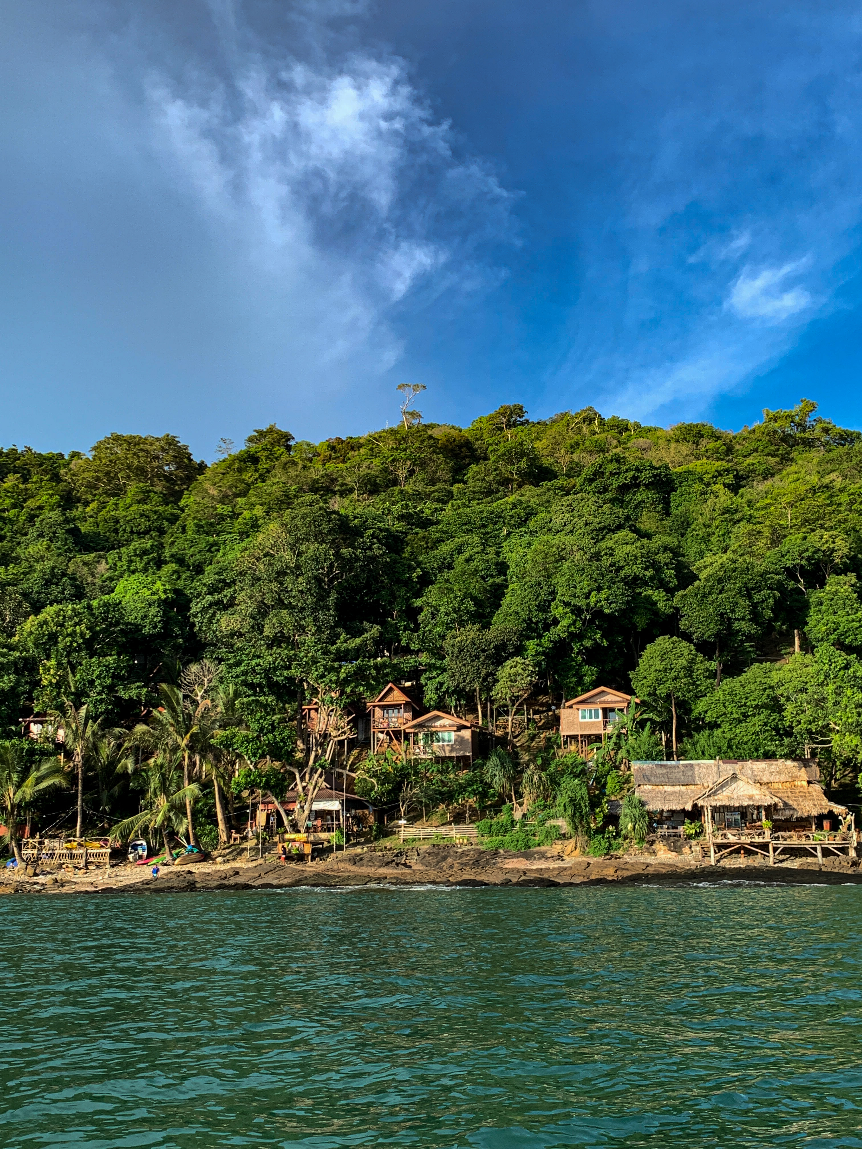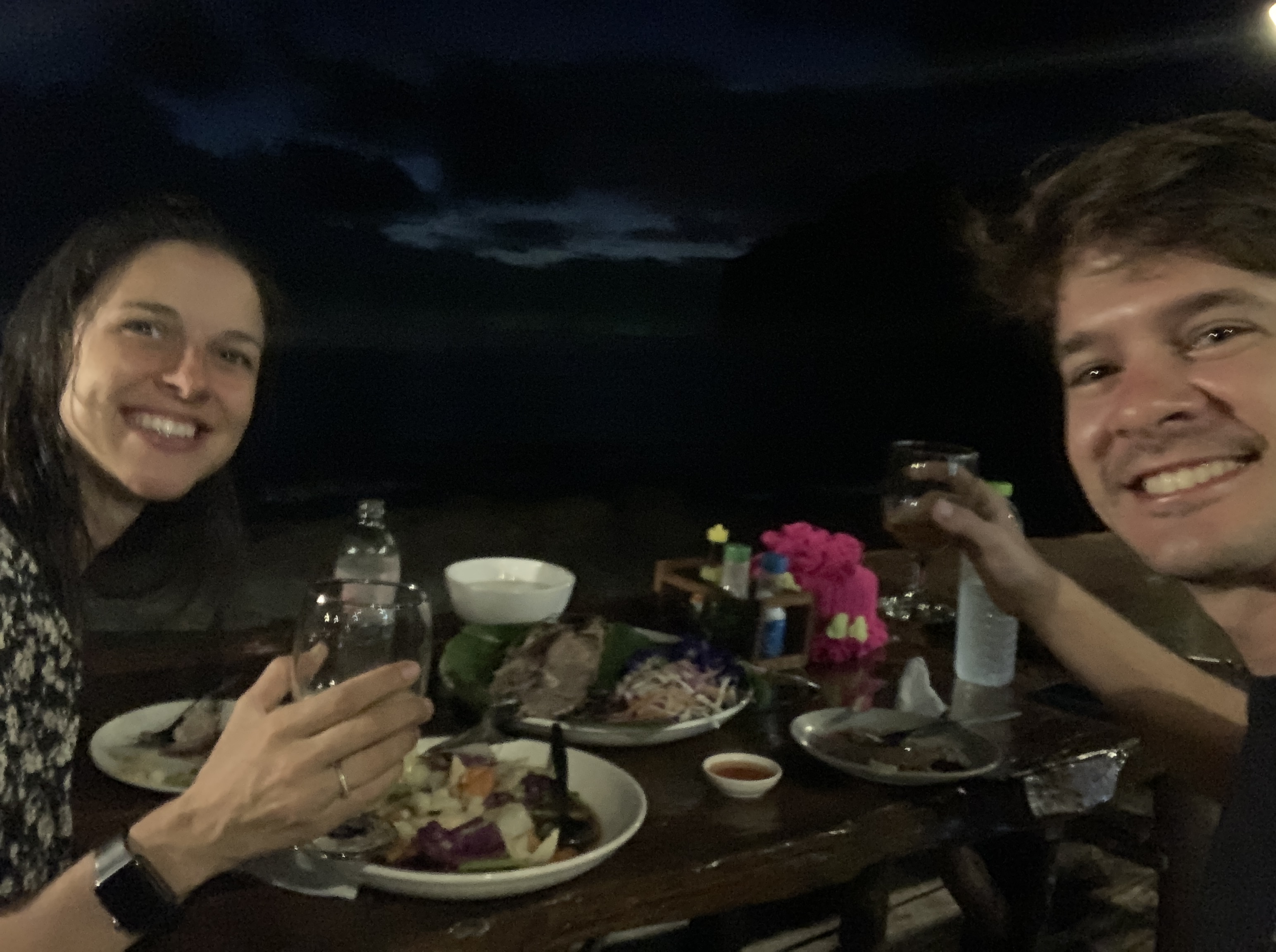 Como éramos os primeiros turistas na pousada em meses, eles não tinham tido tempo de comprar muita coisa pro café da manhã e nos perguntaram se topávamos tomar um café da manhã estilo Thai. Concordamos na hora e, sentados em uma mesa à beira-mar, comemos sopa de arroz com legumes. E assim nos sentimos cada vez mais tailandeses… 😅