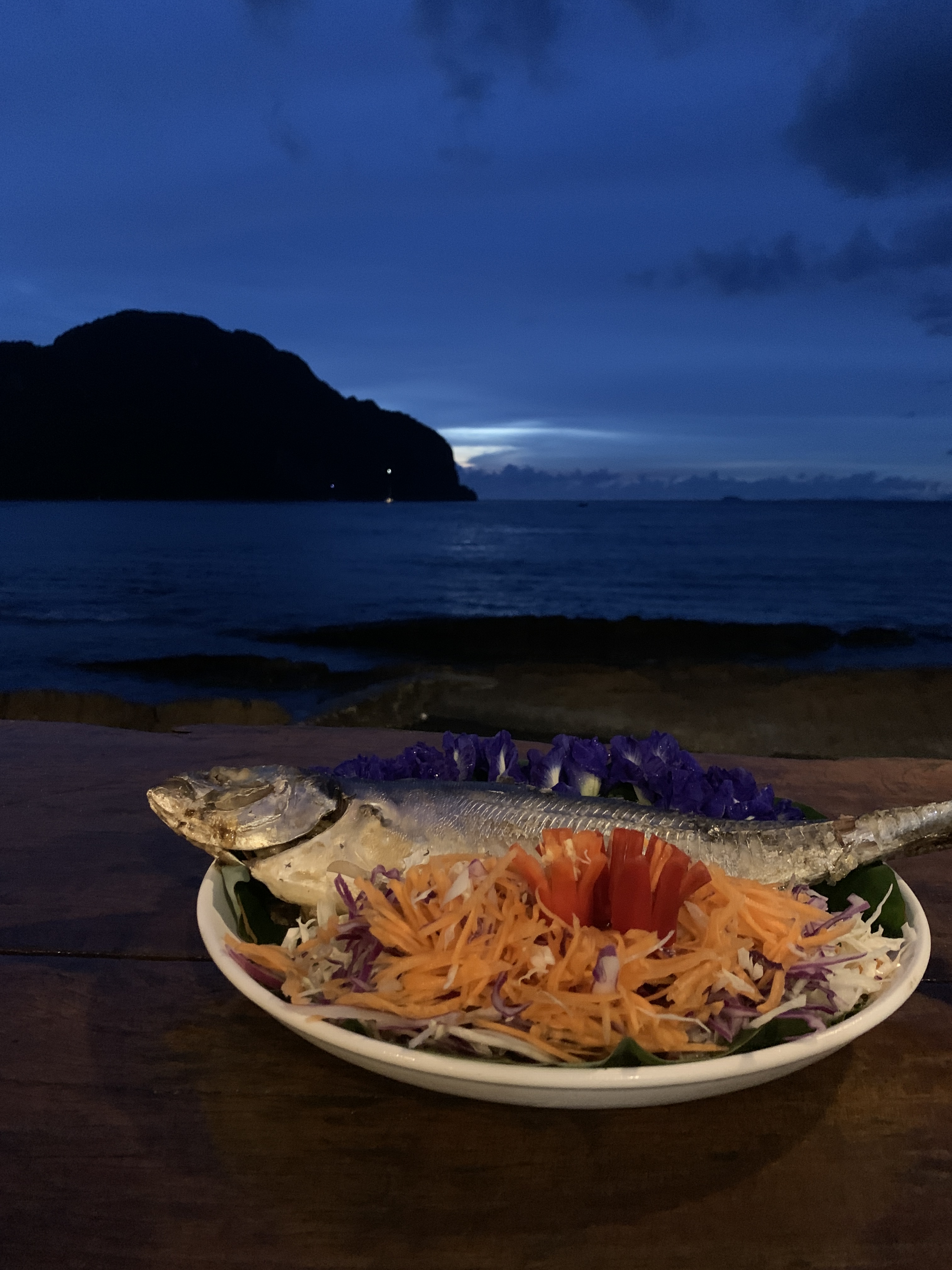 Antes de voltarmos para Phi Phi Don, ainda tivemos uma parada para fazer snorkel. Como o local era fundo, o ponto era mais atrativo para mergulho, mas ainda assim pudemos acompanhar vários cardumes e curtir mais um banho nesse mar delicioso. Depois de um dia cheio de atividades, voltamos para a pousada onde nosso jantar já estava sendo preparado: peixe fresquinho e grelhado! Que dia incrível, Phi Phi é mesmo apaixonante! Sem o excesso de visitantes, pudemos apreciar sua beleza e ainda curtir um ambiente calmo e tranquilo, uma visita completamente diferente. 😍
