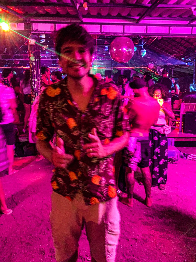 Apesar da famosa Full Moon Party não estar acontecendo, já era permitido fazer festas devido ao controle da situação do país. Nossos amigos encontraram uma festa chamada Lost Paradise e o James já ficou todo animado. Para chegar na festa era preciso pegar um barco e depois de uns 15 minutos finalmente estávamos no tal paraíso perdido. Como estávamos com amigos a festa até que foi legal, mas a música naquele tunts tunts eterno não era das mais empolgantes pra nós, então não duramos muito tempo, hehehe 😅