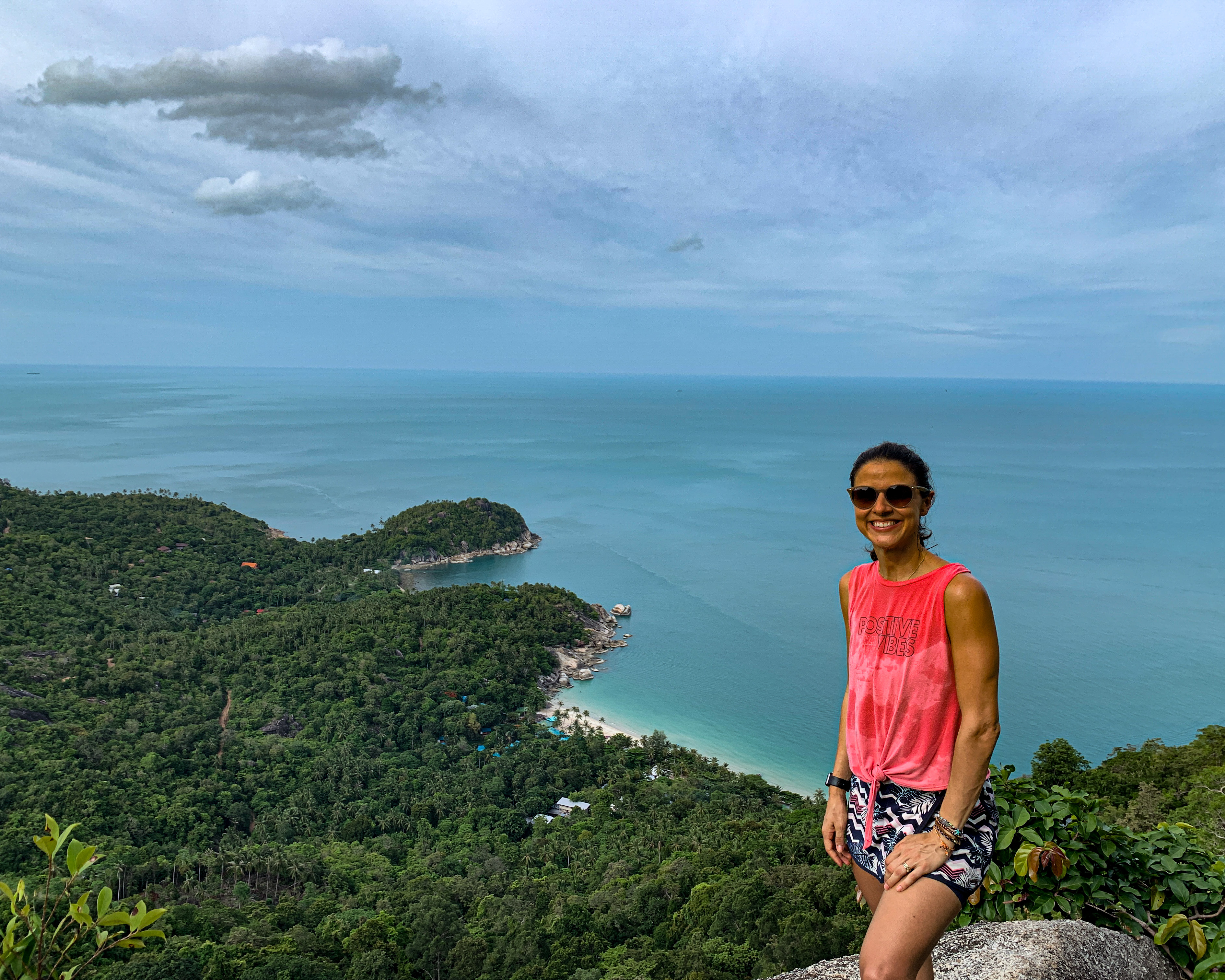 No período da tarde fizemos um dos principais hikkings de Koh Phangan, para acessar praias onde só é possível chegar a pé ou de barco. Estacionamos nossa moto na praia de Haad Rim, onde começa a trilha. No meio da caminhada é preciso fazer um pequeno desvio para acessar o lindo mirante Haad Yuan, mas dali em diante é só seguir no embalo da descida até chegar na praia de mesmo nome. Depois de 4km e 1h15min de muito sobre desce, ao chegar em Haad Yuan tiramos os tênis e corremos pro mar. Com essa refrescante pausa, retomamos a trilha para fazer o último quilômetro até finalmente chegarmos na praia de Haad Wai Nam onde curtimos mais um delicioso banho de mar 🌊🏝😎