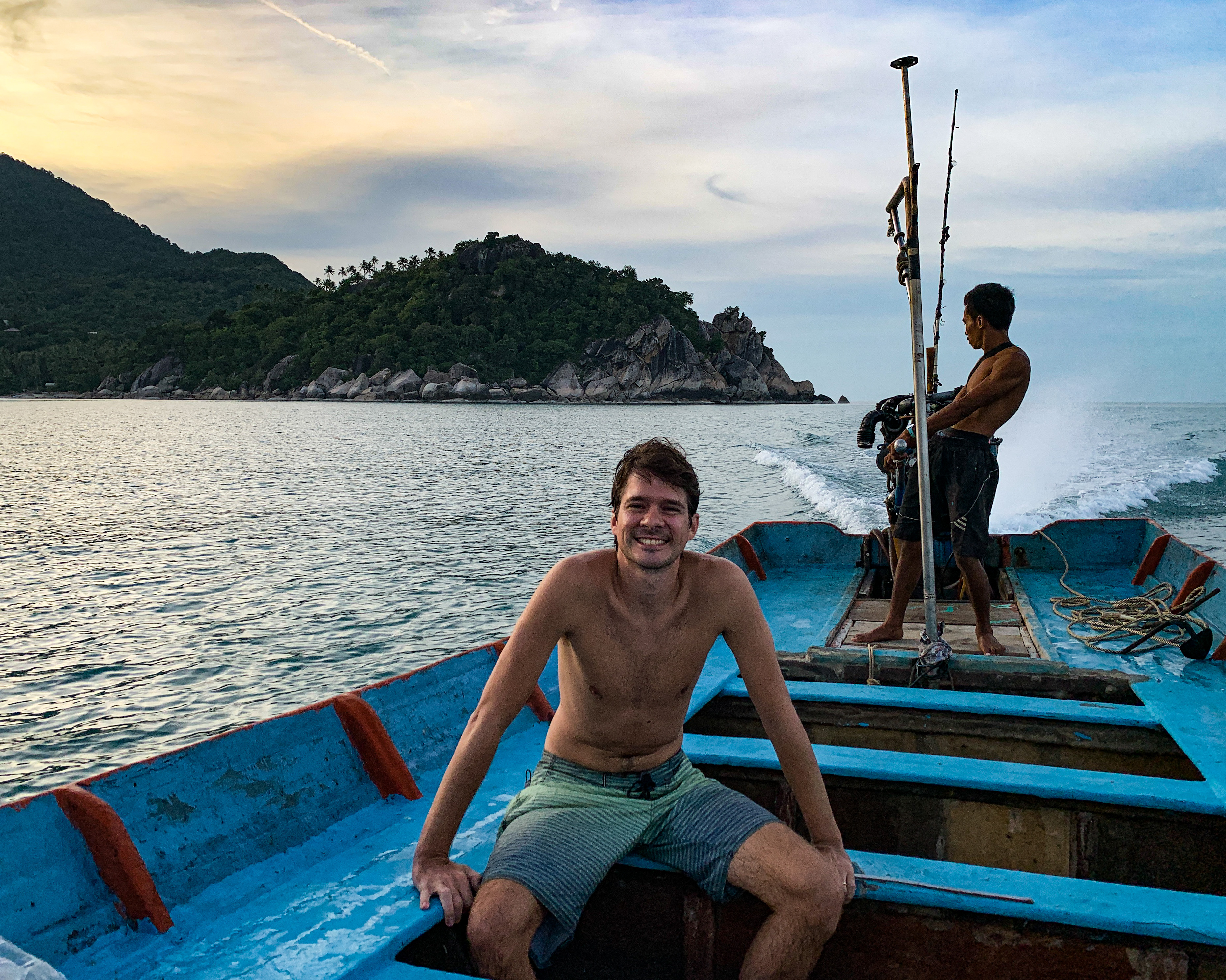 Para voltar de barco é só negociar com os barqueiros que estão sempre por lá e curtir assim o visual de outro ângulo. O trajeto de barco é rápido, em poucos minutos já estávamos de volta a Haad Rim, onde estava nossa moto. É nessa praia que ocorre a famosa Full Moon Party, que por precaução estavam suspensas, ainda que o país não registrasse mais casos de contaminação local. Mesmo assim, teve alguém que não pode perder a oportunidade de curtir um happy hour ali, o lindo visual e aquele fim de tarde pós trilha muito convidativos 😁🍻🍻