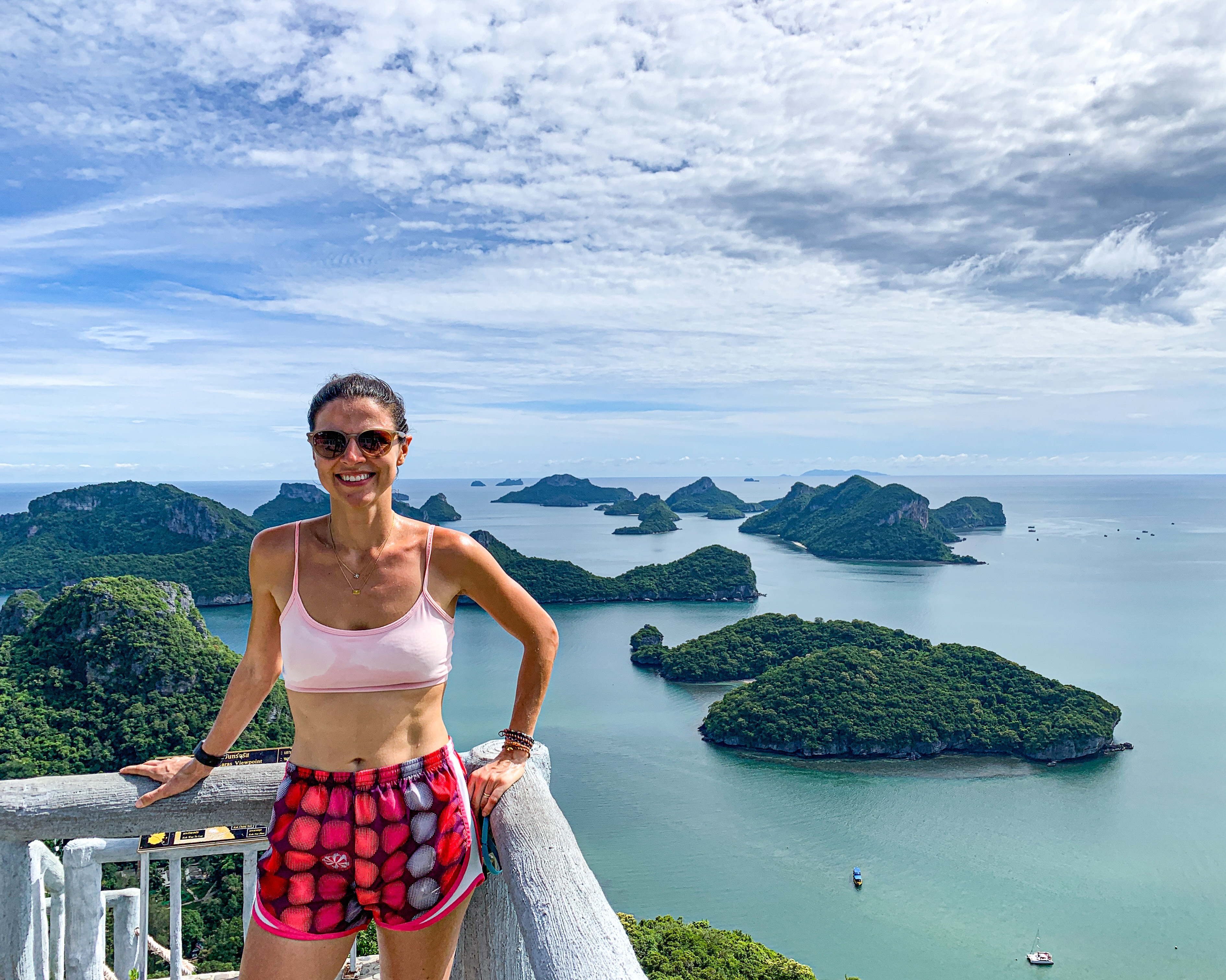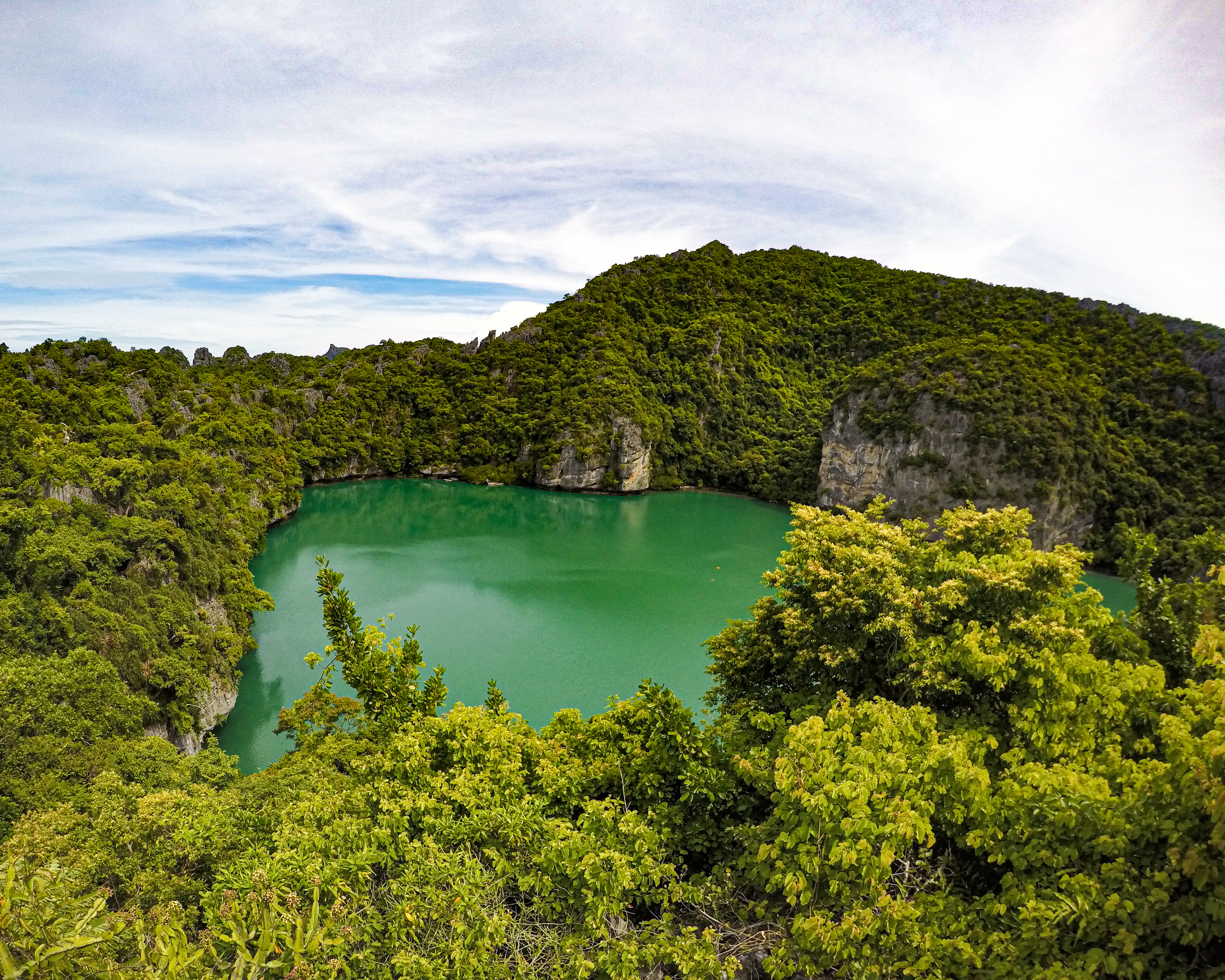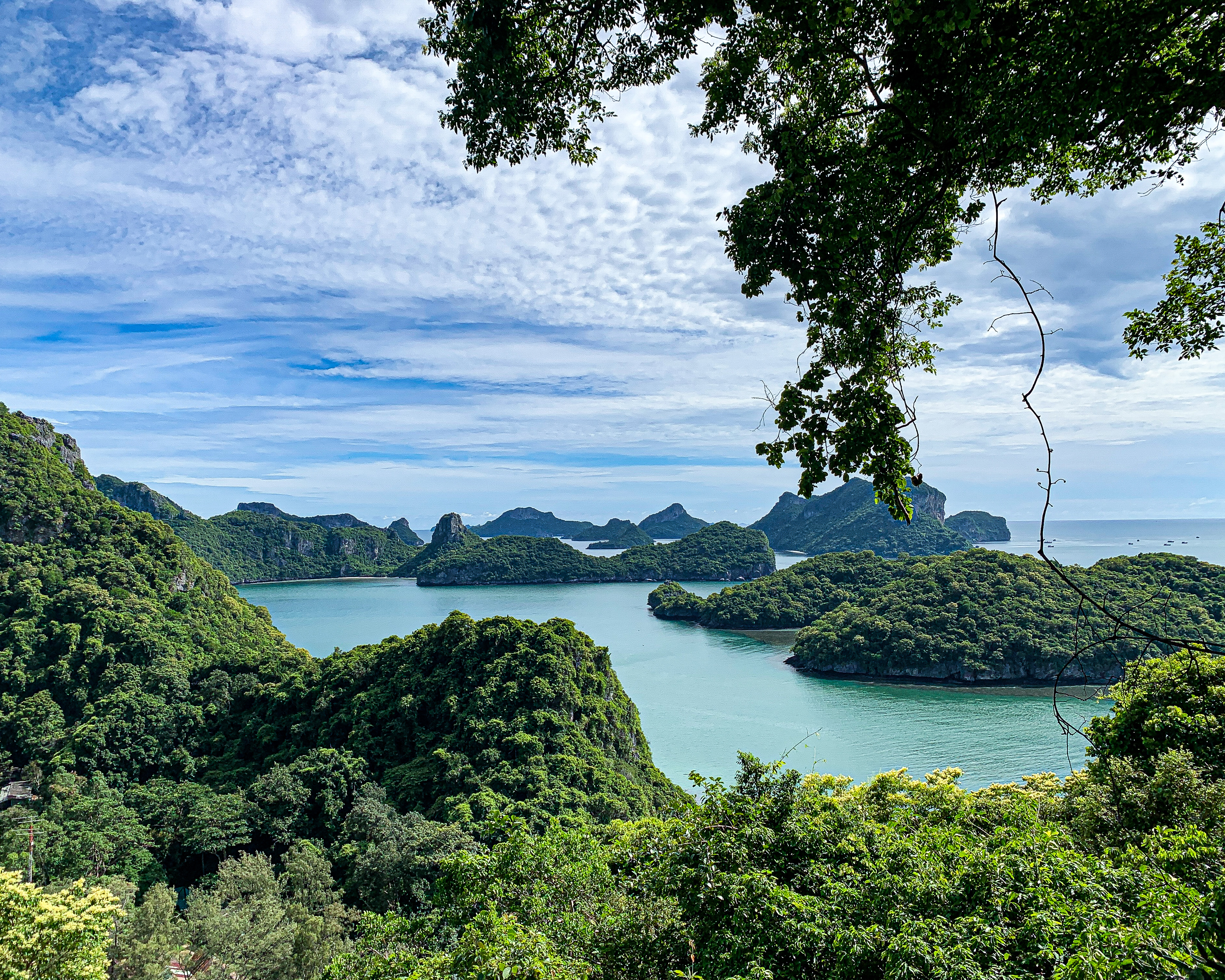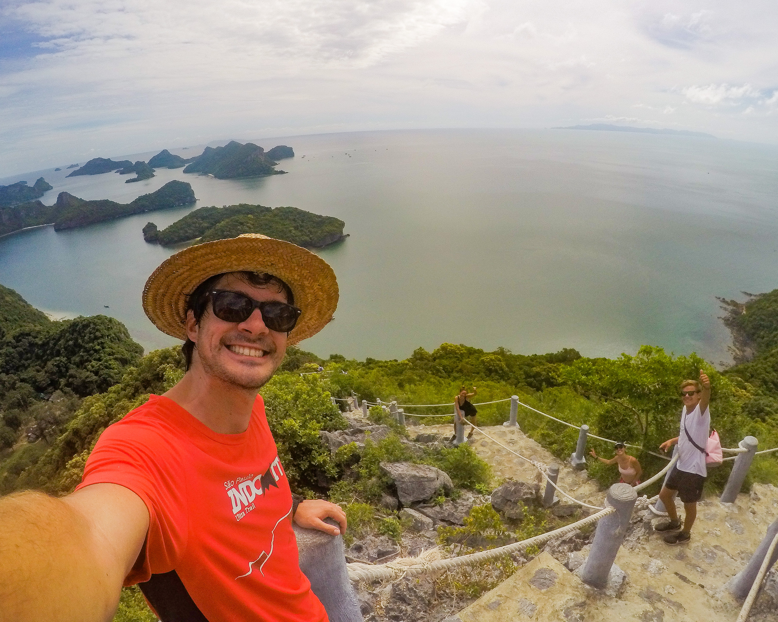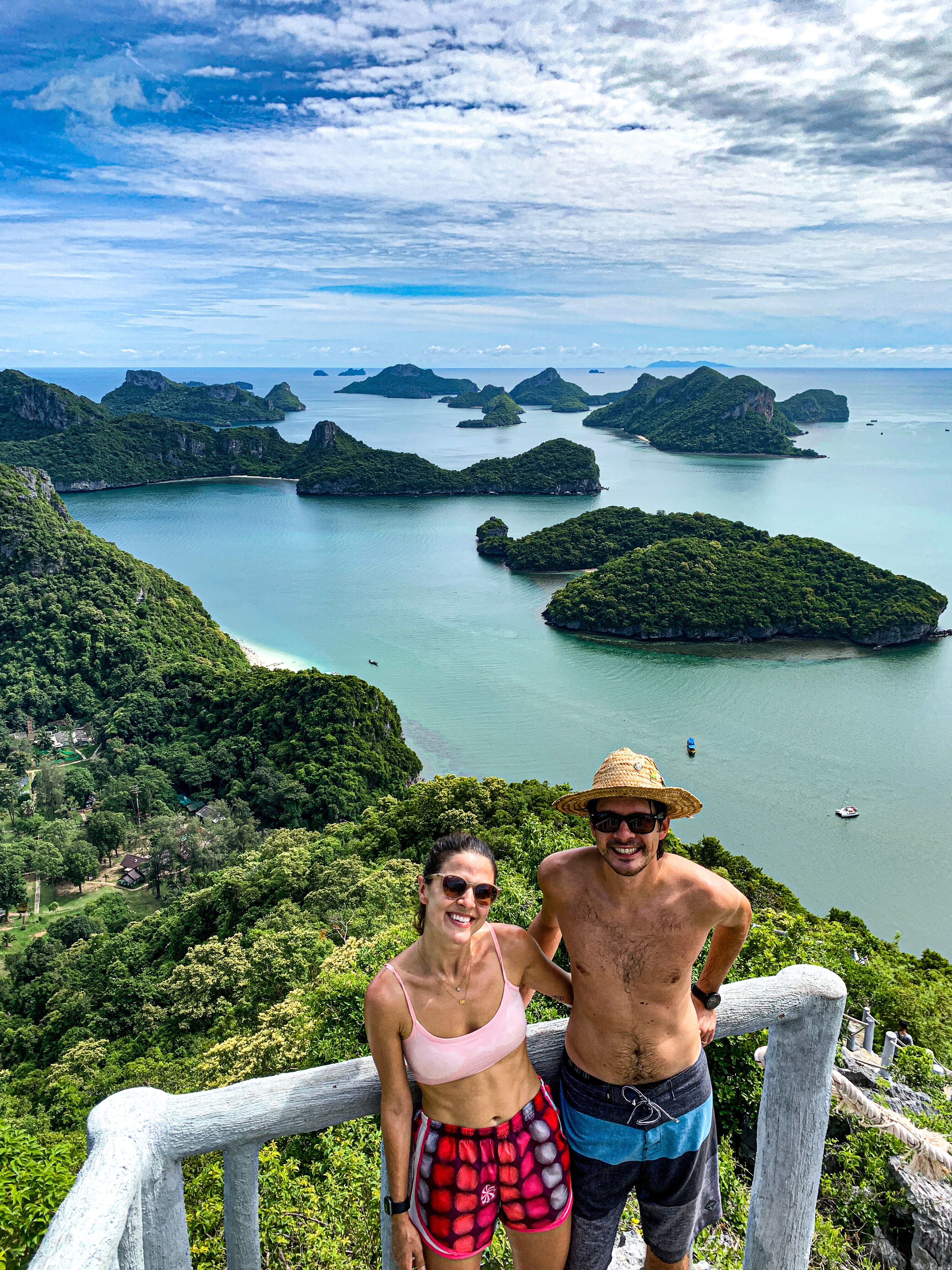 O parque nacional é composto por 42 ilhas, a maioria delas sem nenhuma estrutura ou qualquer intervenção humana. No segundo dia de passeio, fomos visitar a ilha de Mu Ko, onde existe uma certa estrutura, com banheiros e até cinco bungalows disponíveis para pernoite. A principal atração da ilha é o mirante, que fica a cerca de 200 metros acima do nível do mar. Apesar da subida sob um sol forte, o que tirou nosso fôlego foi a vista que se tem do Parque Nacional. 😱