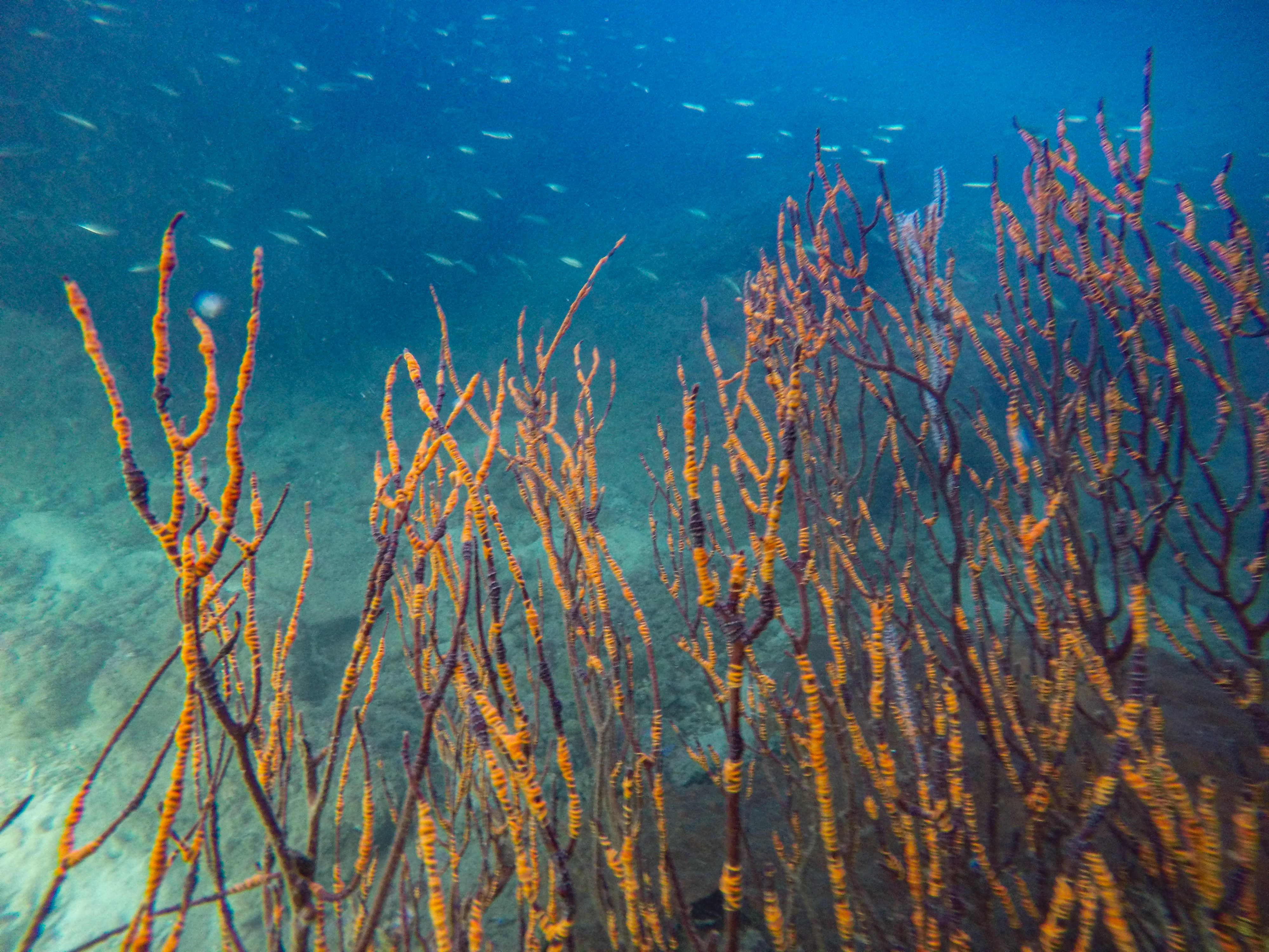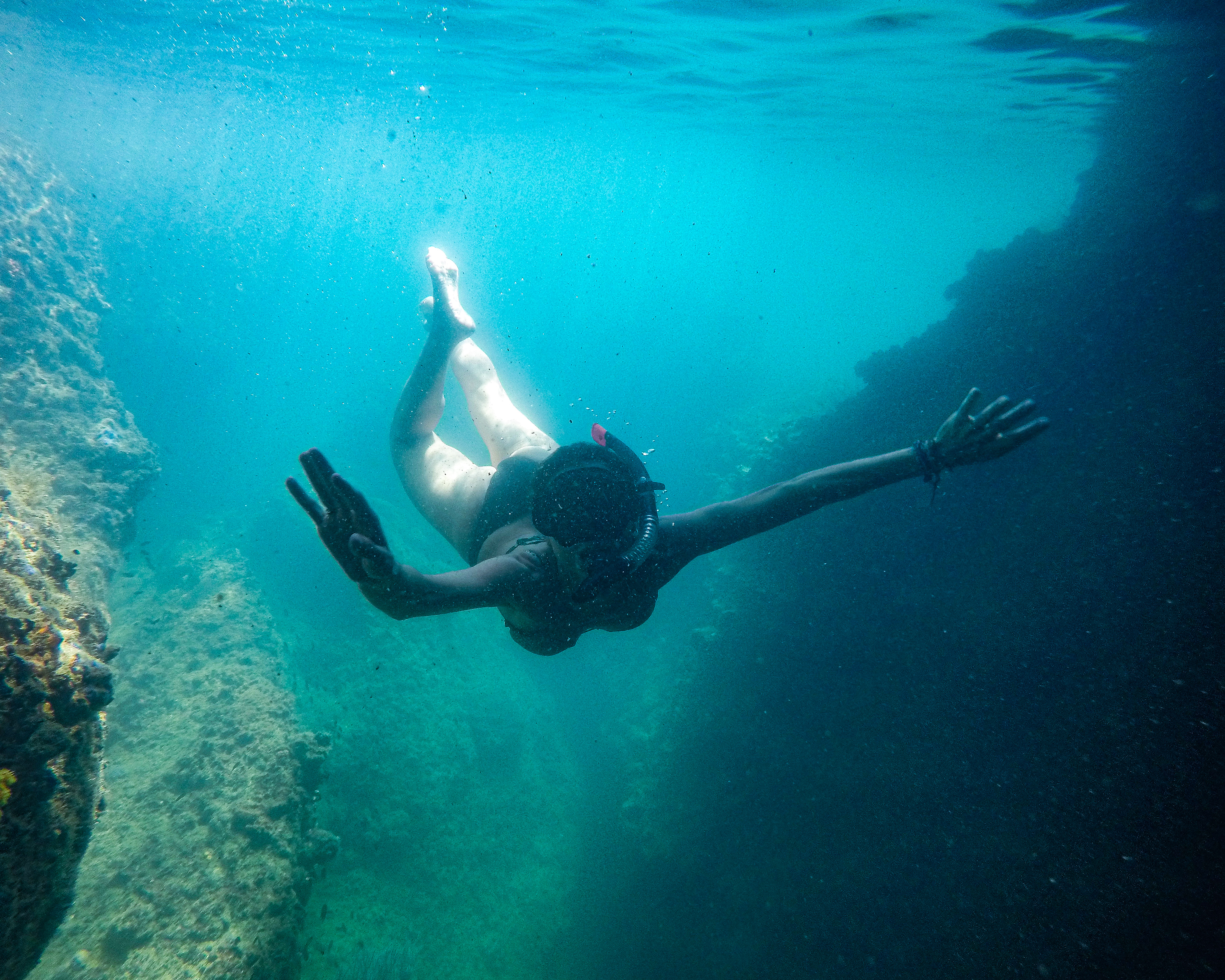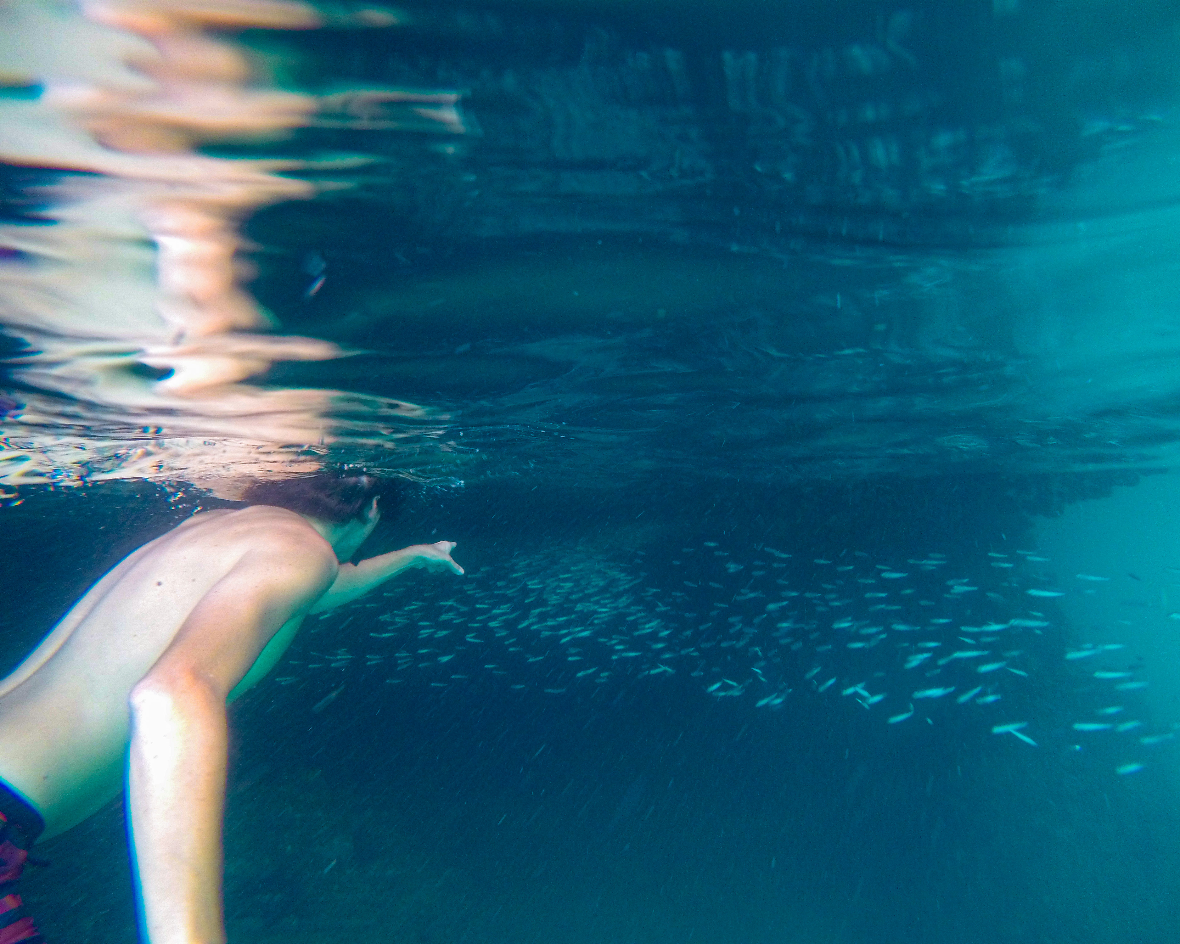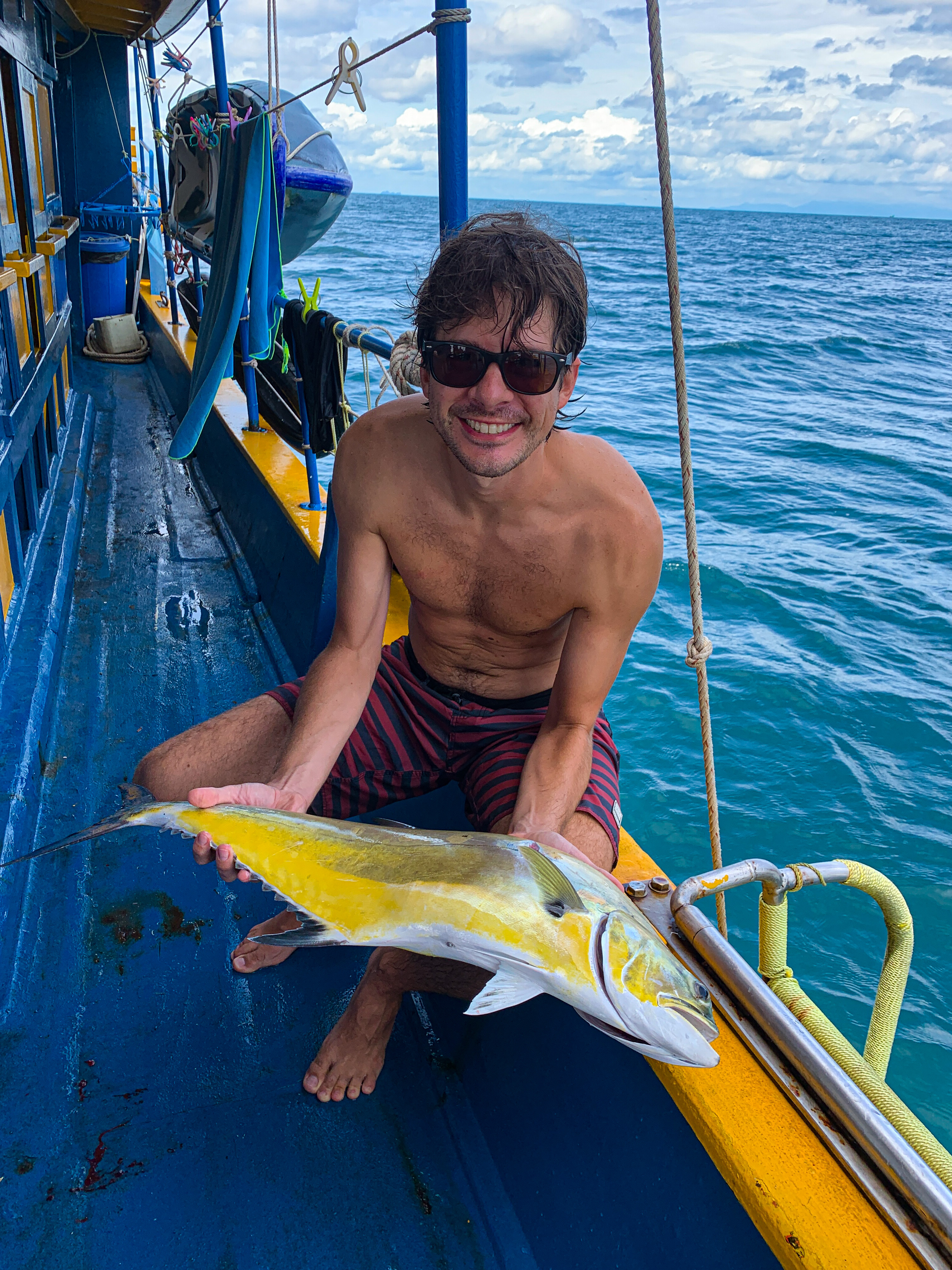 Depois de umas 2h de navegação, ainda antes de entrar na área protegida do Parque Nacional, paramos para fazer snorkel. O mar estava bem agitado, mas ainda assim vimos muitos cardumes por ali. O alemão, um dos convidados do dono do barco, aproveitou a quantidade de peixes para praticar pesca com arpão e pra nossa surpresa ele voltou pro barco com o peixão… 🎣😱😱😱