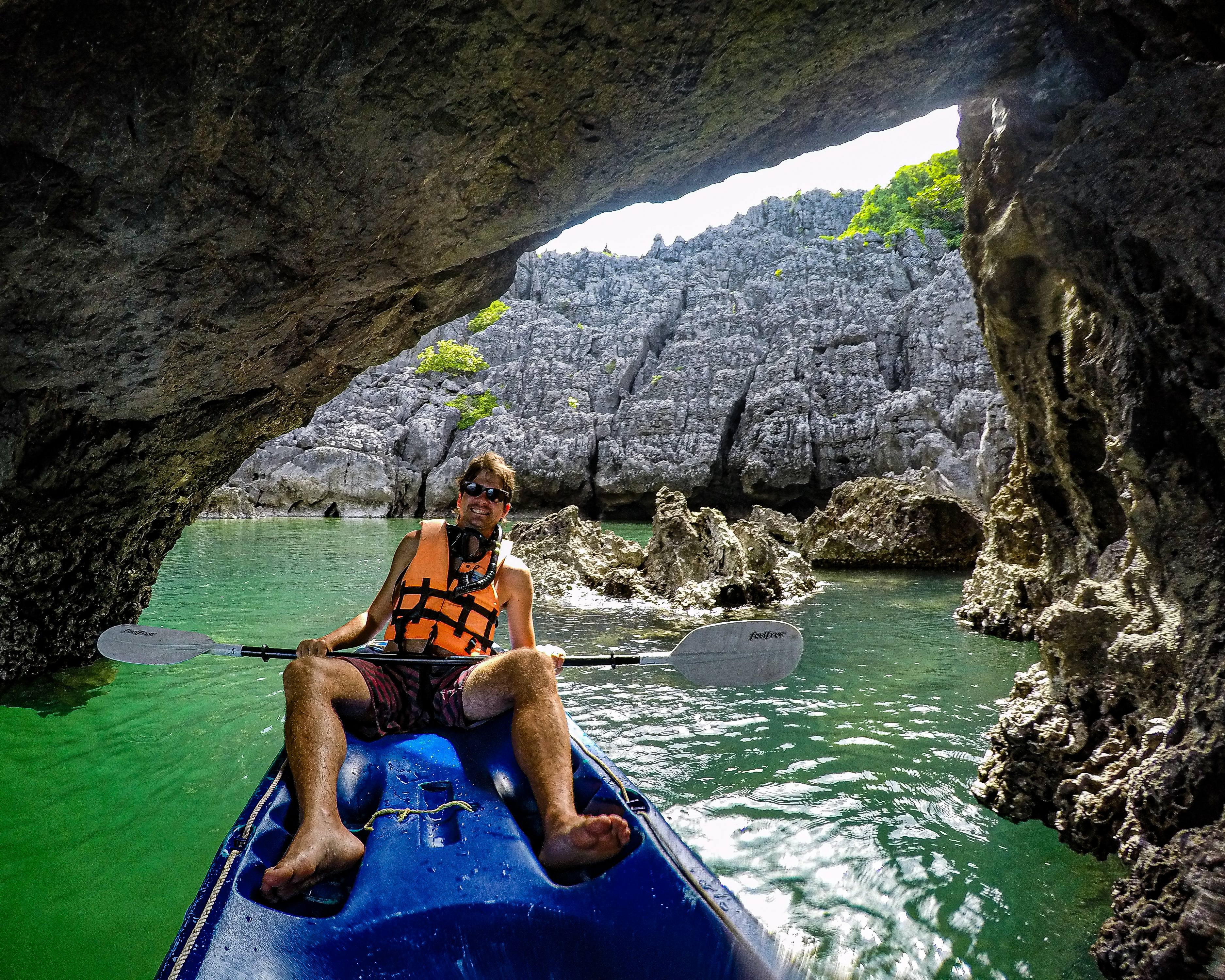 Com o jantar garantido, seguimos a navegação por mais algumas horas até adentrarmos na área protegida do Ang Thong, onde a pesca é proibida. Quando a embarcação parou, pegamos os caiaques e fomos explorar as cavernas do Parque Nacional com suas incríveis formações rochosas.